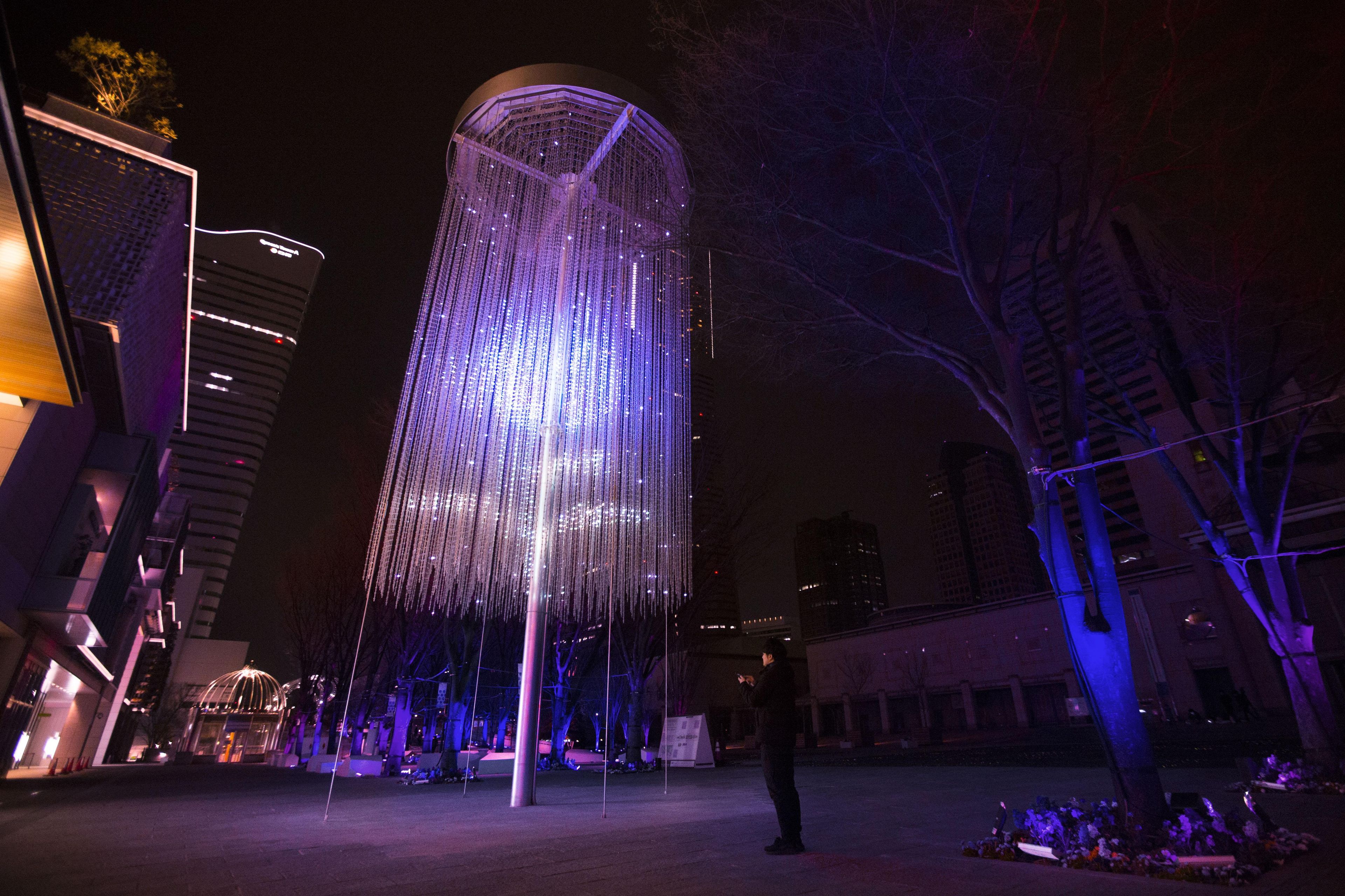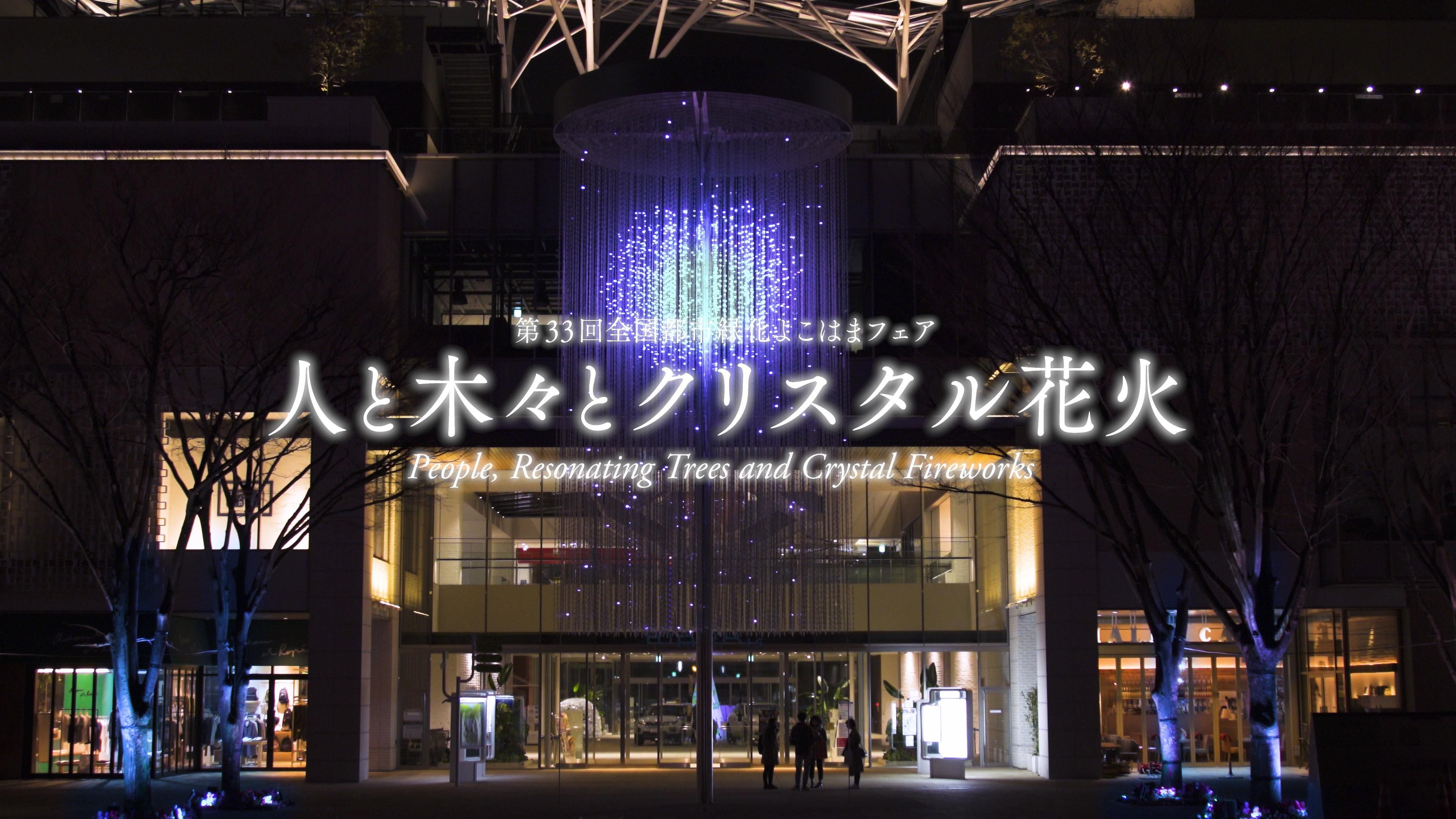 14m high 'teamLab Crystal Fireworks' - by selecting a firework on your smartphone, you can set off three-dimensional fireworks composed of numerous light points. In association with 'National Urban Greenery Fair Yokohama', there will in addition to fireworks, be three types of flowers; cherry, rose and tulip - gigantic blooming three-dimensional flowers composed of lights.