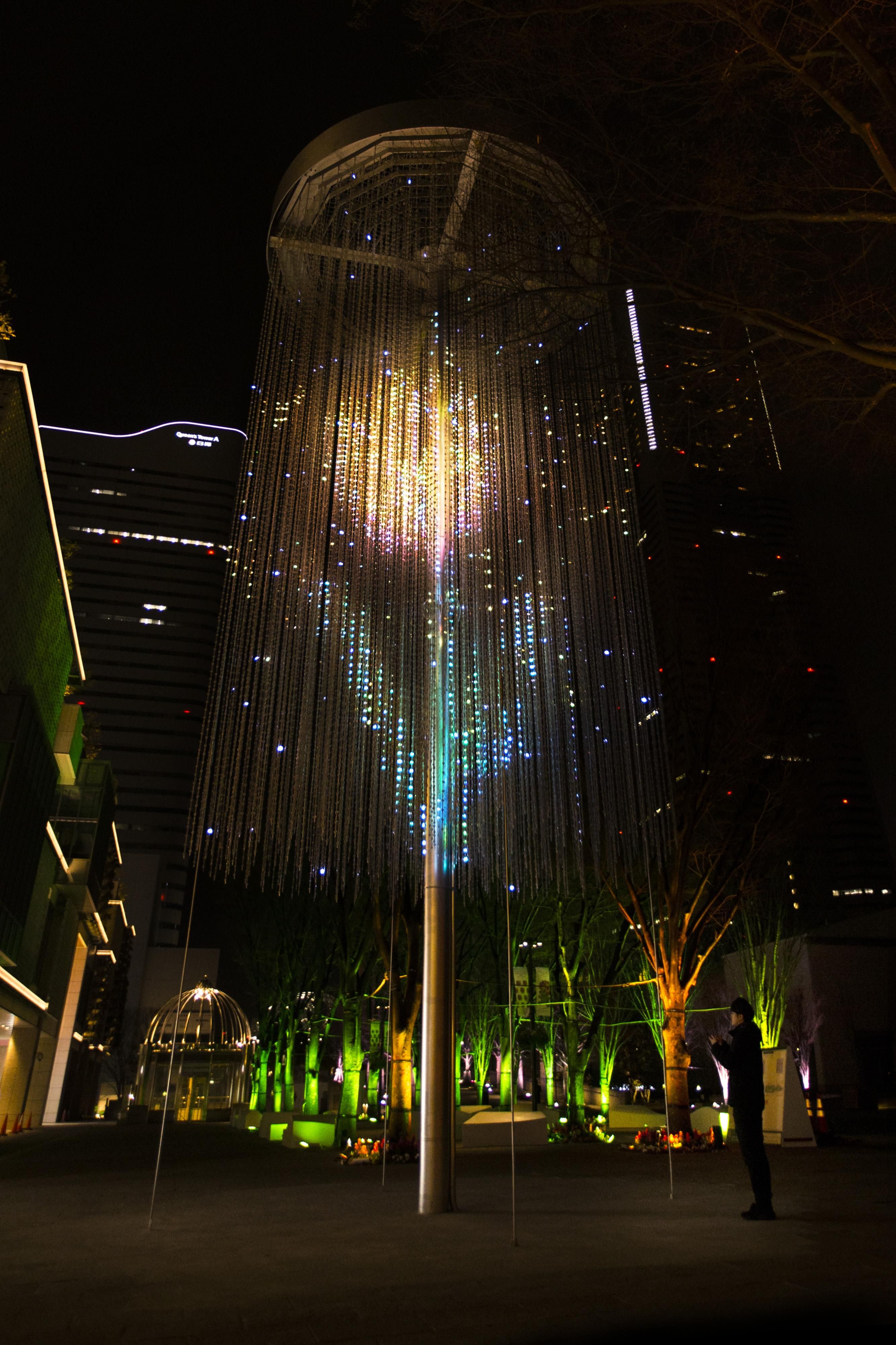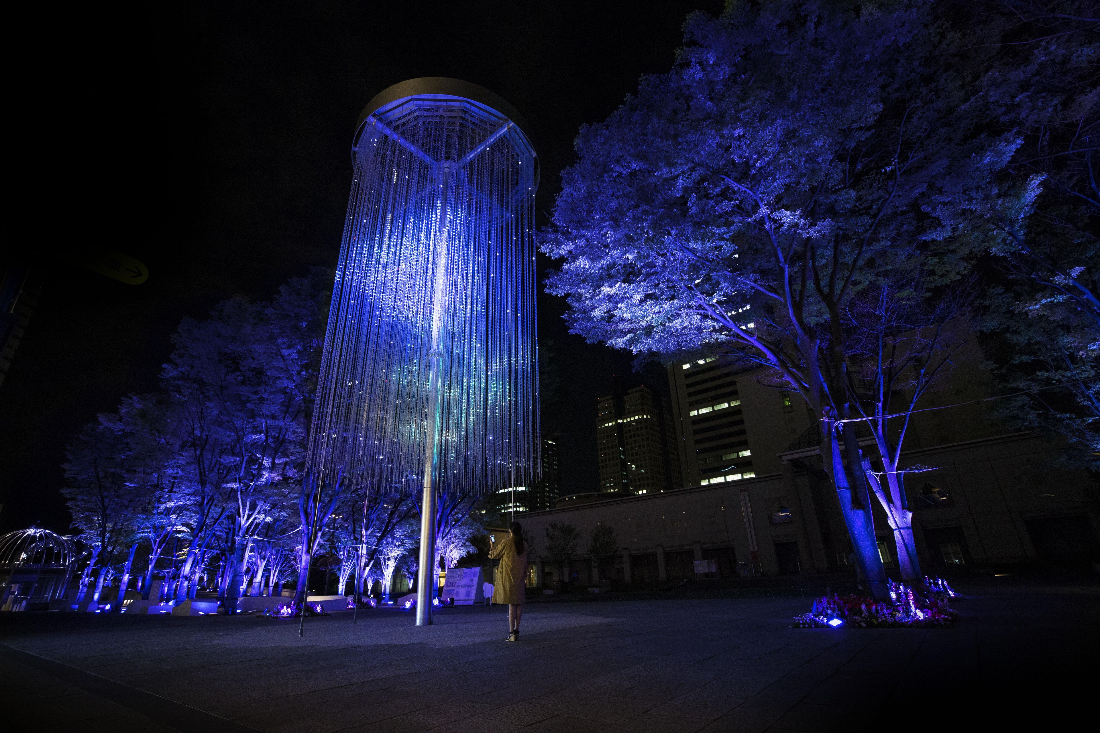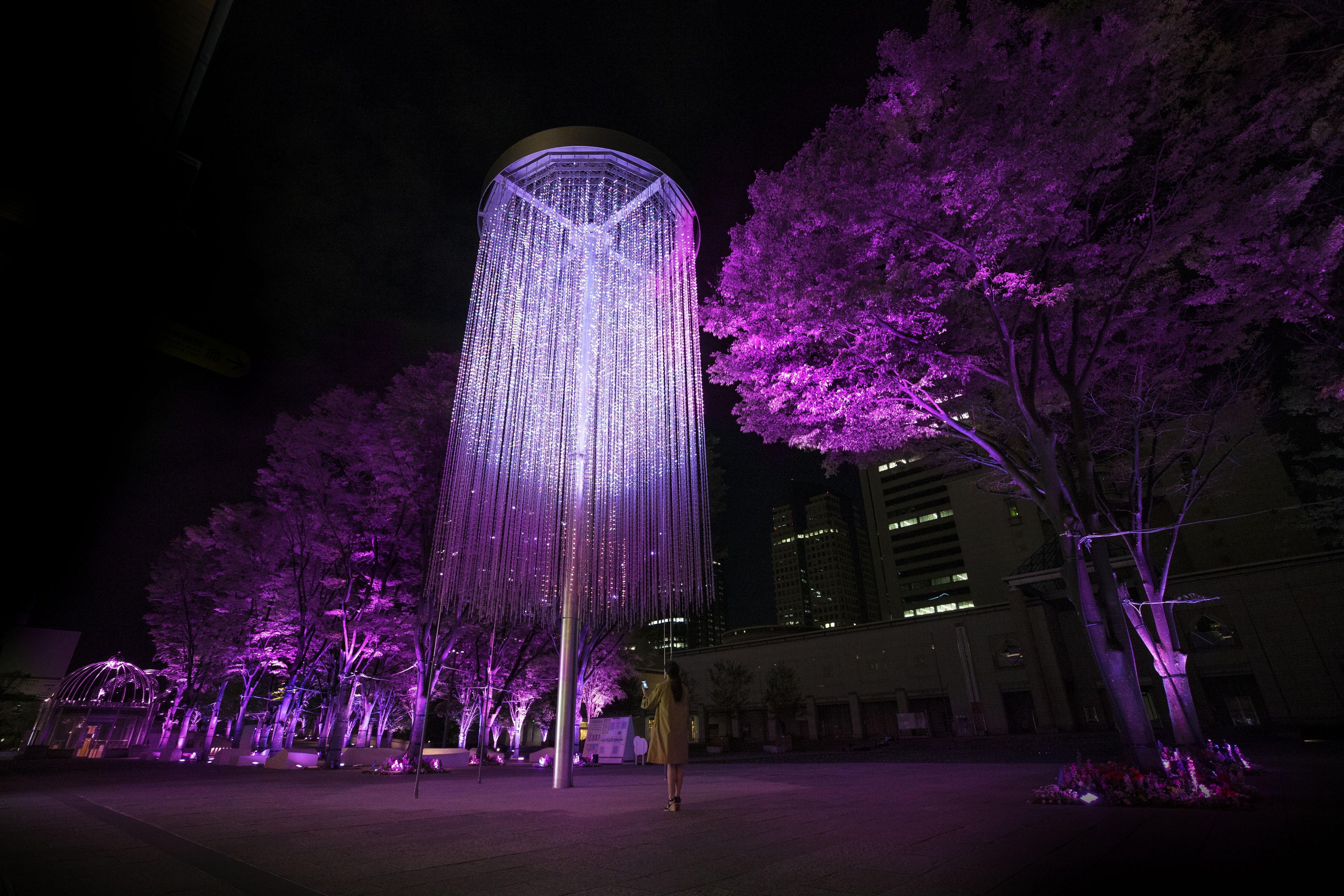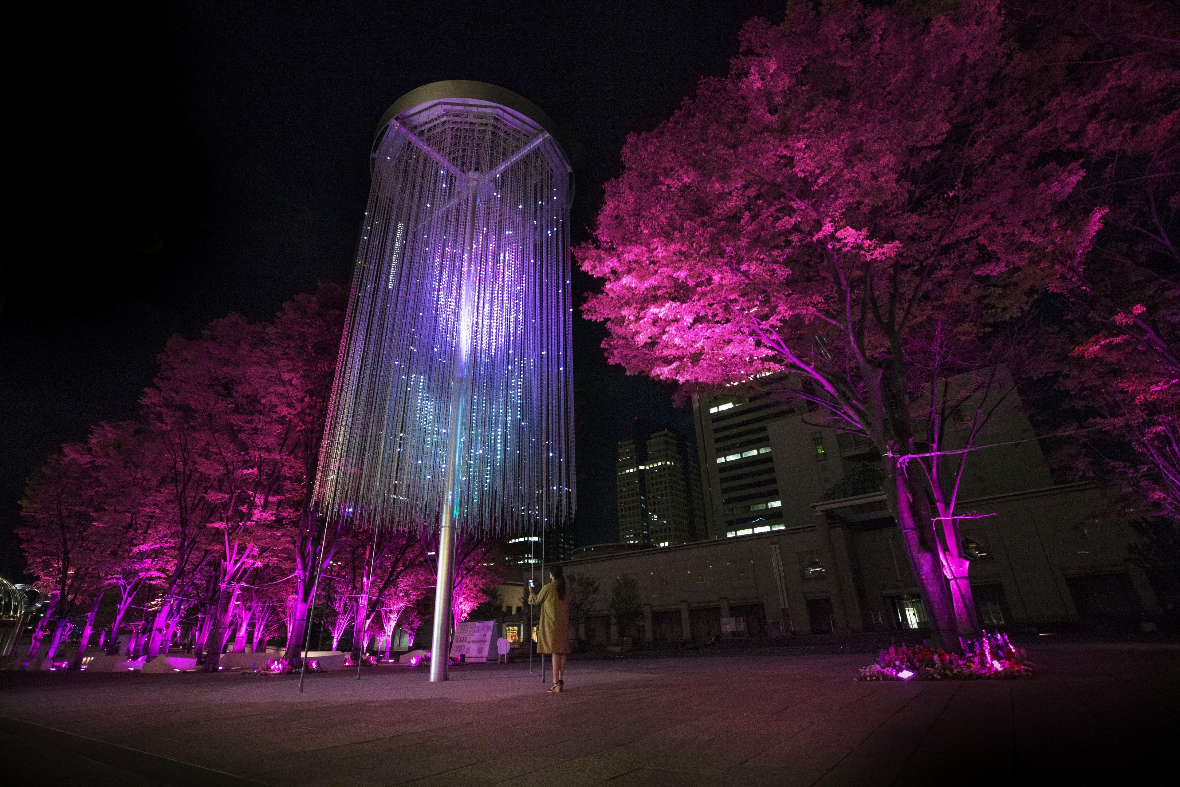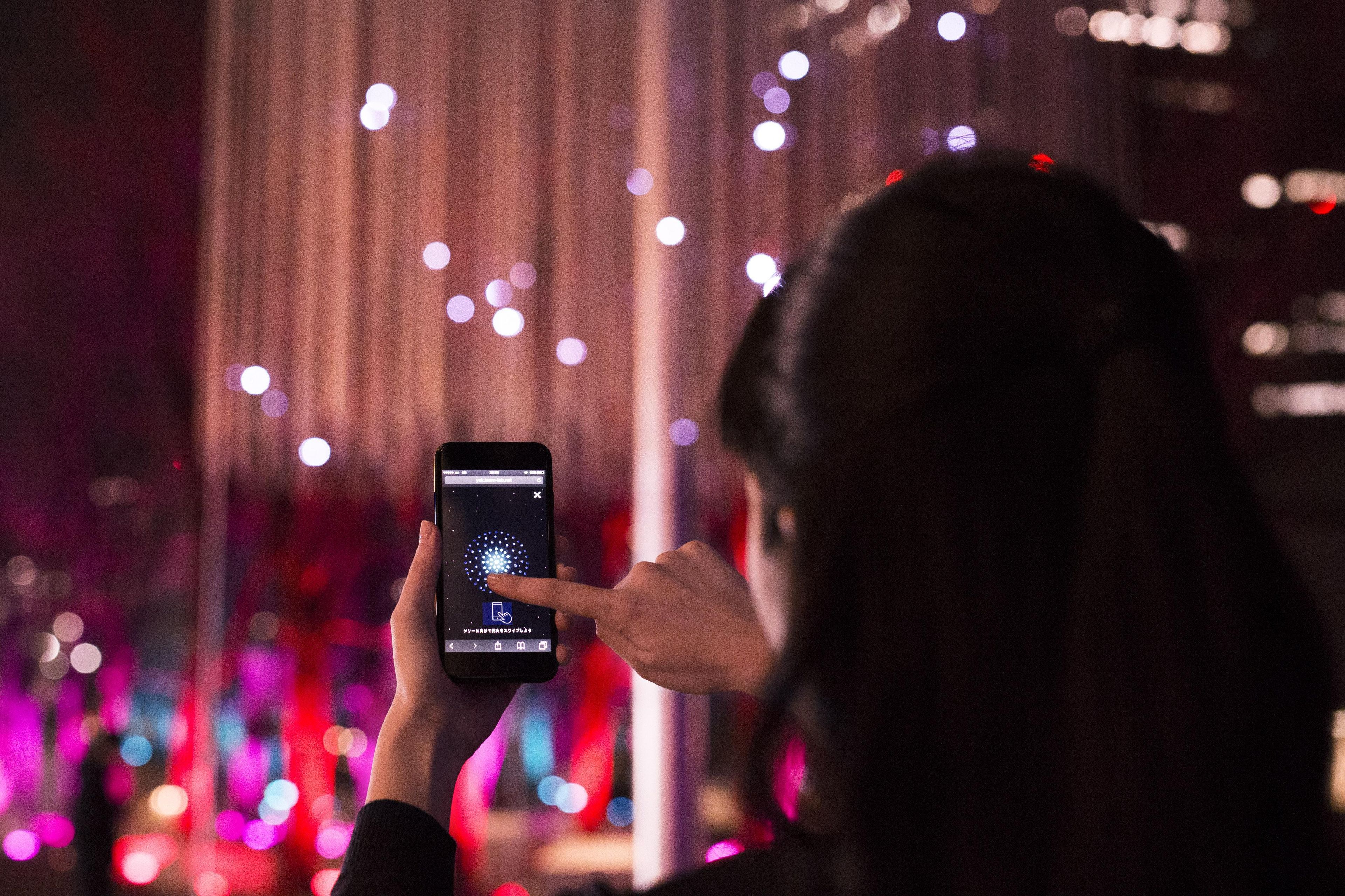 'teamLab Crystal Fireworks' and 'Resonating Trees' are interconnected and when you select and set off a firework, it's color will be spread out to the surrounding trees in the park. The park becomes an interactive space of light.
