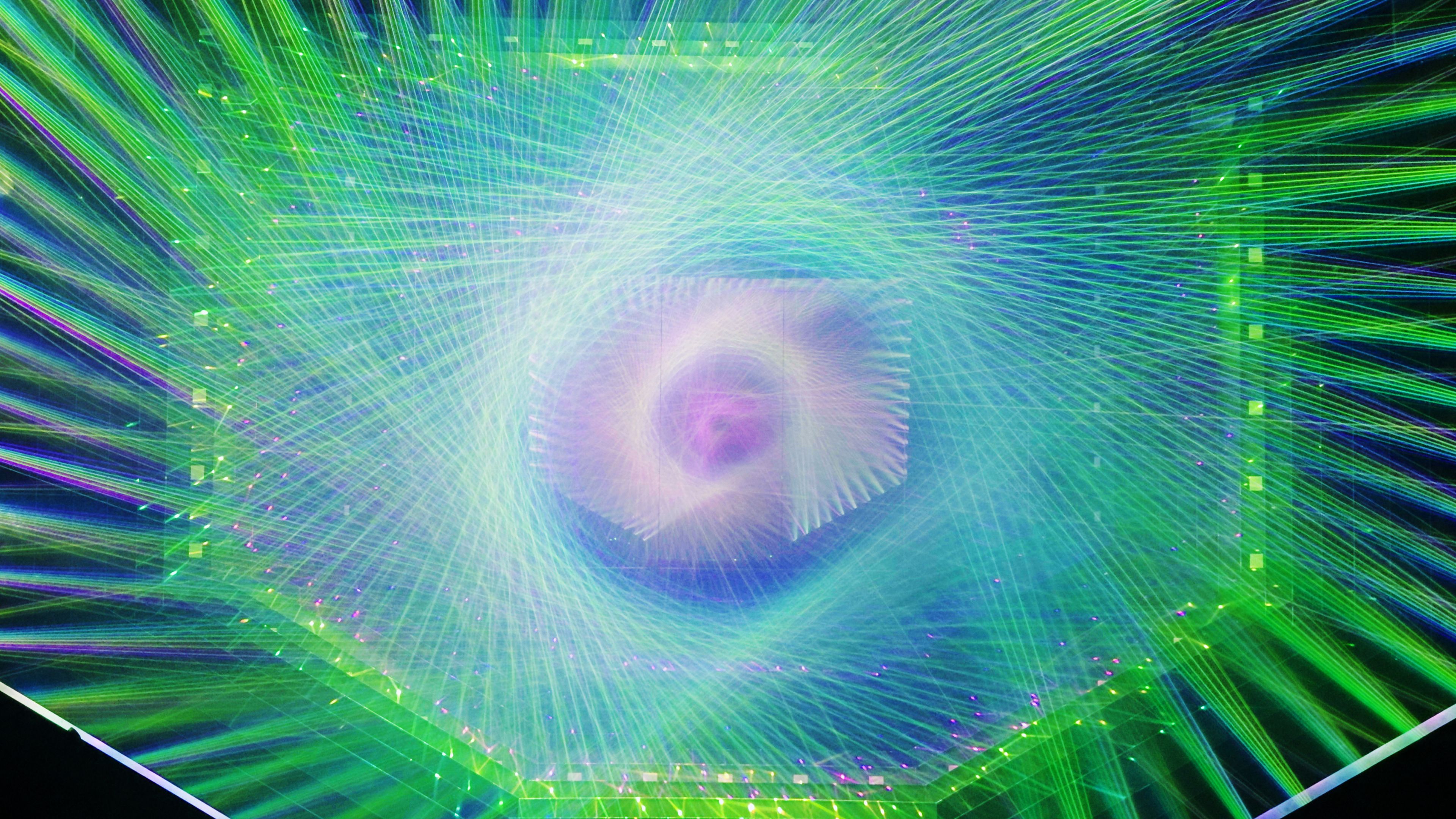 A sculpture composed of an order formed by a collection of light that flows continuously from the outside to the inside and from the inside to the outside.