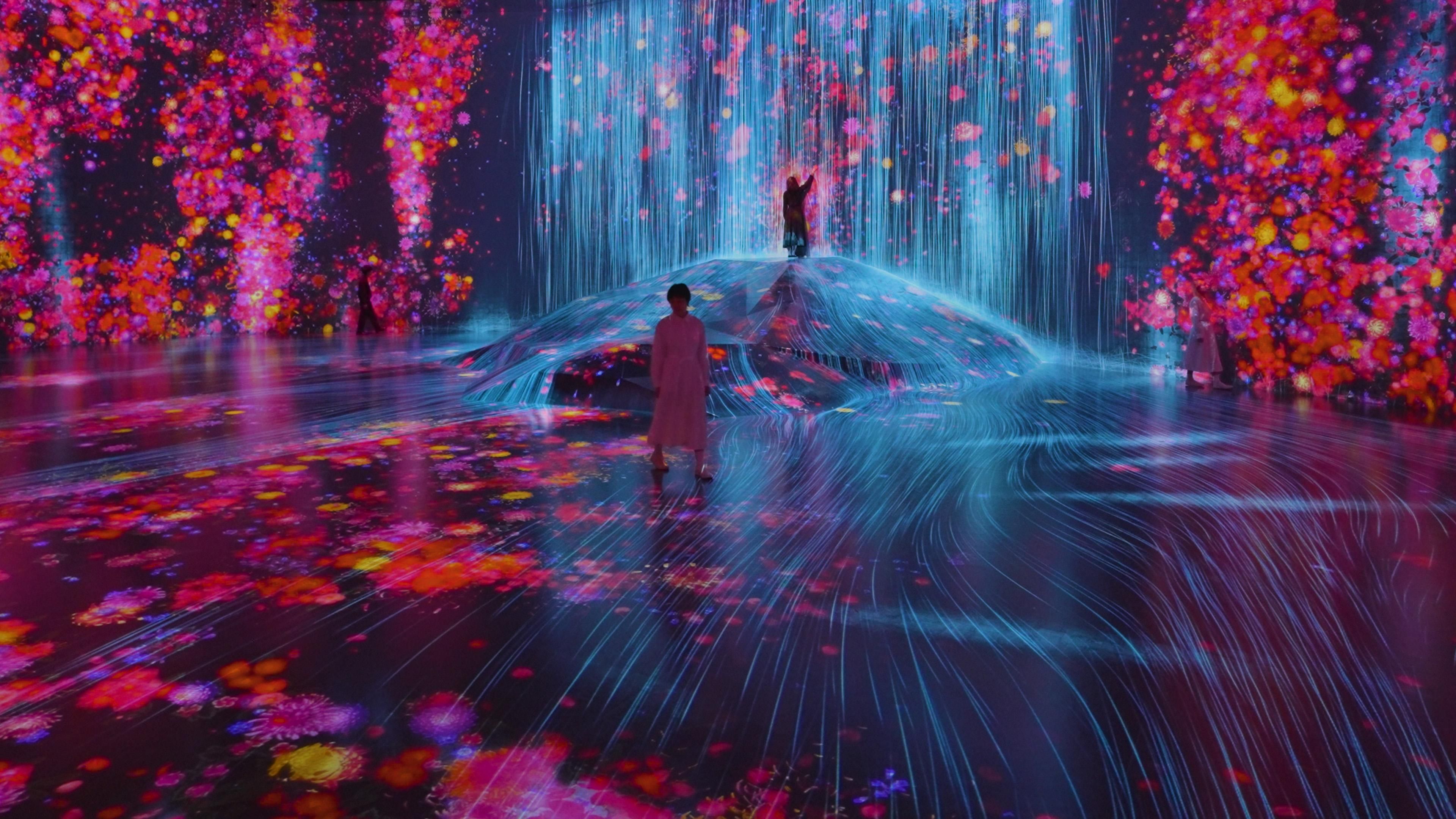 تم إنشاء الصخرة ،حيث يجتمع الناس، من خلال إعادة إنتاج العمل الفني في فضاء ثلاثي الأبعاد. ثم تمت محاكاة سقوط الماء على الصخرة، لتصوير حركة الماء على سطح الصخور. حيث يتم تمثيل الماء بسلسلة متواصلة من جزيئات الماء التي لا تُعد ولا تُحصى، ثم يتم حساب مسارات الجزيئات. ويتم رسم الخطوط في الفضاء حسب حركة جزيئات الماء تلك. ونظرًا لأن الخطوط يتم تسطيحها بعد ذلك باستخدام ما يسميه "تيم لاب" الفضاء فوق الذاتي، على عكس الصور التي يتم تسطيحها بواسطة العدسات والرسم المنظوري، فإن وجهة نظر الشخص ليست ثابتة وجسمه حر في الحركة. ولا تصبح الجدران والأرضية التي يتم تصوير الشلال عليها حدودًا بين الأشخاص والعمل الفني، وفضاء العمل الفني للشلال متواصل مع الفضاء الذي تتواجد فيه أجساد الأشخاص.