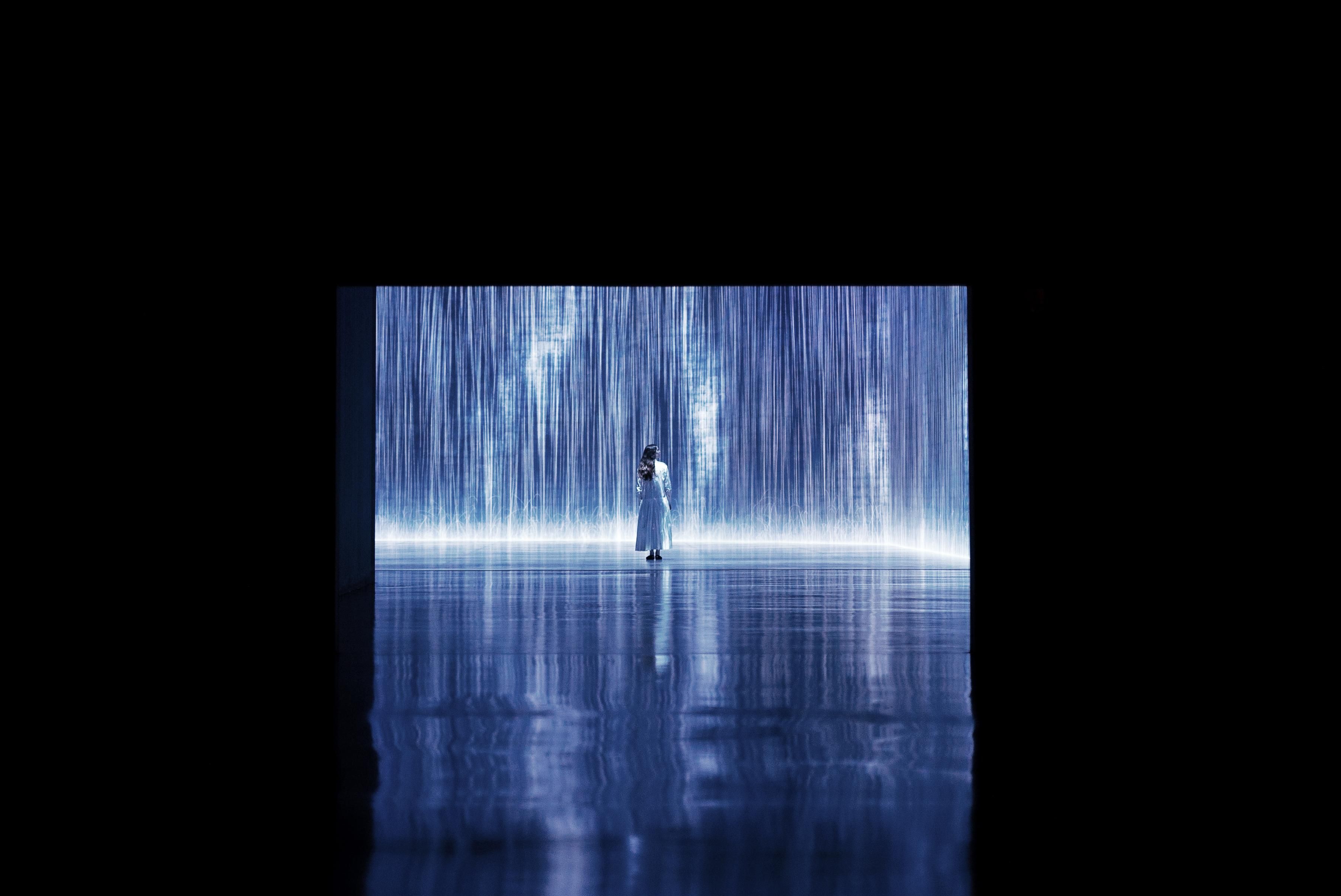Water is represented by a continuum of numerous water particles. The interaction between the particles is calculated, and then lines are drawn in relation to the behavior of the water particles. The lines are “flattened” using what teamLab considers to be ultrasubjective space.
