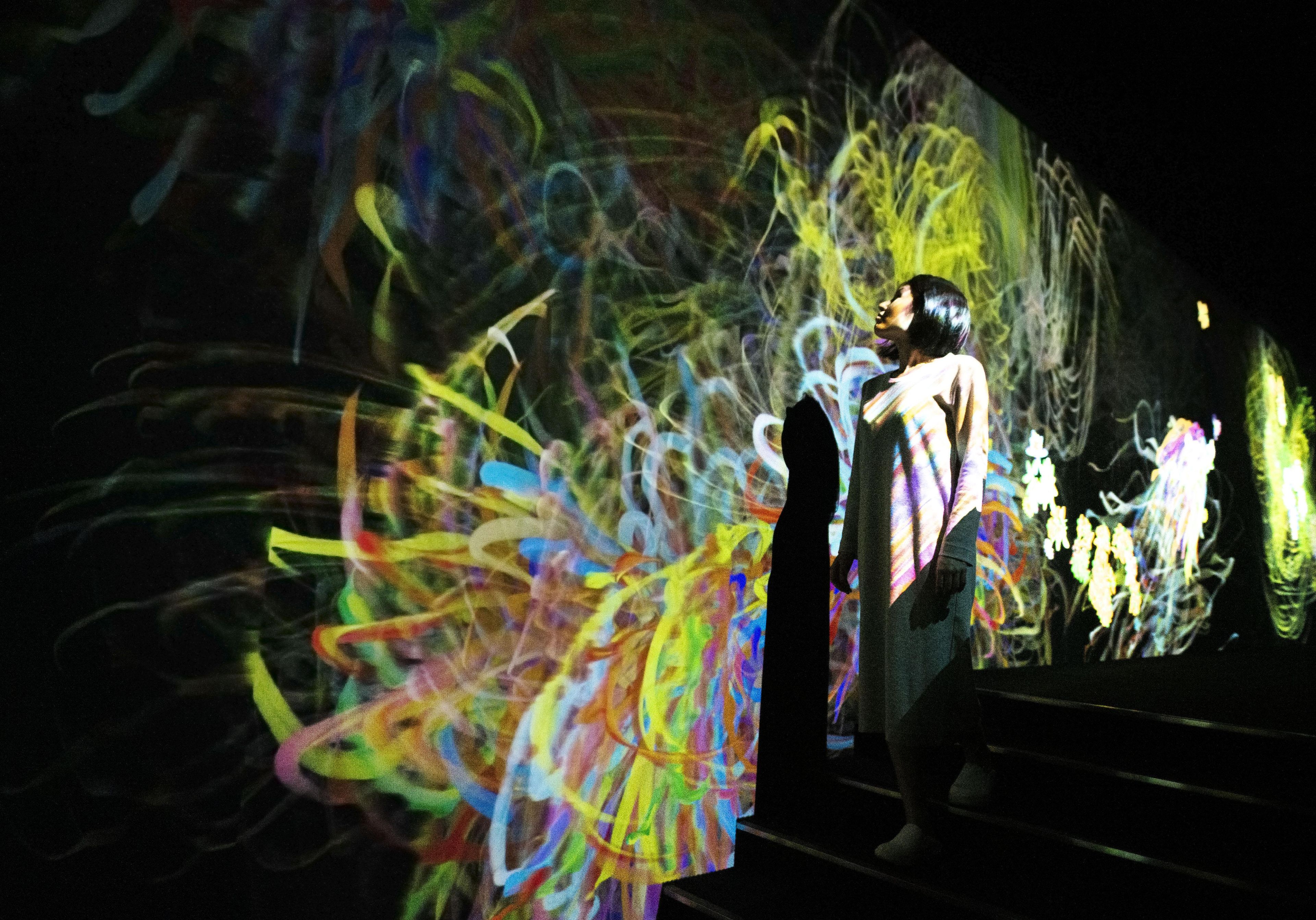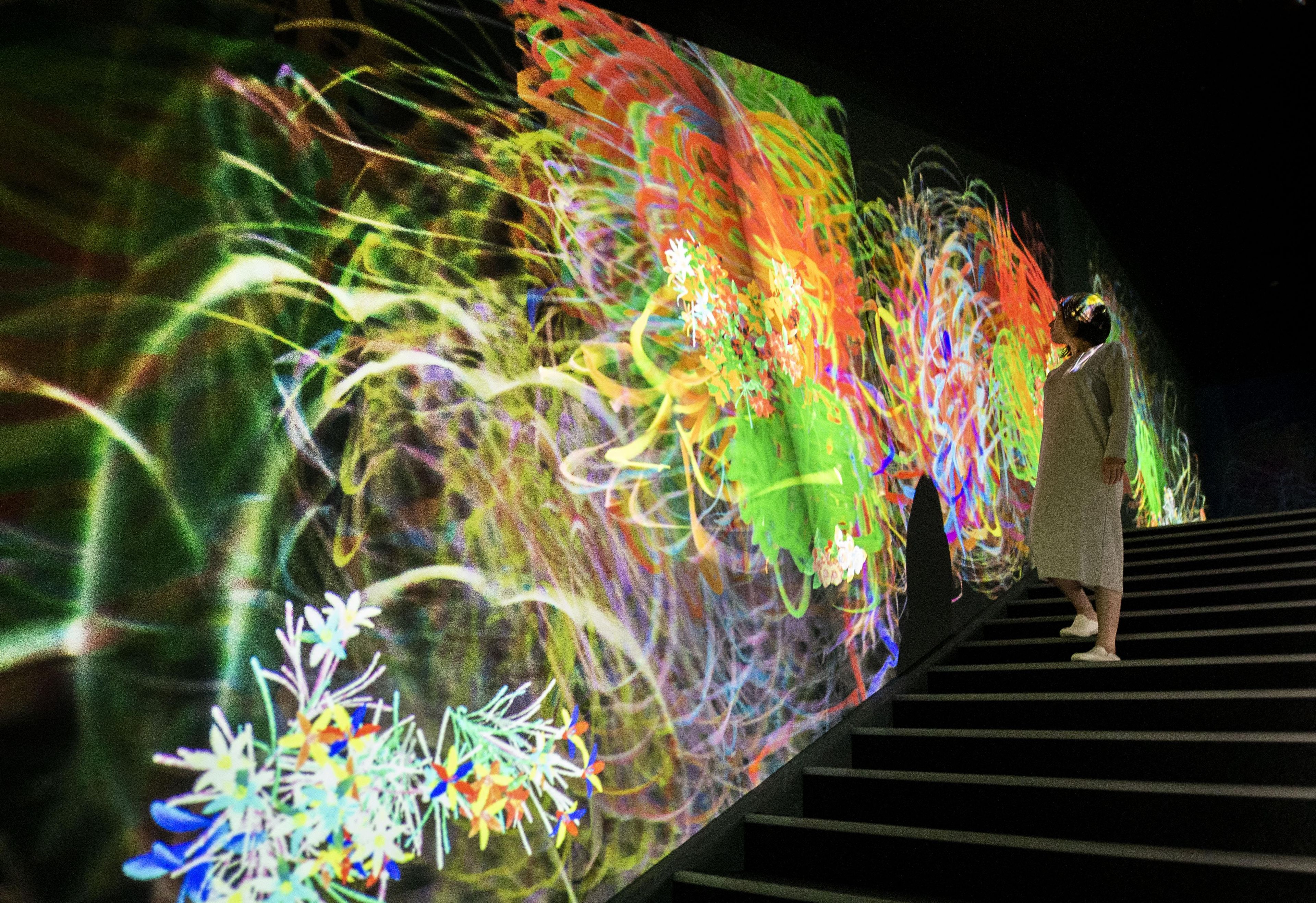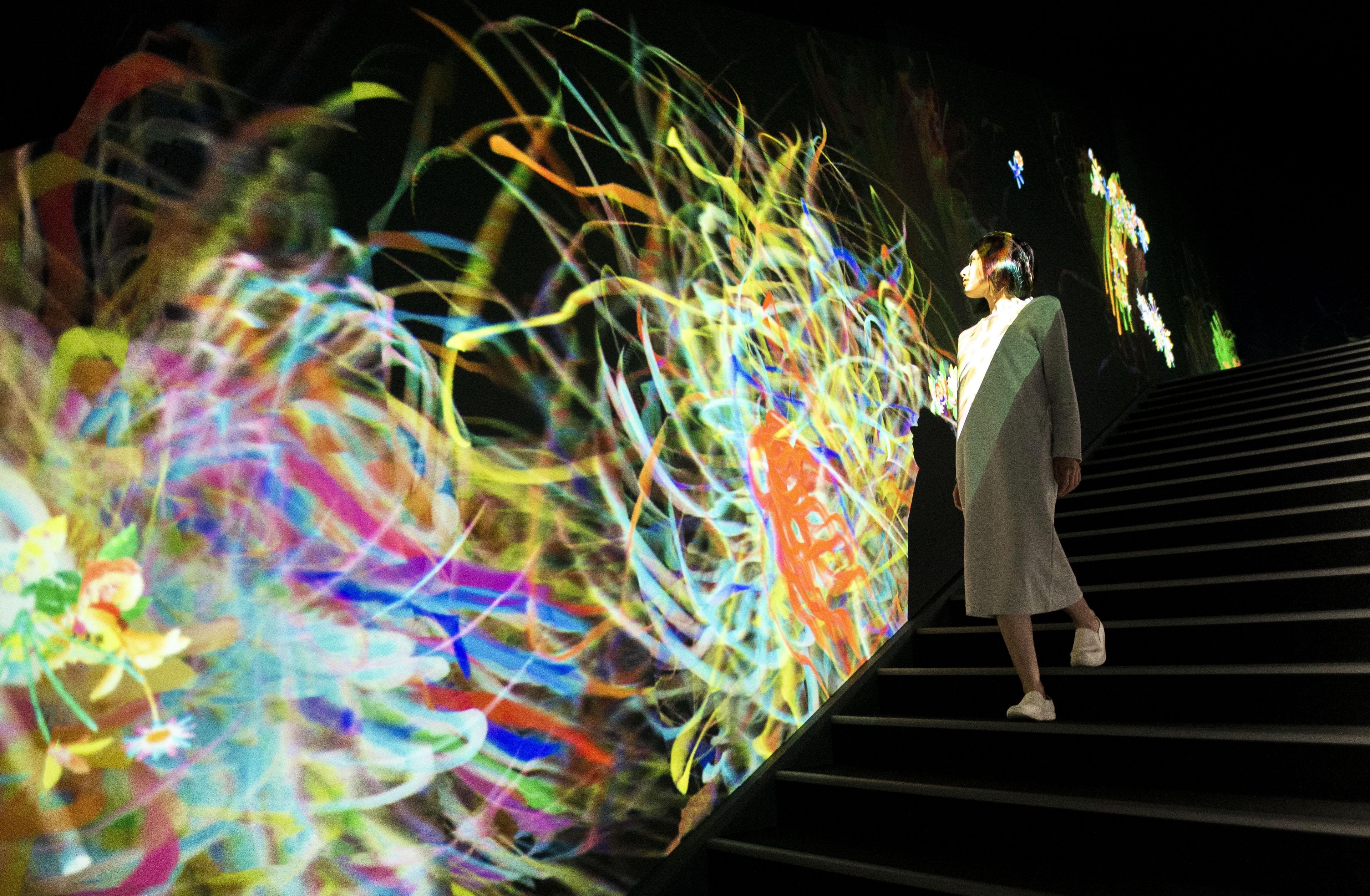 If people place their hands on the wall and hold them still, more flowers bloom. If they move their hands all the flowers scatter in an instant.
