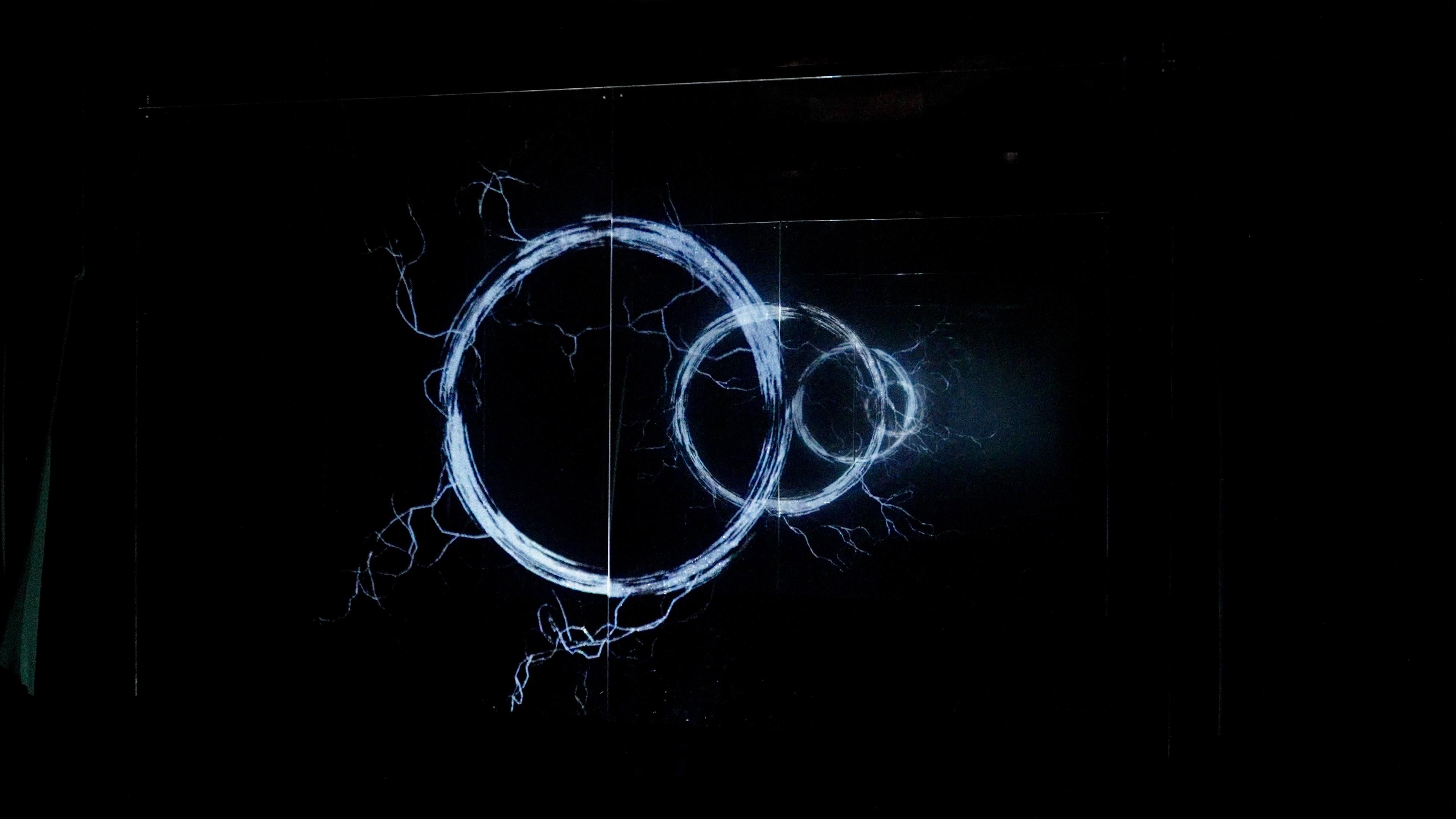 Enso, a Zen practice of drawing a circle with a single brush stroke, is continuously drawn in the space.