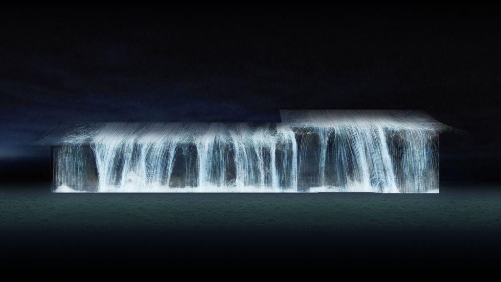 The waterfall was created by reproducing the space of C Future City in a three-dimensional space on a computer, letting water fall into it, and simulating the movement of water as influenced by the shape of the space. As people approach the waterfall, the flow of the water changes. It is a universe of water particles influenced by C Future City and the people there.