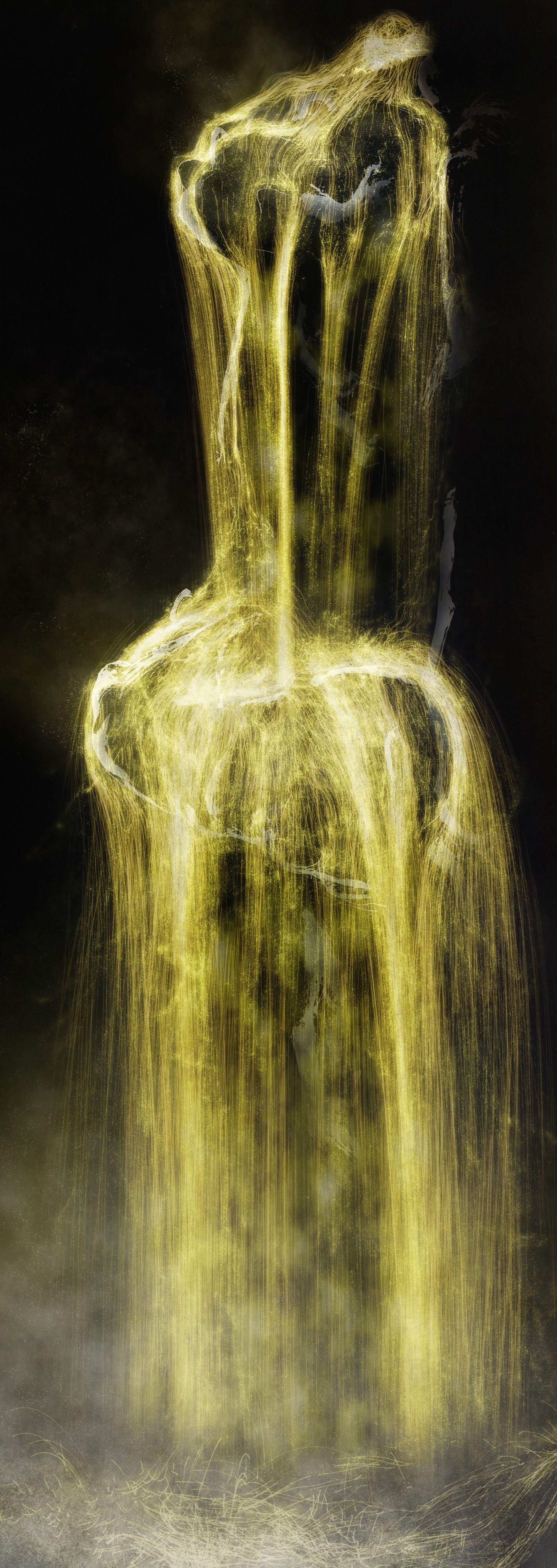 When a person moves, a force is applied in that direction, thereby generating a flow. The difference in the velocities of the flow and the surrounding area creates a vortex. Force is also applied by the cascading waterfall. The waterfall is changed by the presence of people, and vortices are born due to the movements of people.