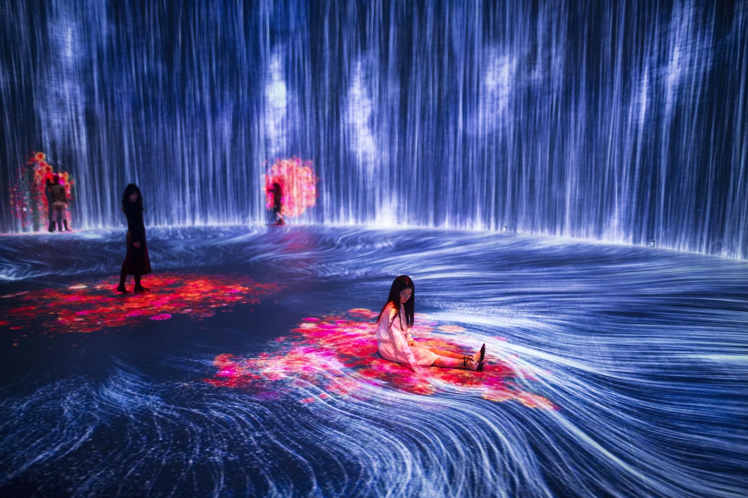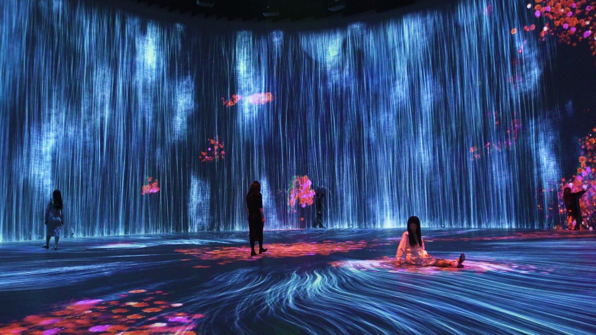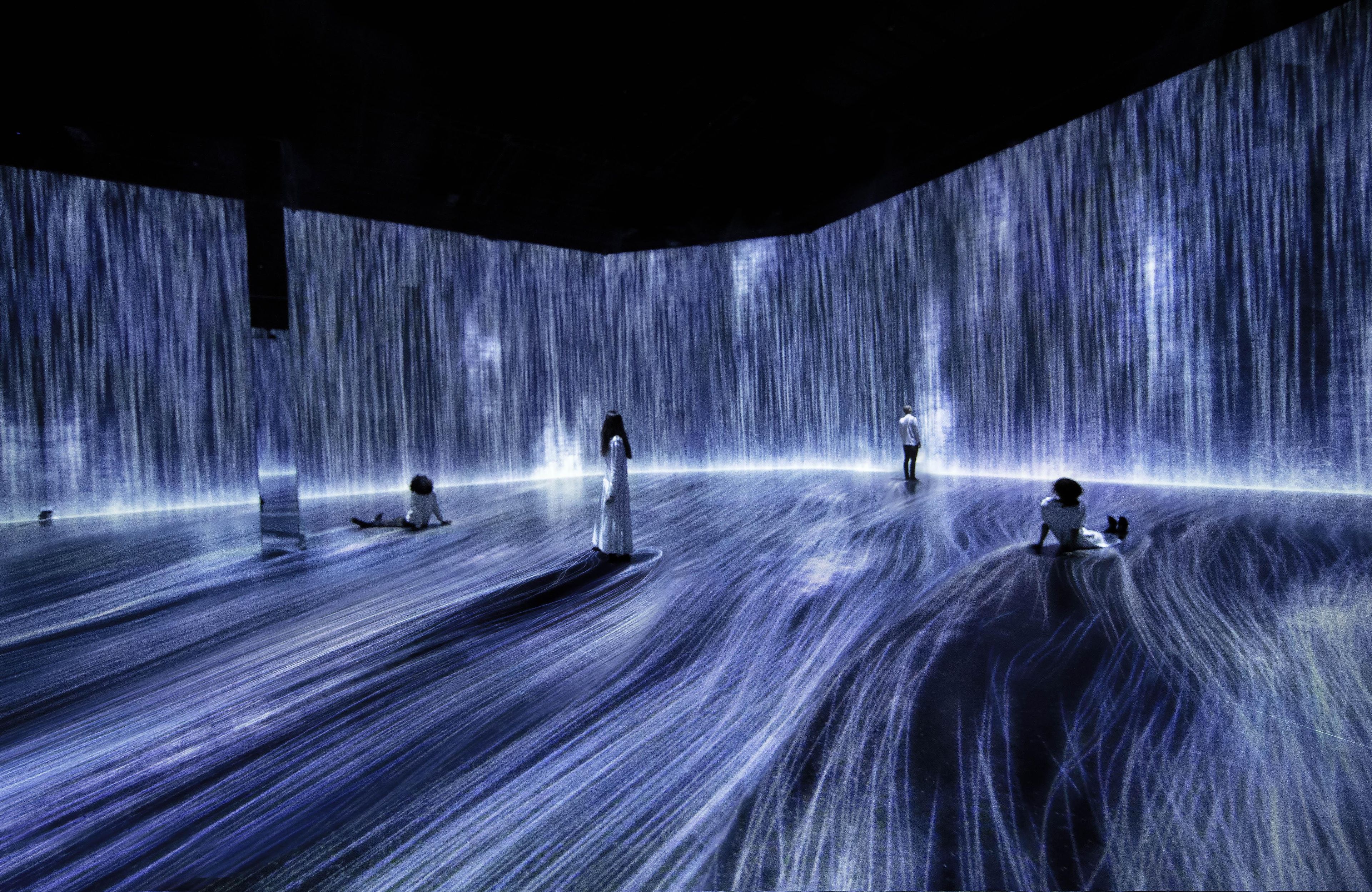 Water is represented by a continuum of numerous water particles. The interaction between the particles is calculated, and then lines are drawn in relation to the behavior of the water particles. The lines are “flattened” using what teamLab considers to be ultrasubjective space.