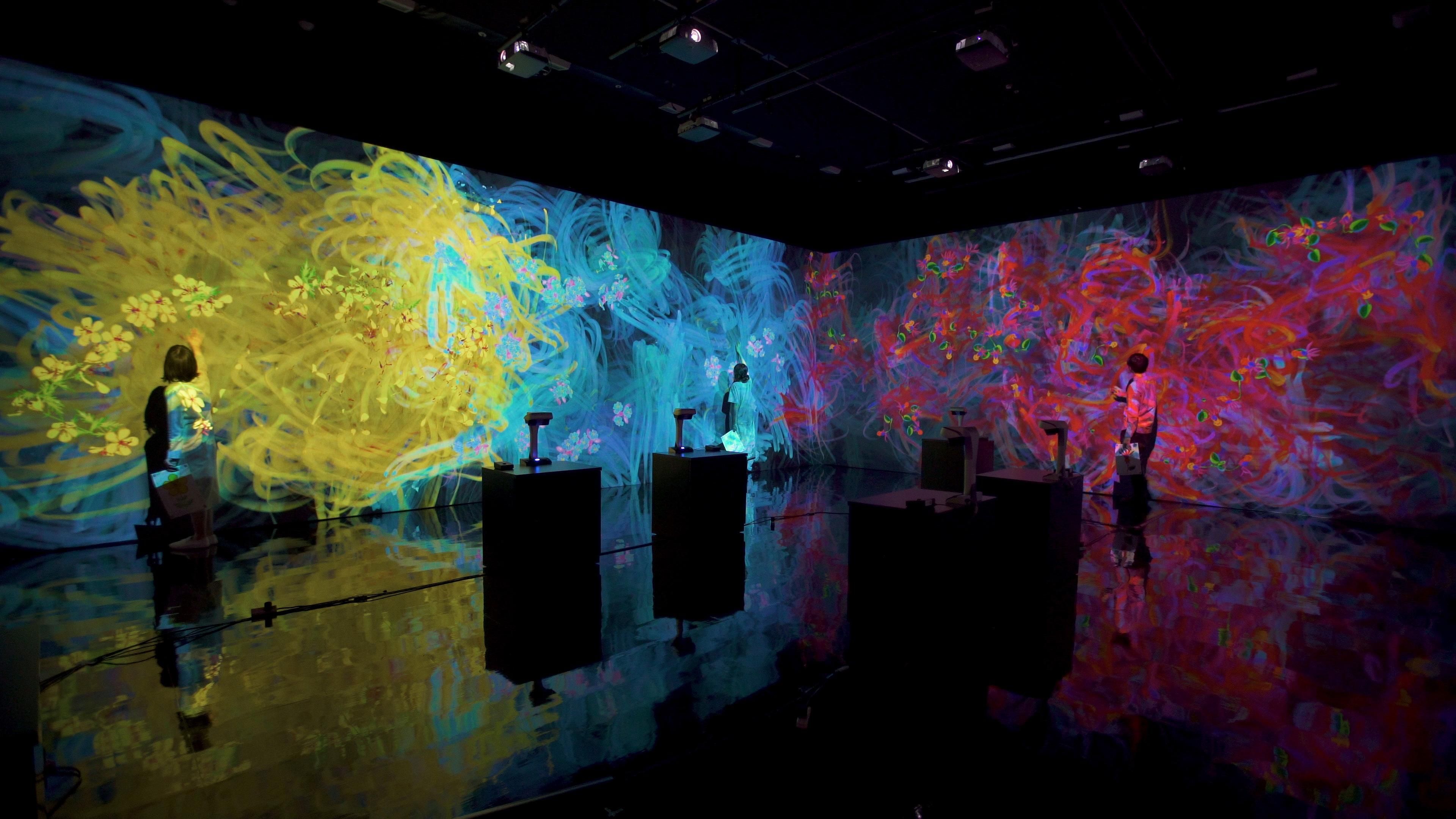 In making things that combines science, technology, design and art, one of the IT companies most notable in Japan now for doing so is teamLab. “Learn! Amusement Park of the Future”, a project created by them for children, was held in various parts of Japan, garnering rave reviews. In this project, children are encouraged to move their bodies in front of the latest technology-leading device to experience the creation of an art space. Sketch Aquarium is one representative attraction of the project.Against the wall of a dim hall is an undersea world of swaying seaweeds and beautiful coral reef. Paper drawings of sharks, jellyfish, and squids, among others are prepared for them to use crayons to colour as they wish. By scanning their works, the creatures that they have just designed will start to appear in the sea on the wall, swimming around freely. The fish respond to touches and it is possible to make them change their swimming direction and feed them. Besides the children, the accompanying adults also become engrossed, colouring the fish themselves, pointing to them and teaching after they are scanned in, enjoying each other’s works, and so forth, making the scene bustle with life. A never before seen virtual aquarium filled with colourful fish swimming has finally appeared.