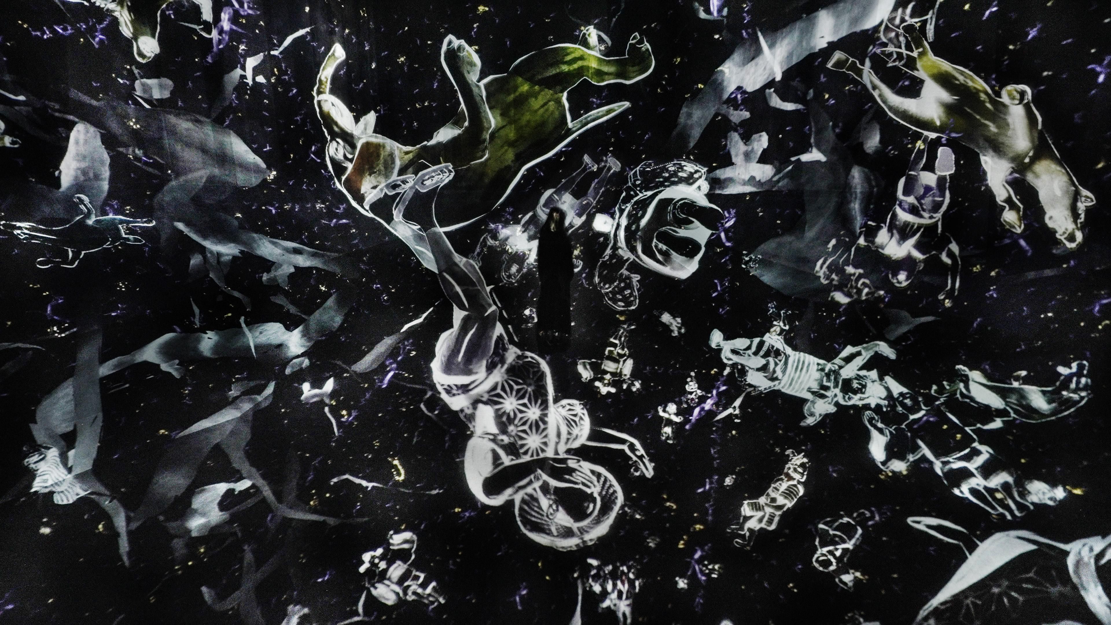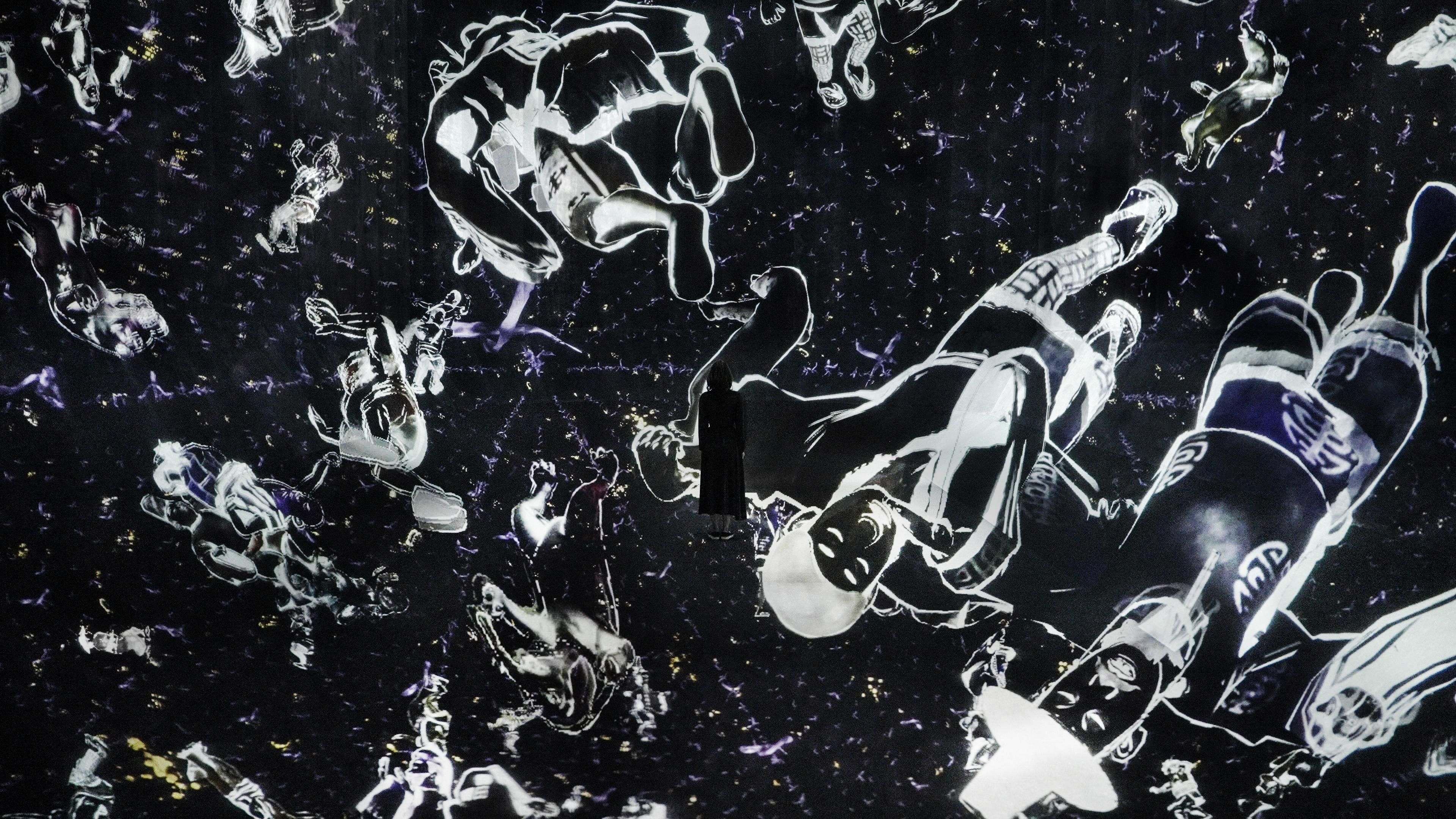 The work begins when the figures of Walk, Walk, Walk enter the Cosmic Void. The work ends when the figures leave the space and disappear.