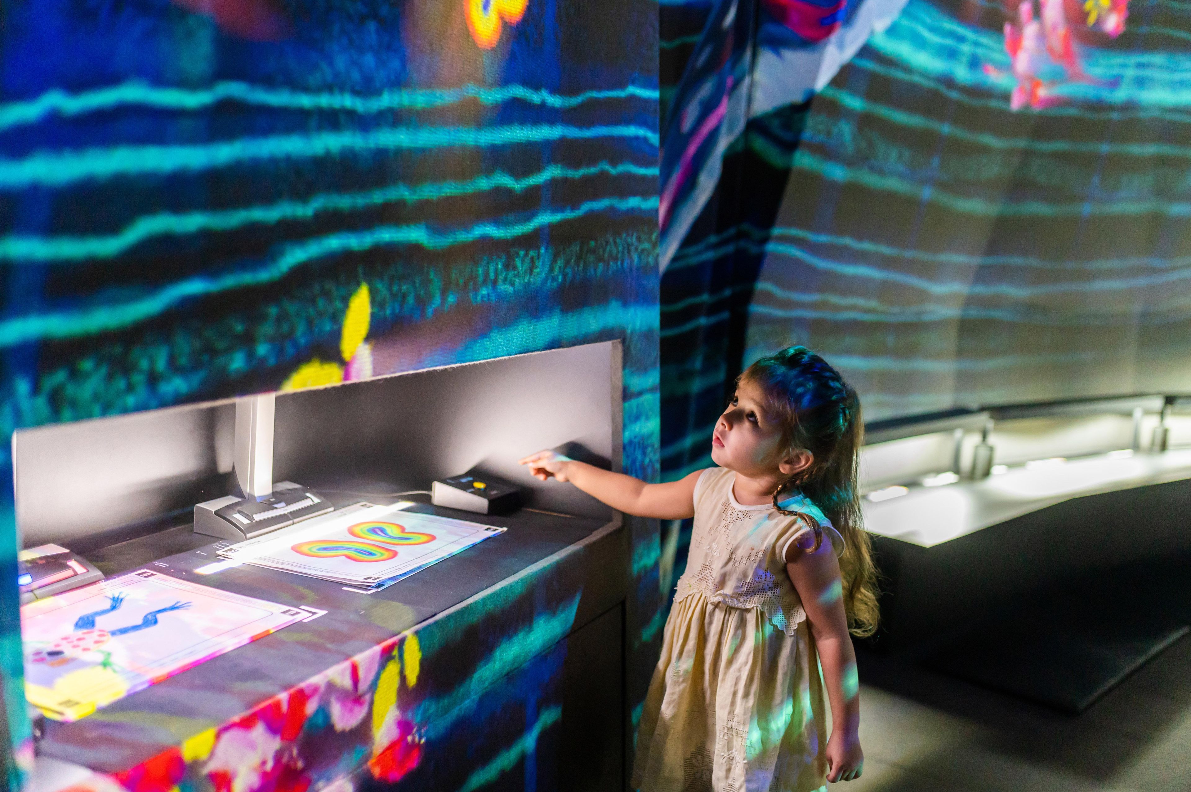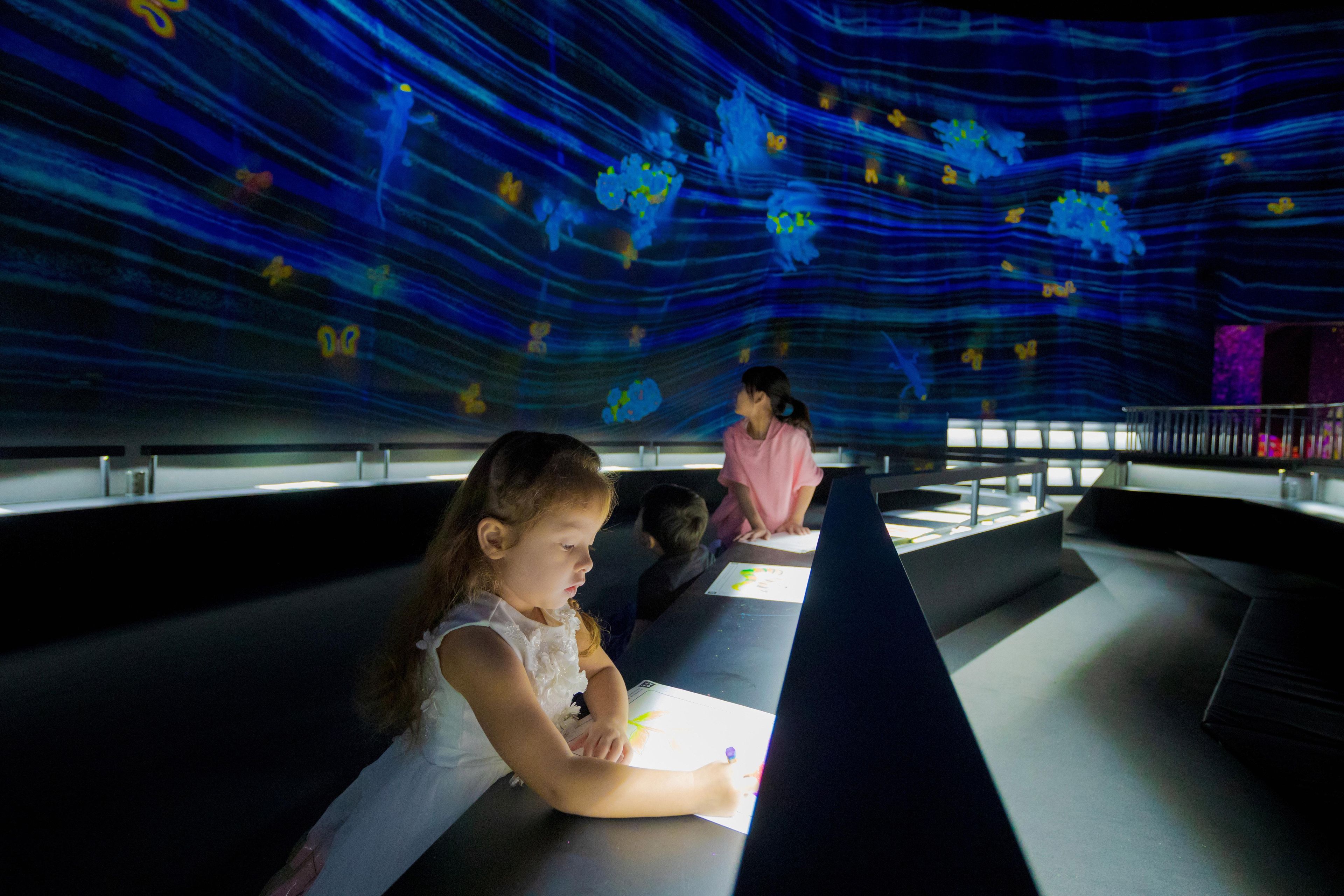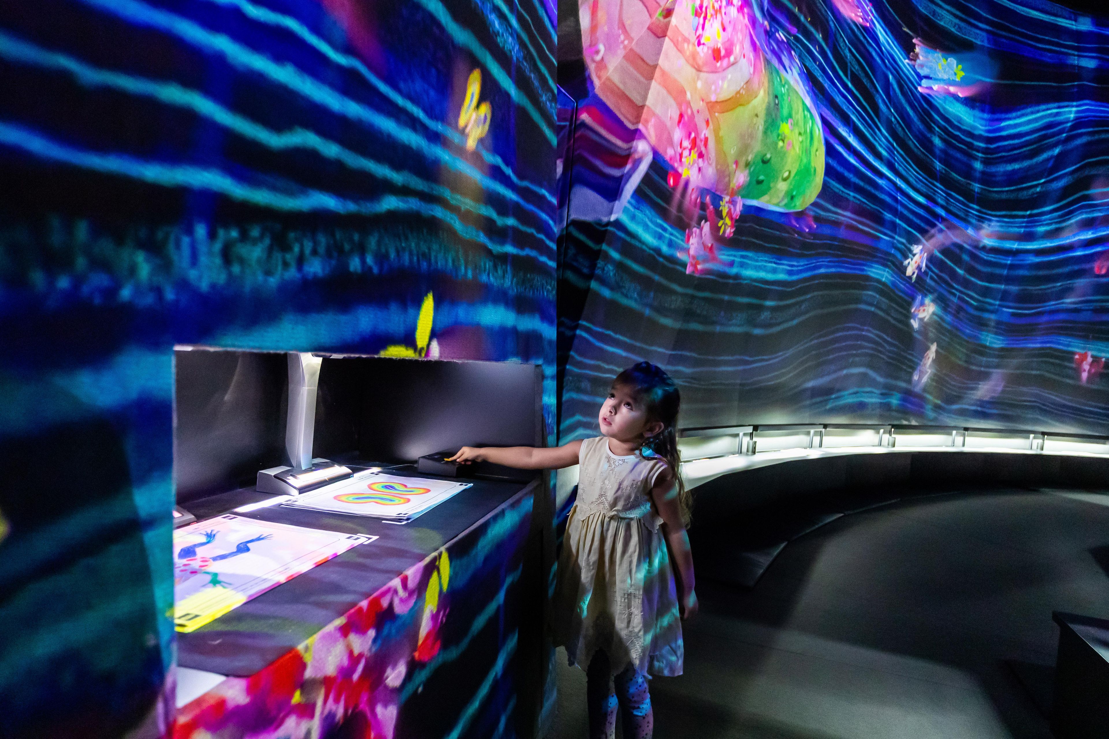 All the various creatures drawn by everyone live in a large, three-dimensional space consisting of slopes with varying elevations. Color in a creature on the paper provided, and see the picture you have drawn come to life and move in front of you.