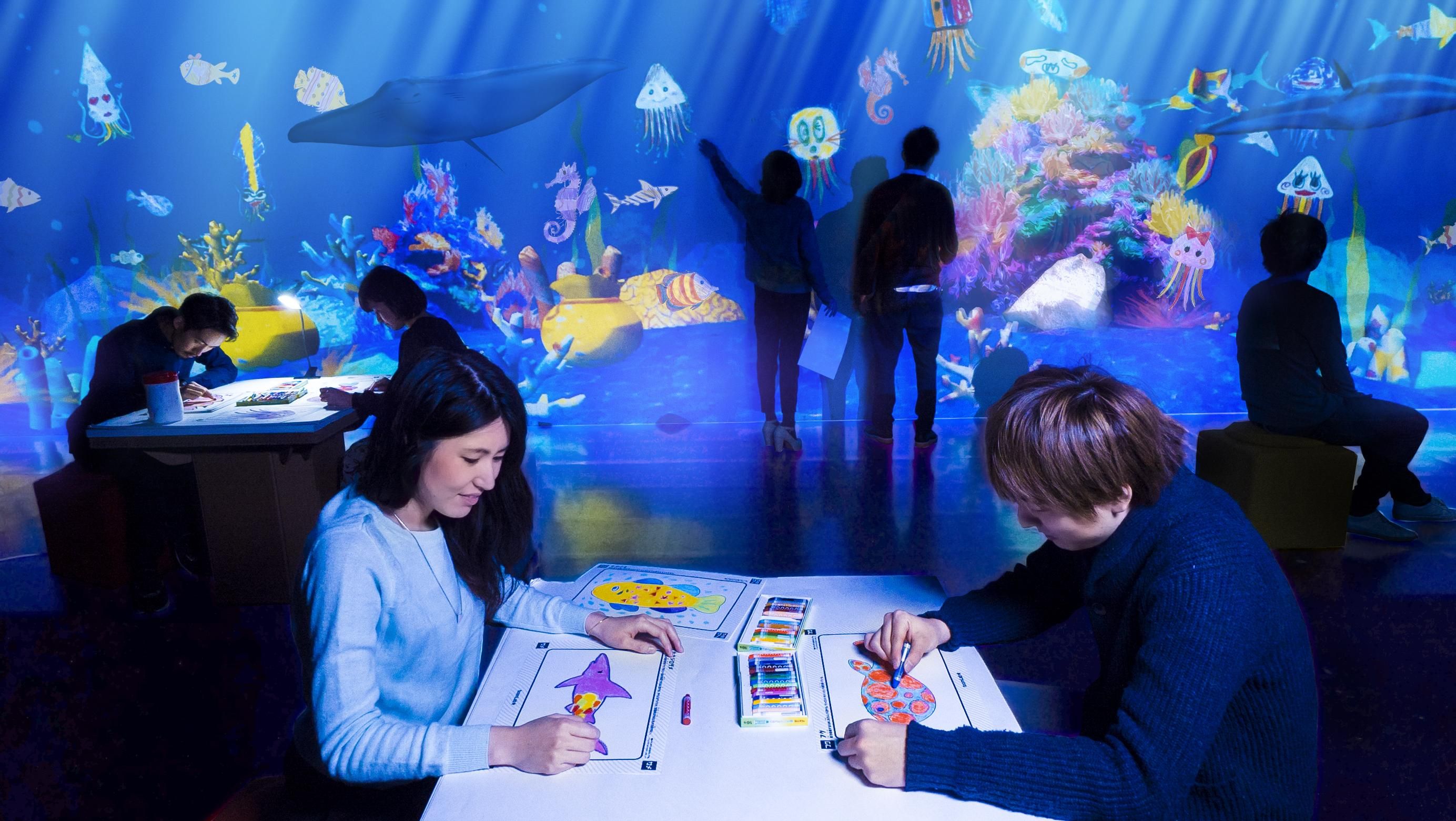 Color in a fish on the paper provided, and see the picture you have drawn come to life, swimming out into the massive aquarium in front of you together with the fish drawn by other people. If you touch the swimming fish, they will swim away. You can also feed the fish by touching the food bags.