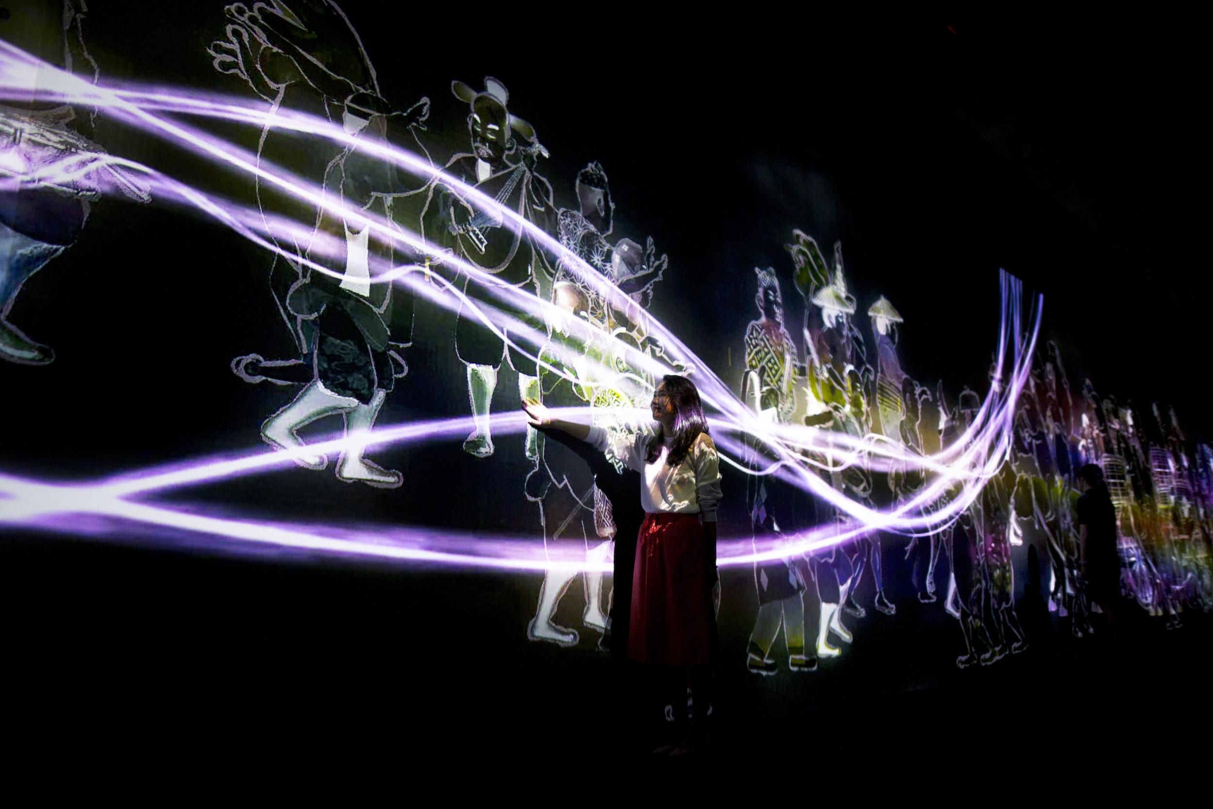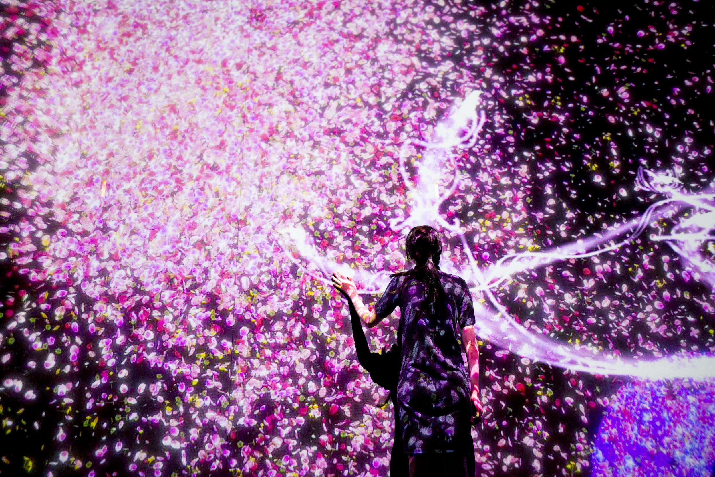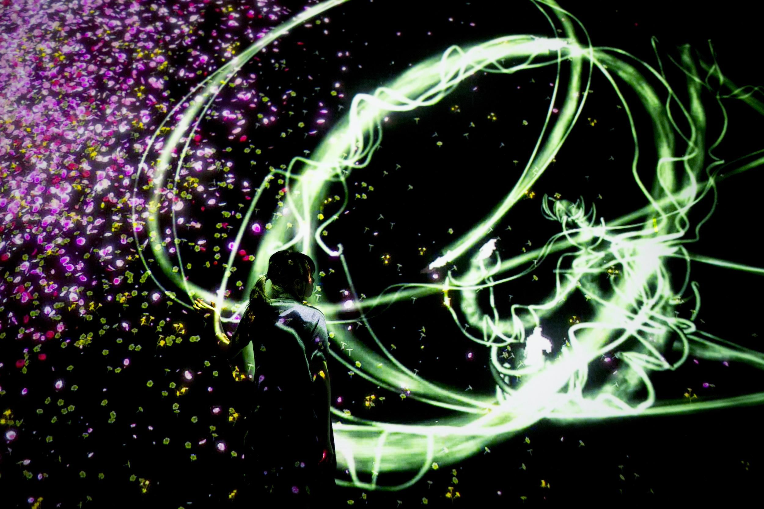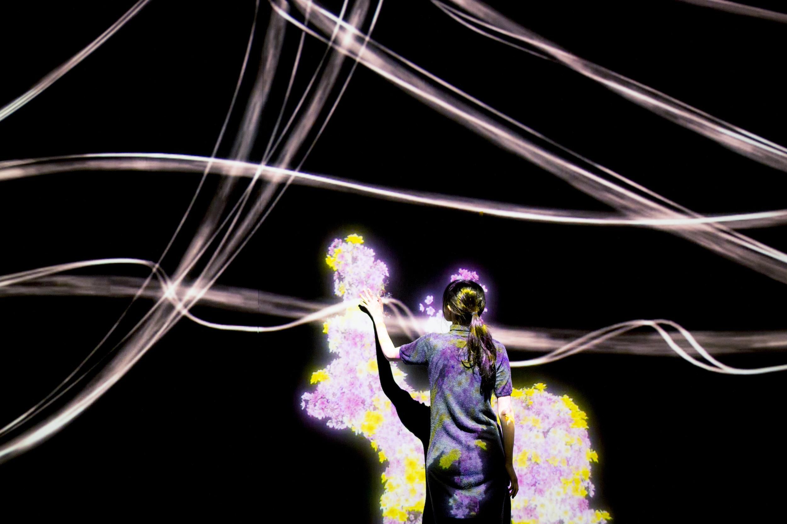 Crows are rendered in light as they fly around the space, leaving trails of light in their paths and creating spatial calligraphy. The crows chase one another and in turn become chased themselves. When the chased crows crash into one another, they scatter, turning into flowers. The crows attempt to fly around people in the space, but when they crash into a viewer, they scatter, turning into flowers in the same way.