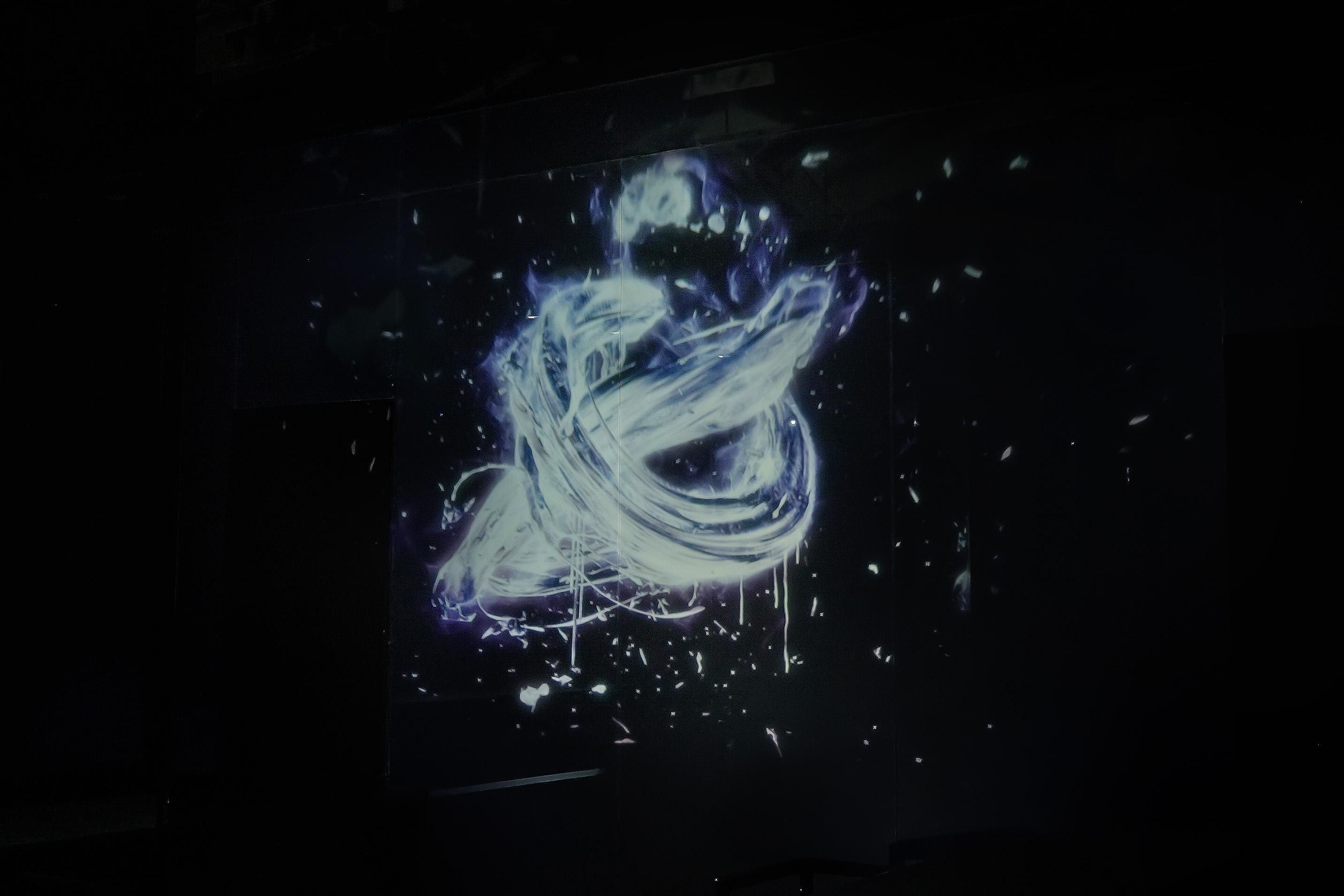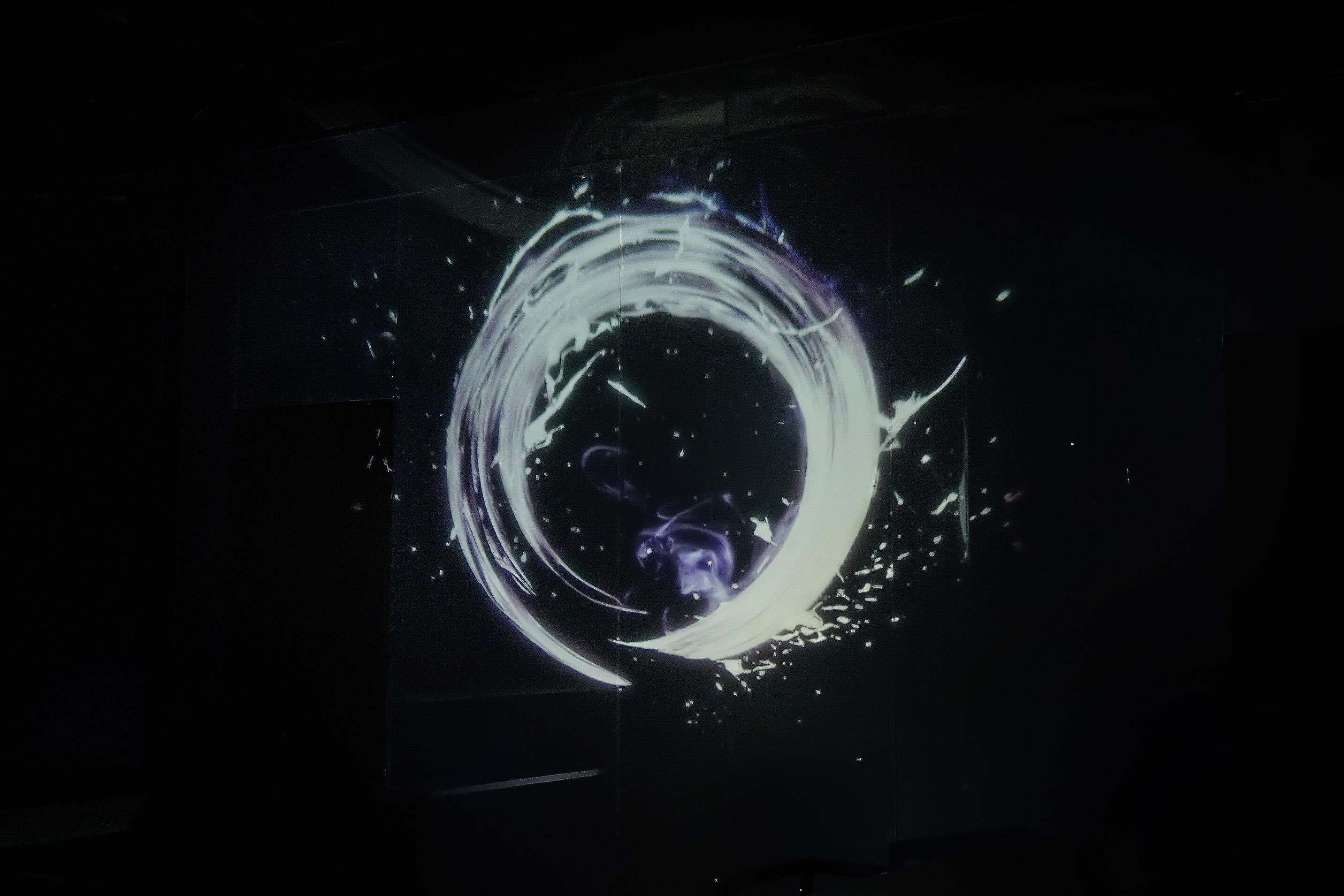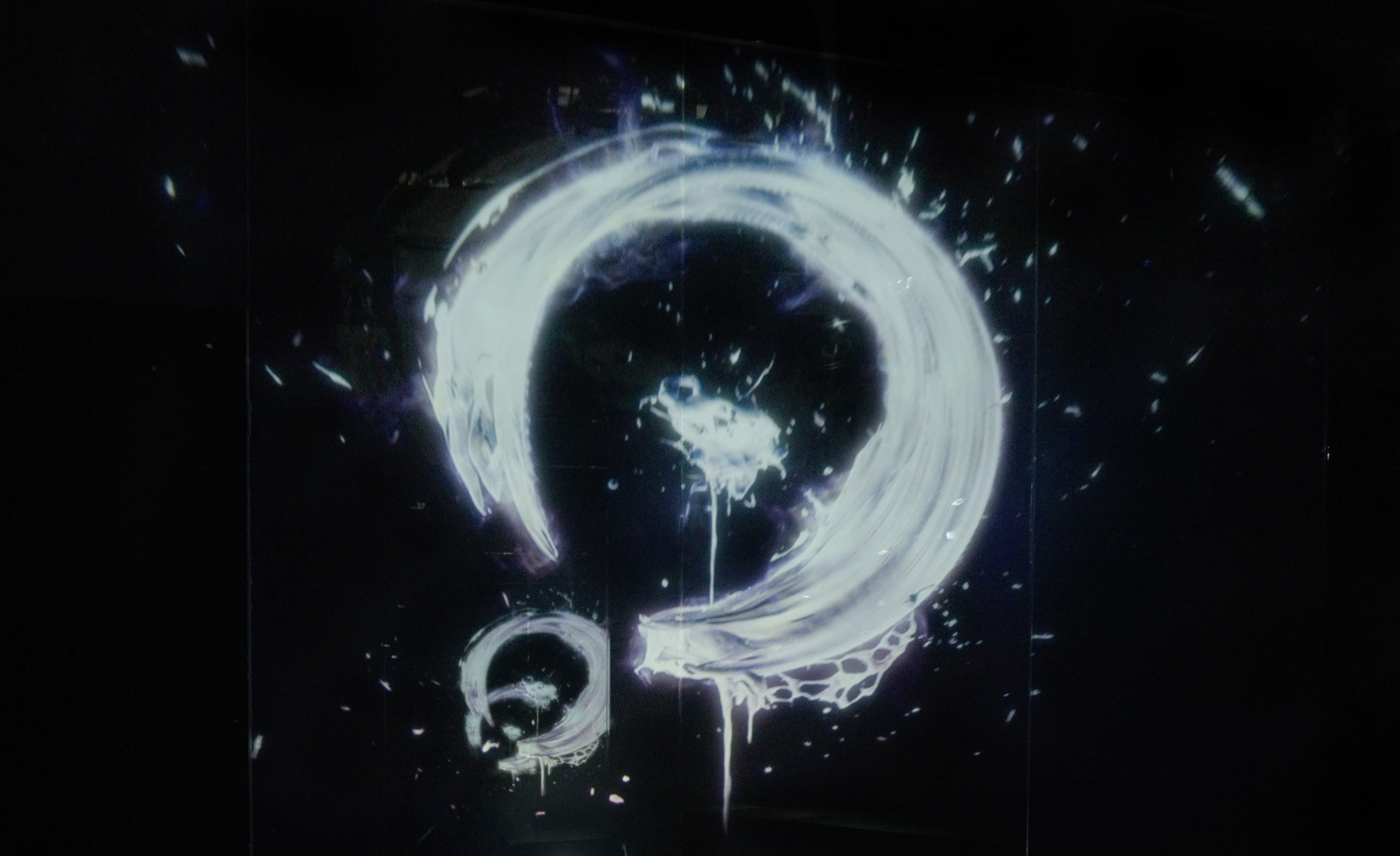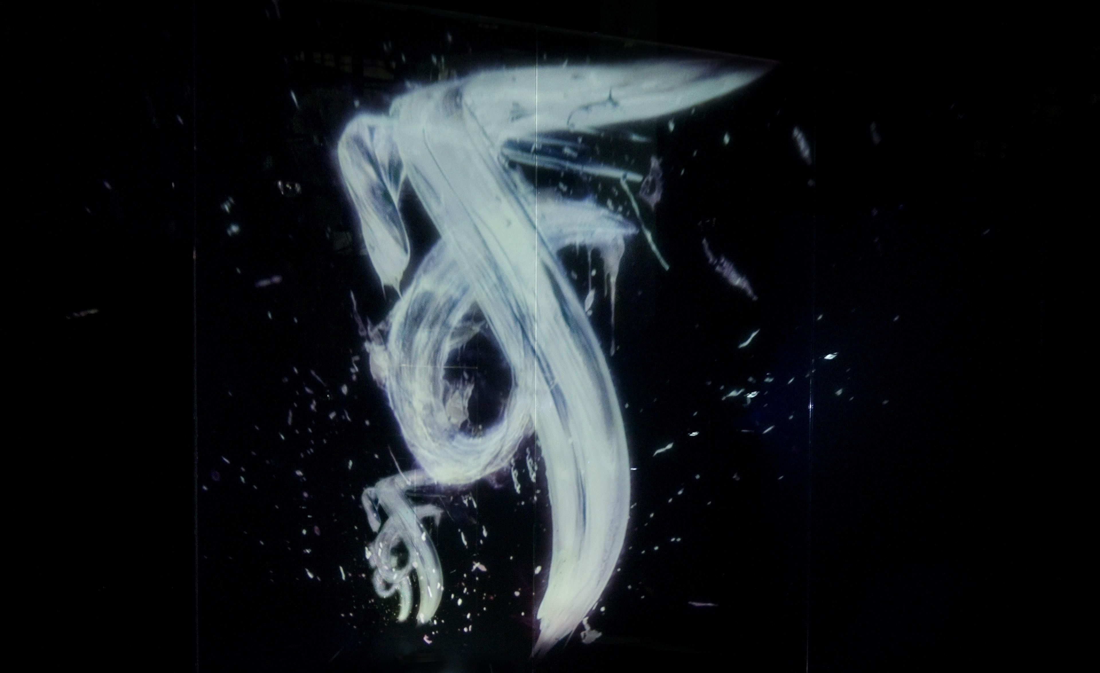 Spatial Calligraphy is a form of calligraphy drawn in space that teamLab has been exploring since it was founded. The artwork reconstructs calligraphy in three-dimensional space to express the depth, speed, and power of the brushstroke, and that calligraphy is then flattened using the logical structure of space teamLab calls Ultrasubjective Space. The calligraphy shifts between two and three dimensions.