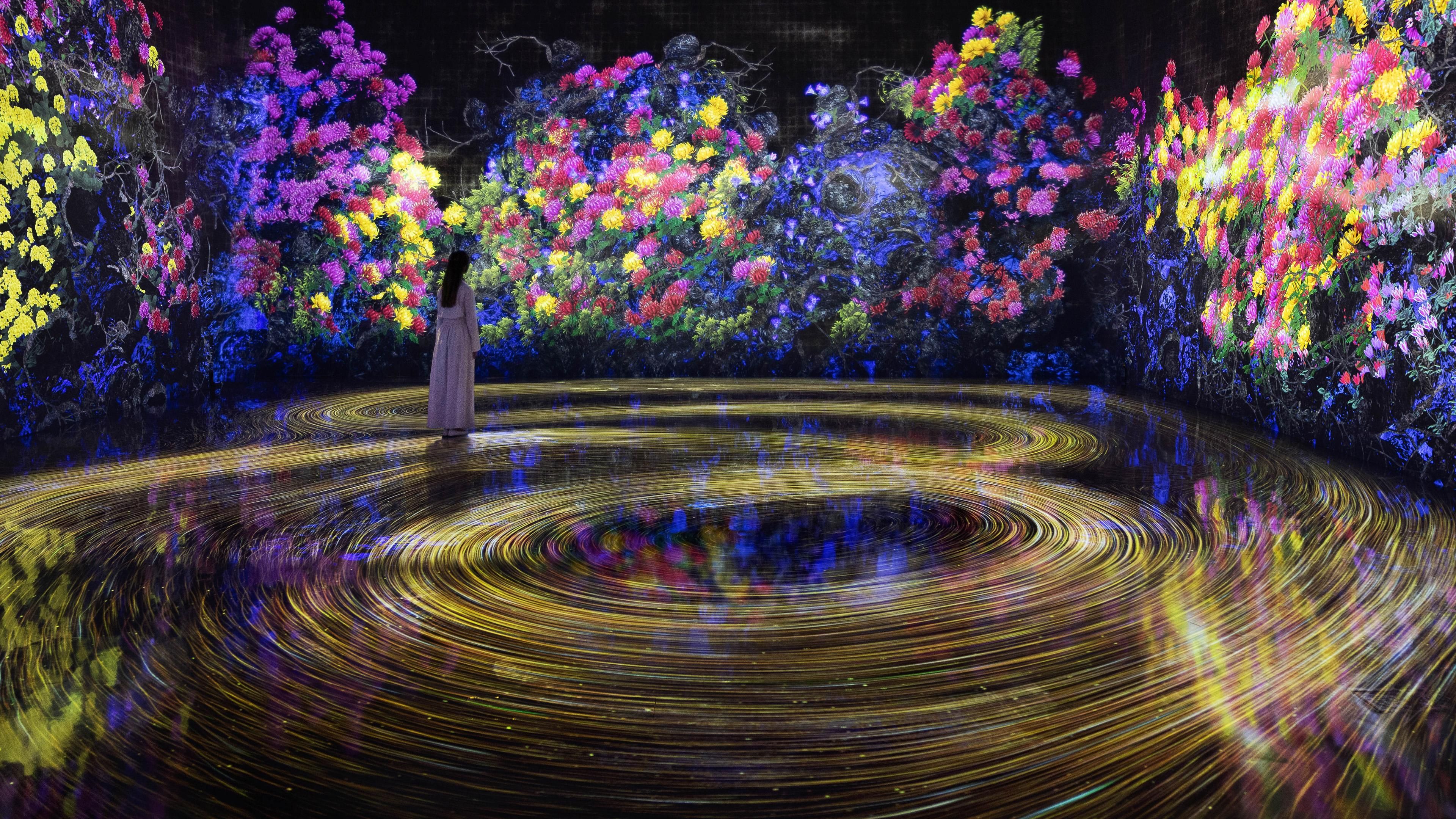 The flow in the artwork is expressed as a continuum of particles, and lines are drawn in three-dimensional space according to the trajectories of those particles. The accumulation of lines that represent the work are then flattened according to what teamLab calls Ultrasubjective Space.