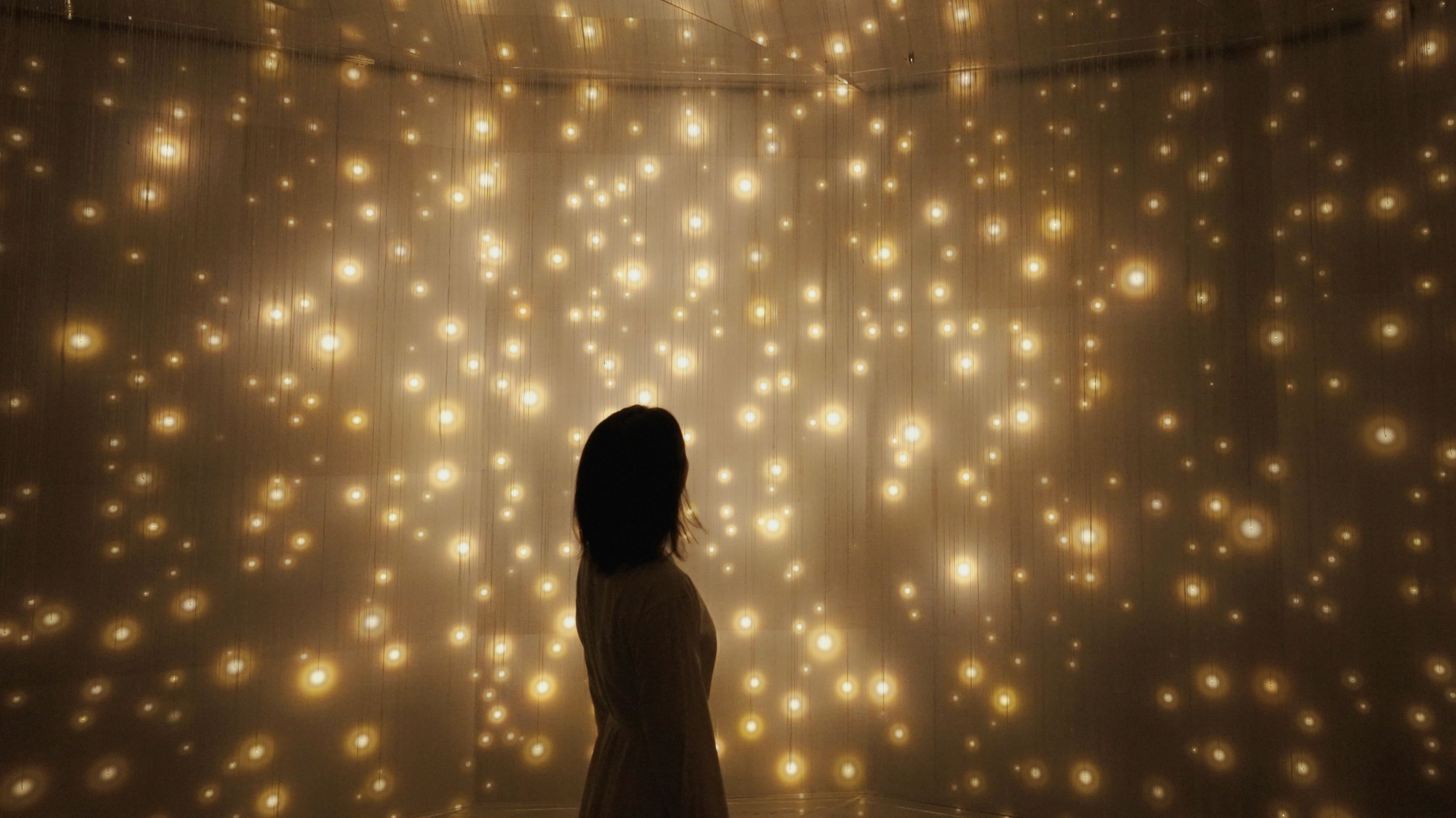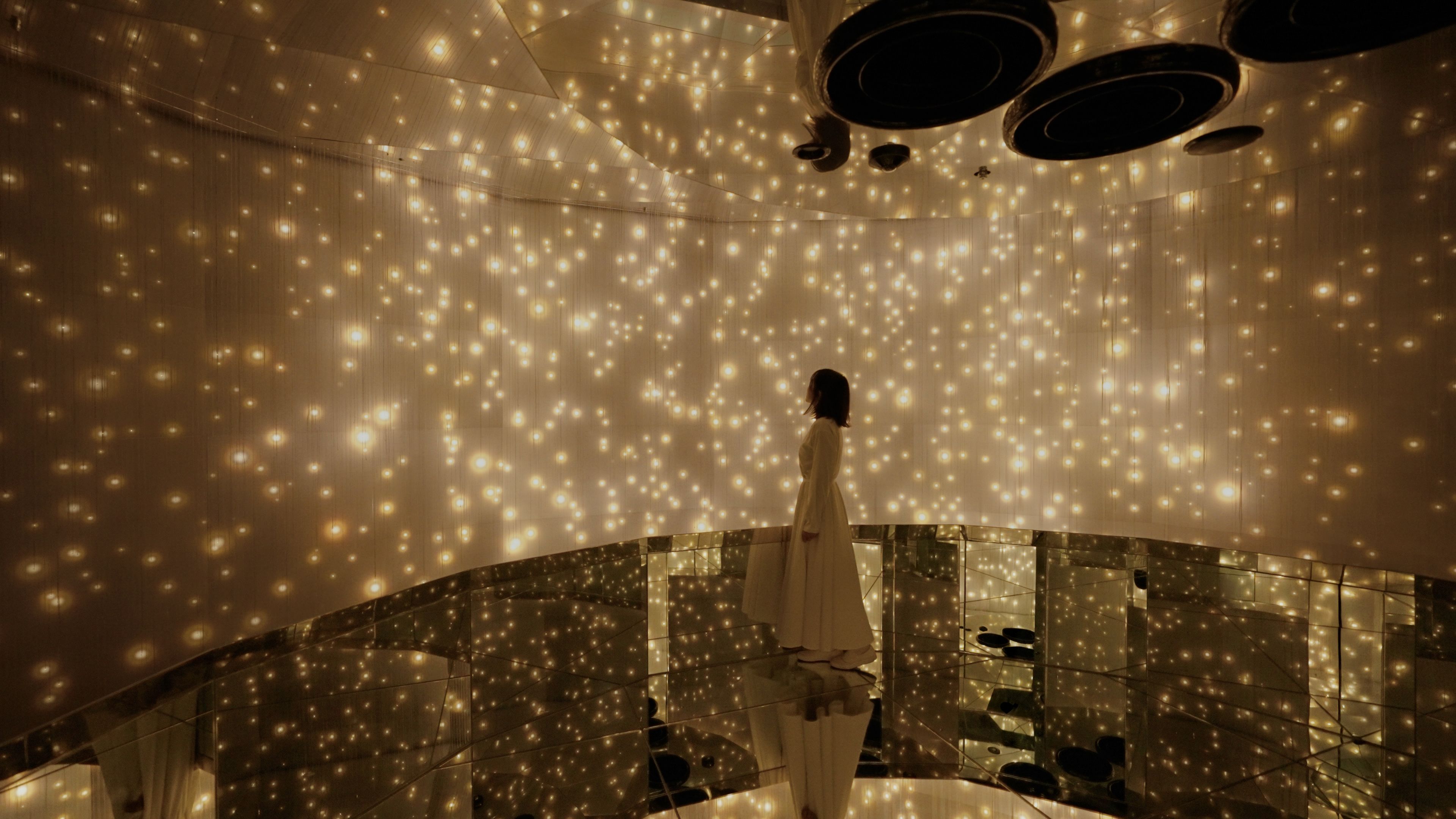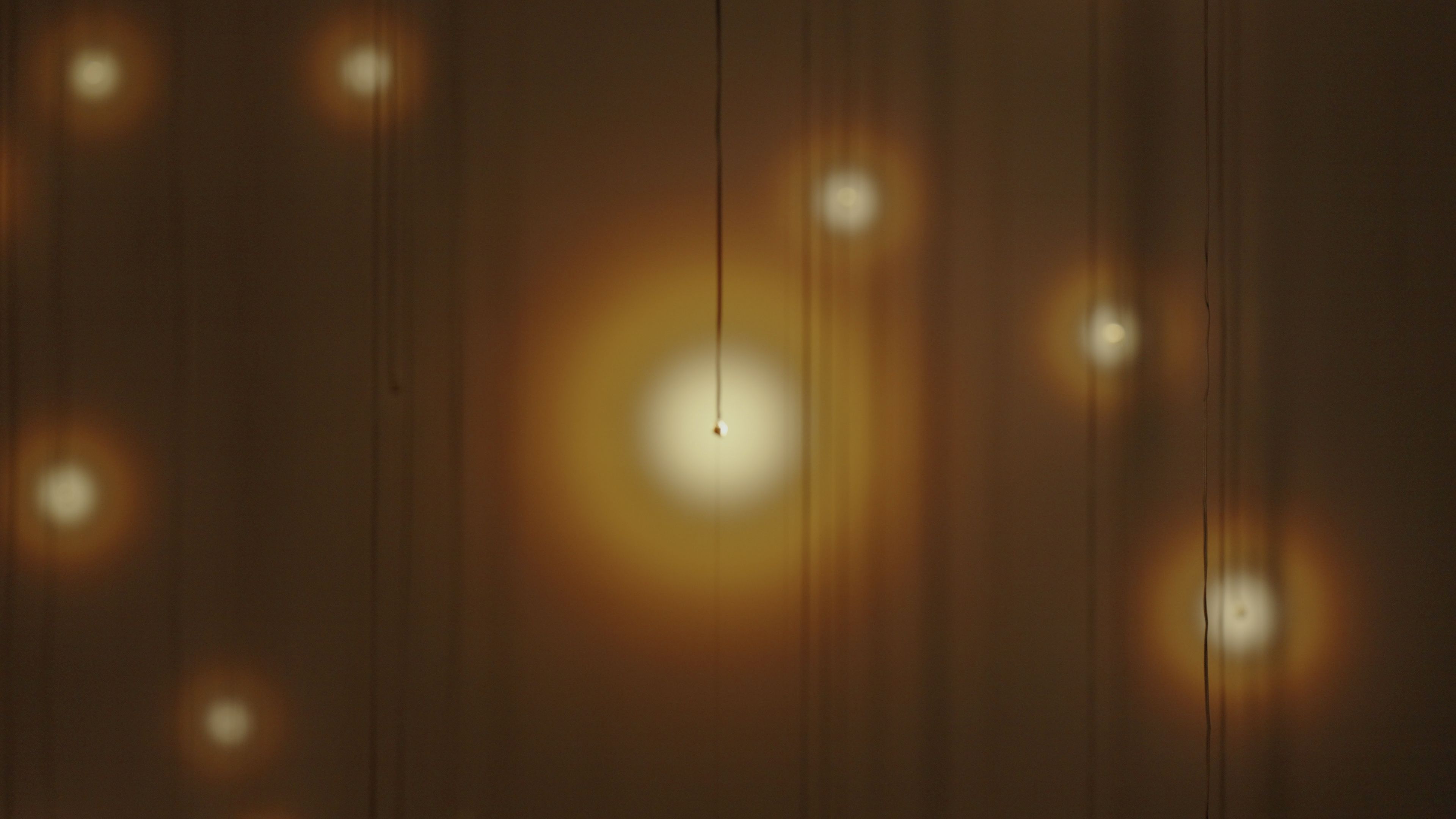Each sphere of light can be clearly perceived in the space as a mass seemingly made of solidified light, however, there is no material surface boundary. The perception of the boundary between the artwork and your body is ambiguous.