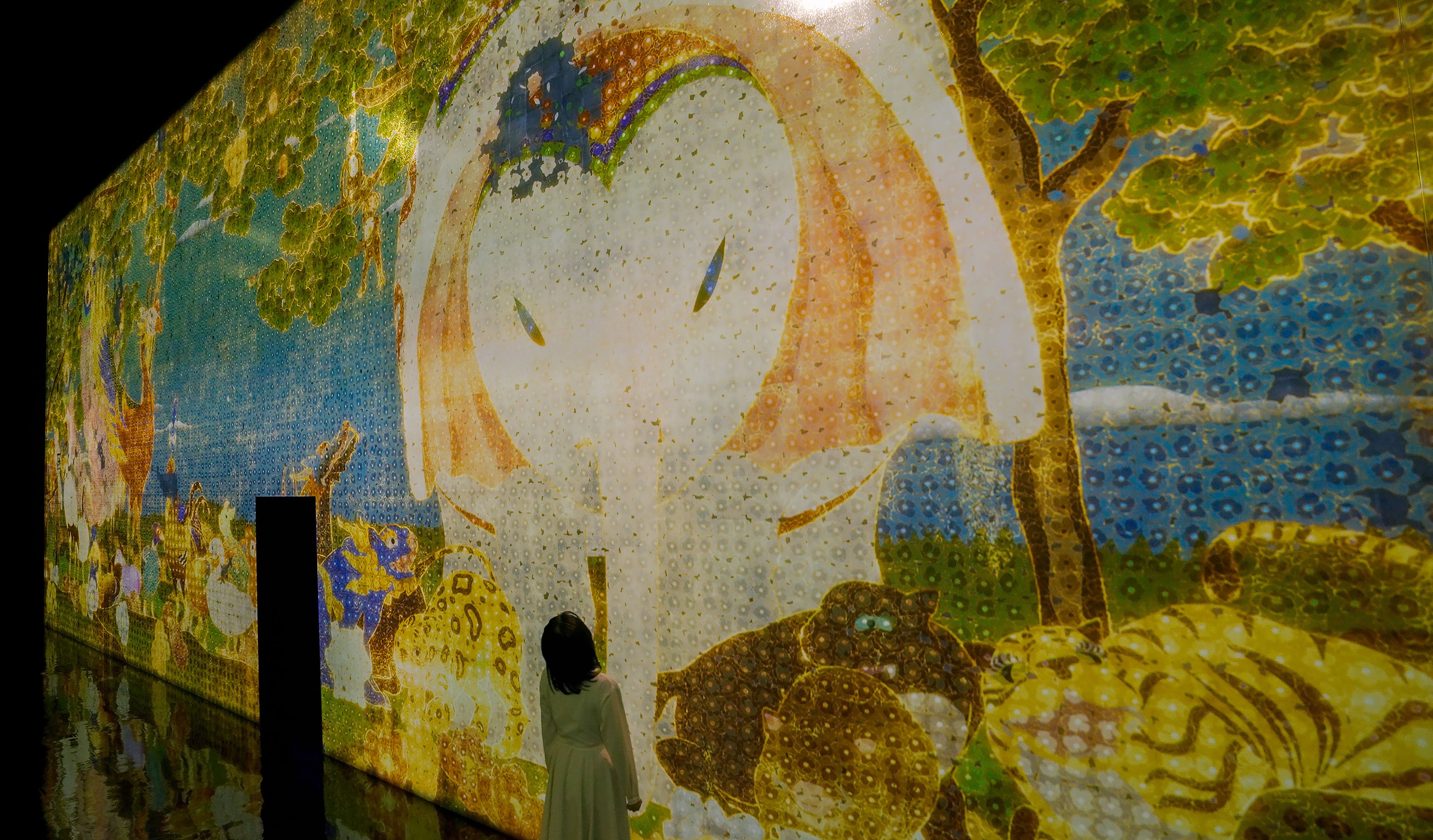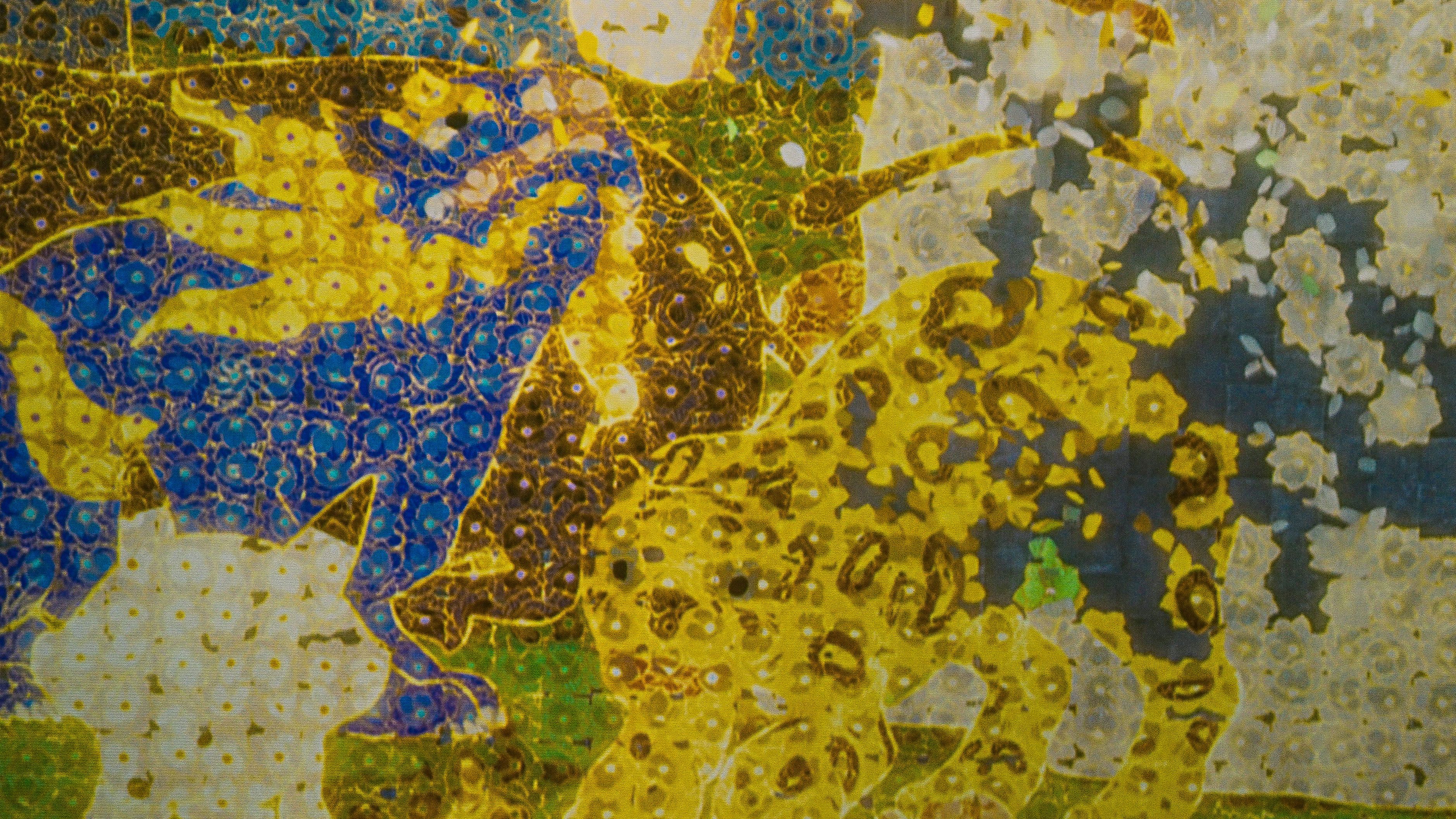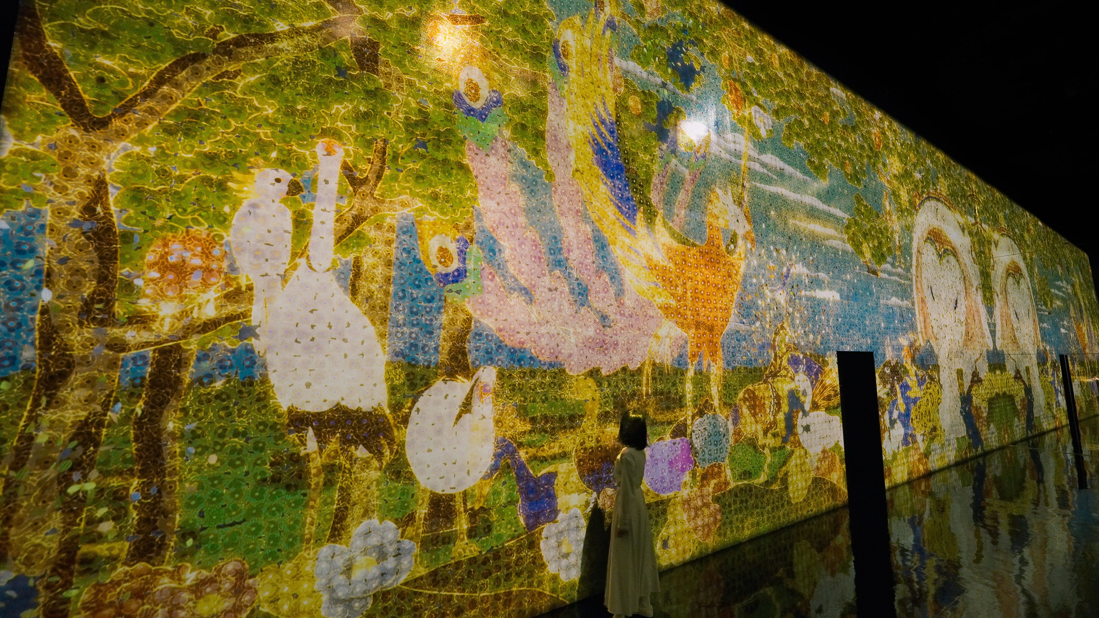Itō Jakuchū (1716–1800) was an early modern Japanese painter who was active in Kyoto in the mid-Edo period. Jakuchū has left us with a unique style of painting in which the surface is made up of a grid of tens of thousands of squares that are individually colored. Nirvana was inspired by the screen paintings Birds, Animals, and Flowering Plants and Trees, Flowers, Birds and Animals.
