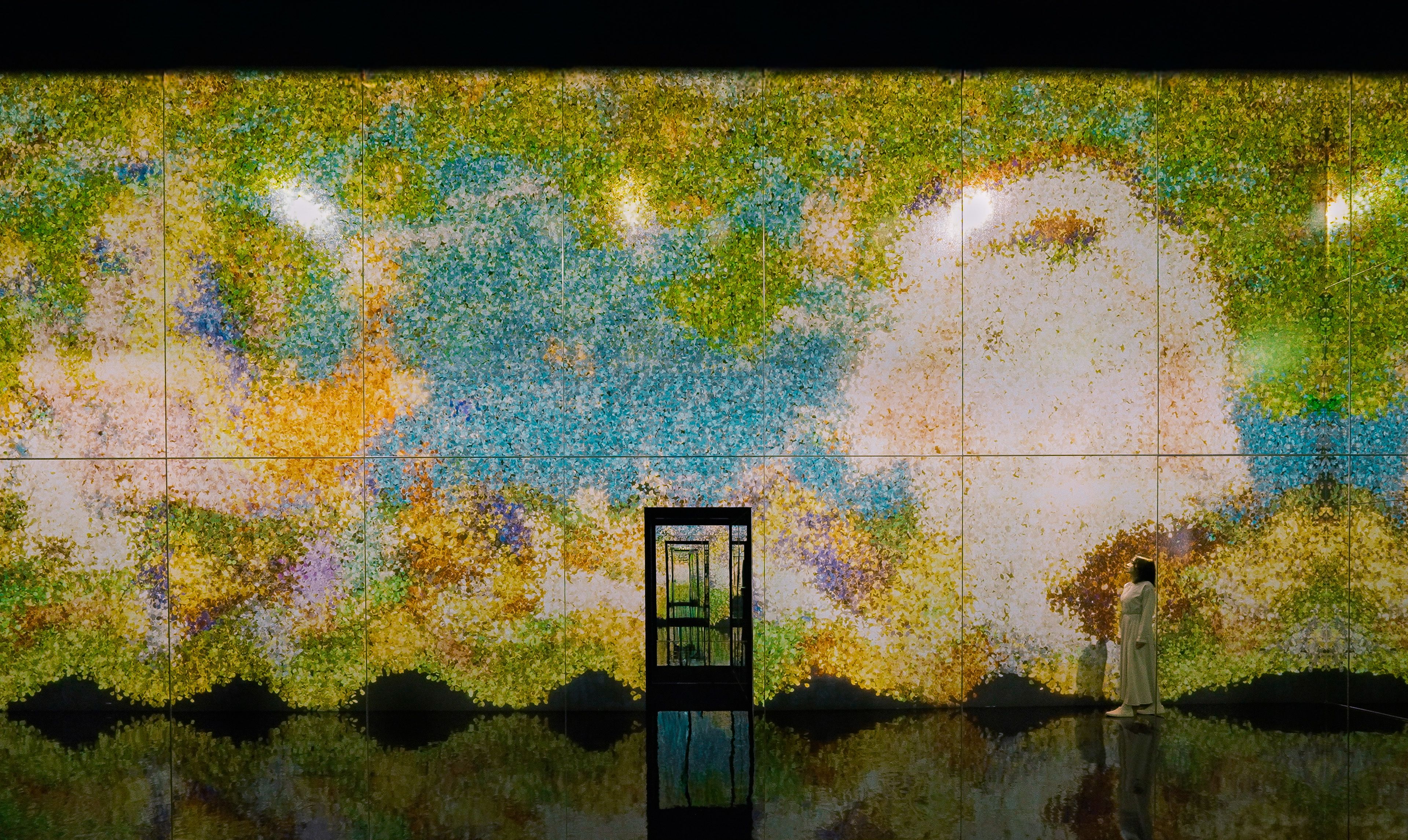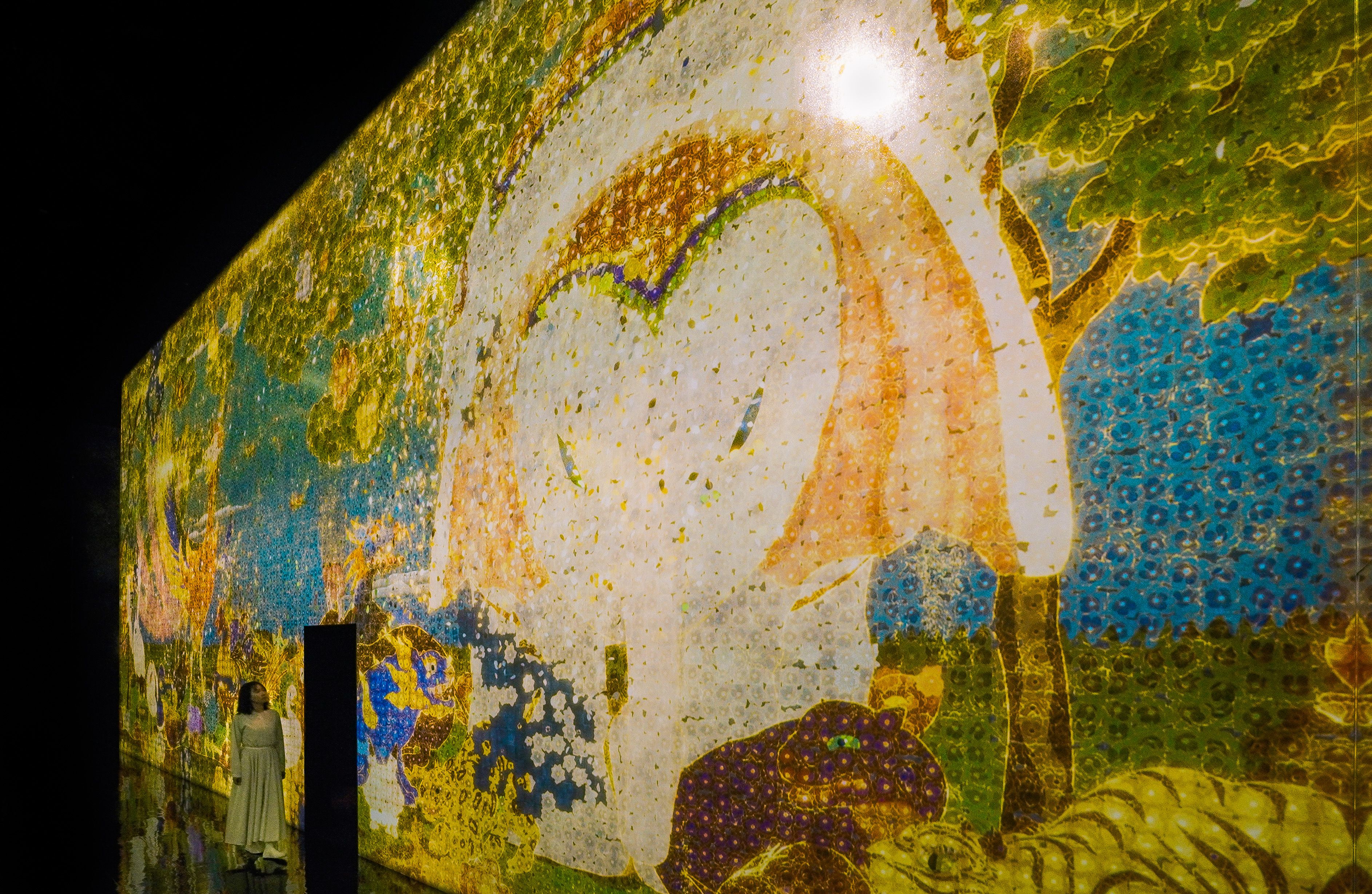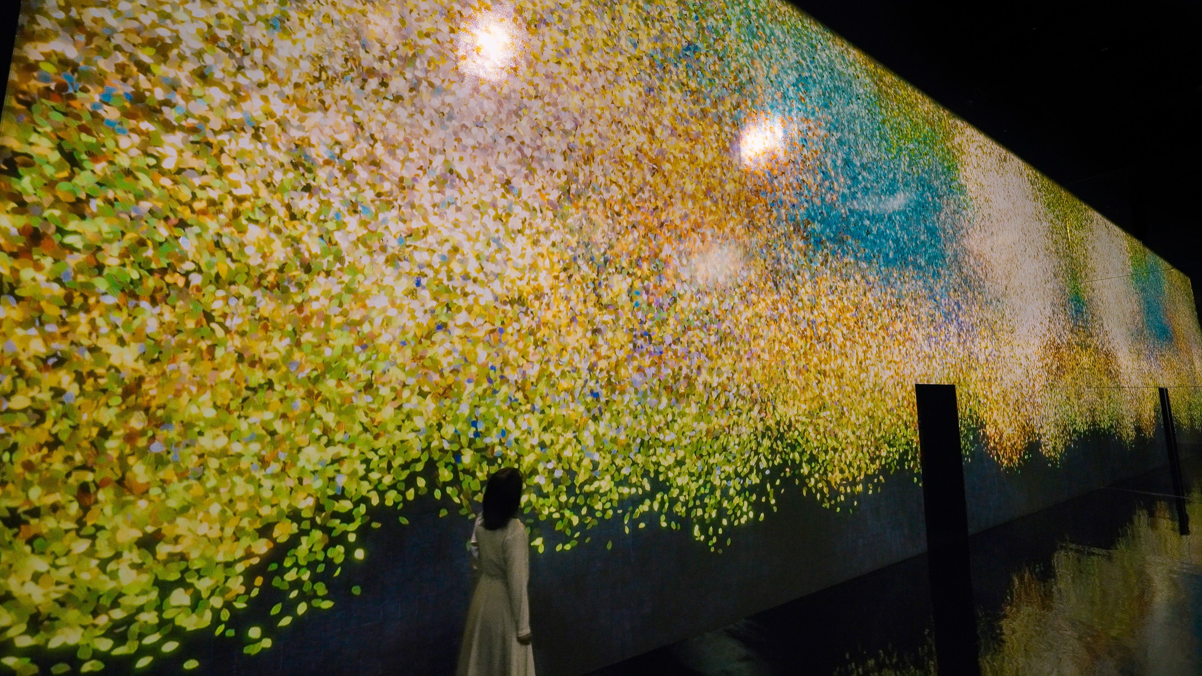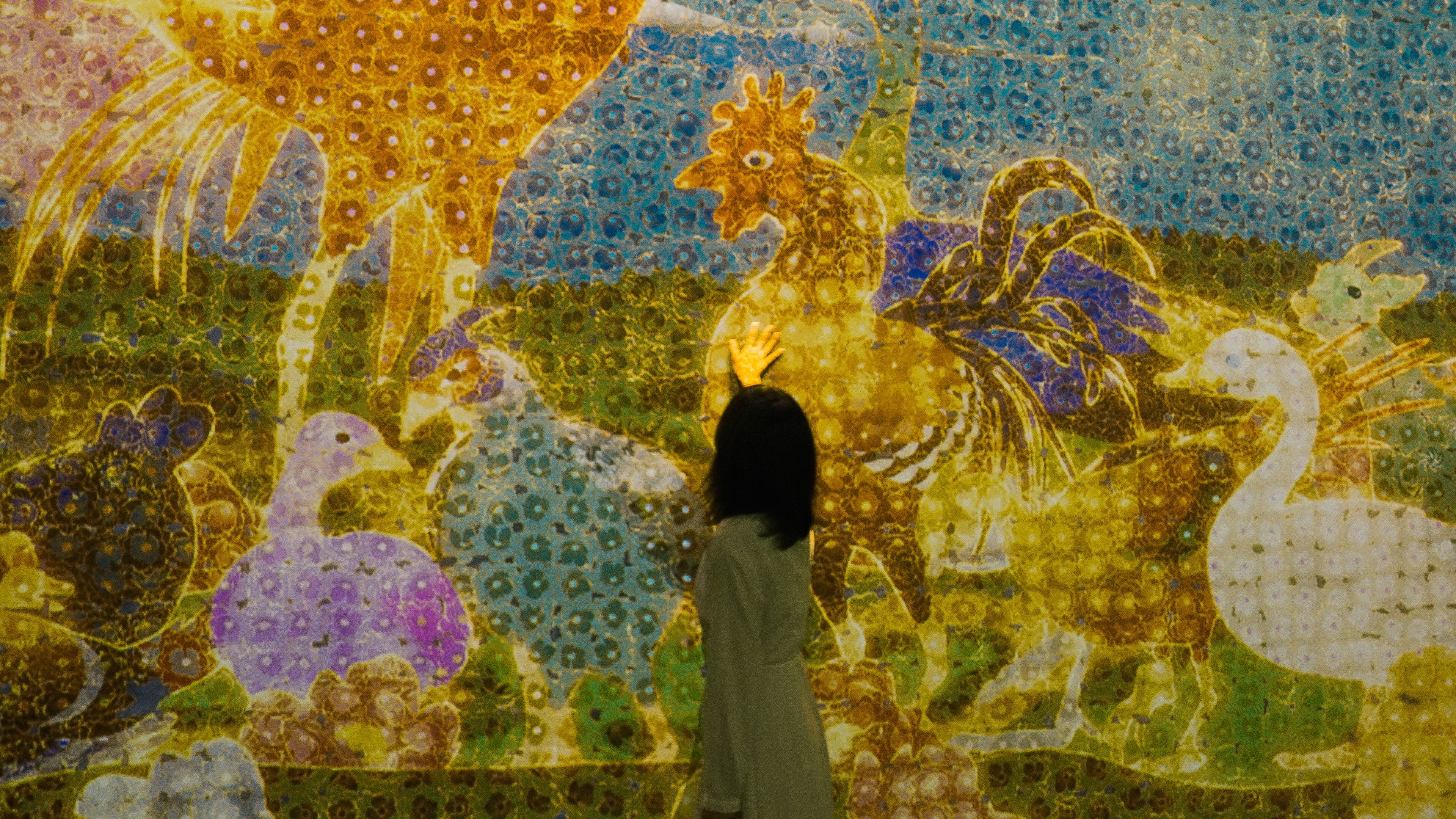 As the animals move while the flowers on the screen remain fixed, the coloring of the flowers moves on a different time axis to the space of the artwork. When viewed as a whole from a distance, the bright colors created by visual mixing represent the world of plants and animals in a space moving on a slow time axis. When viewed up close, the highly saturated colors broken down by the lines that draw the flowers represent the world of flowers changing on a fast time axis. The faint sparkle on the work represents a world between the viewer and the world of the work, which changes on the time axis of the viewer's own physical movements. Three space-times overlap.