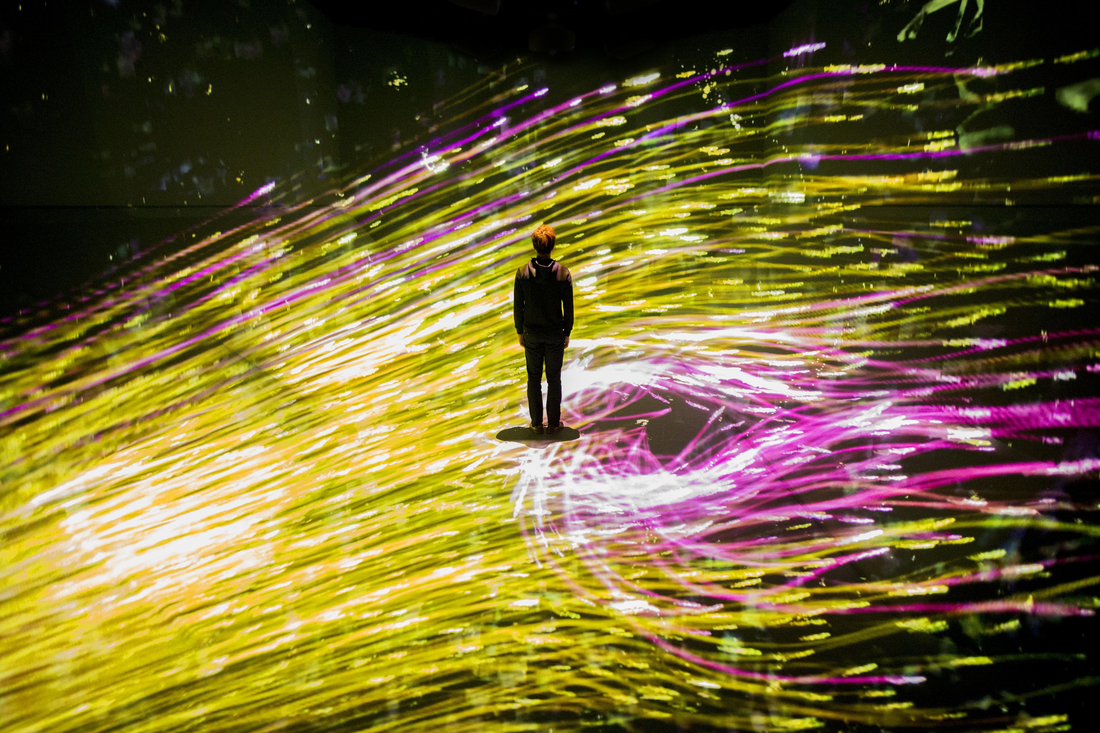 The shoal of fish rendered in light moves freely through the space, leaving trails of light. They sense people’s presence and try to avoid colliding with them. People who enter this space are assigned a certain color, and when a fish passes by a person, it takes on the same color.