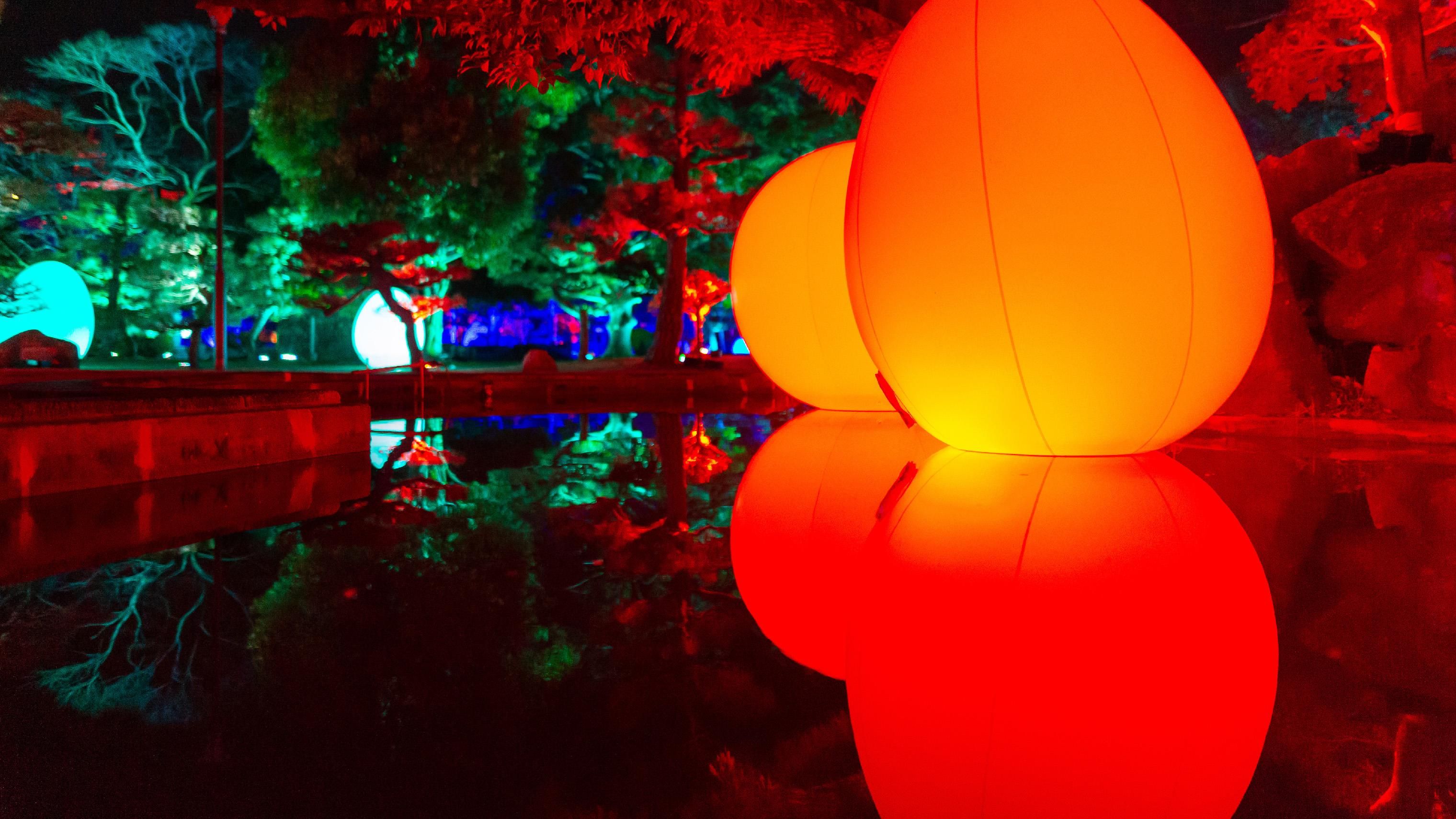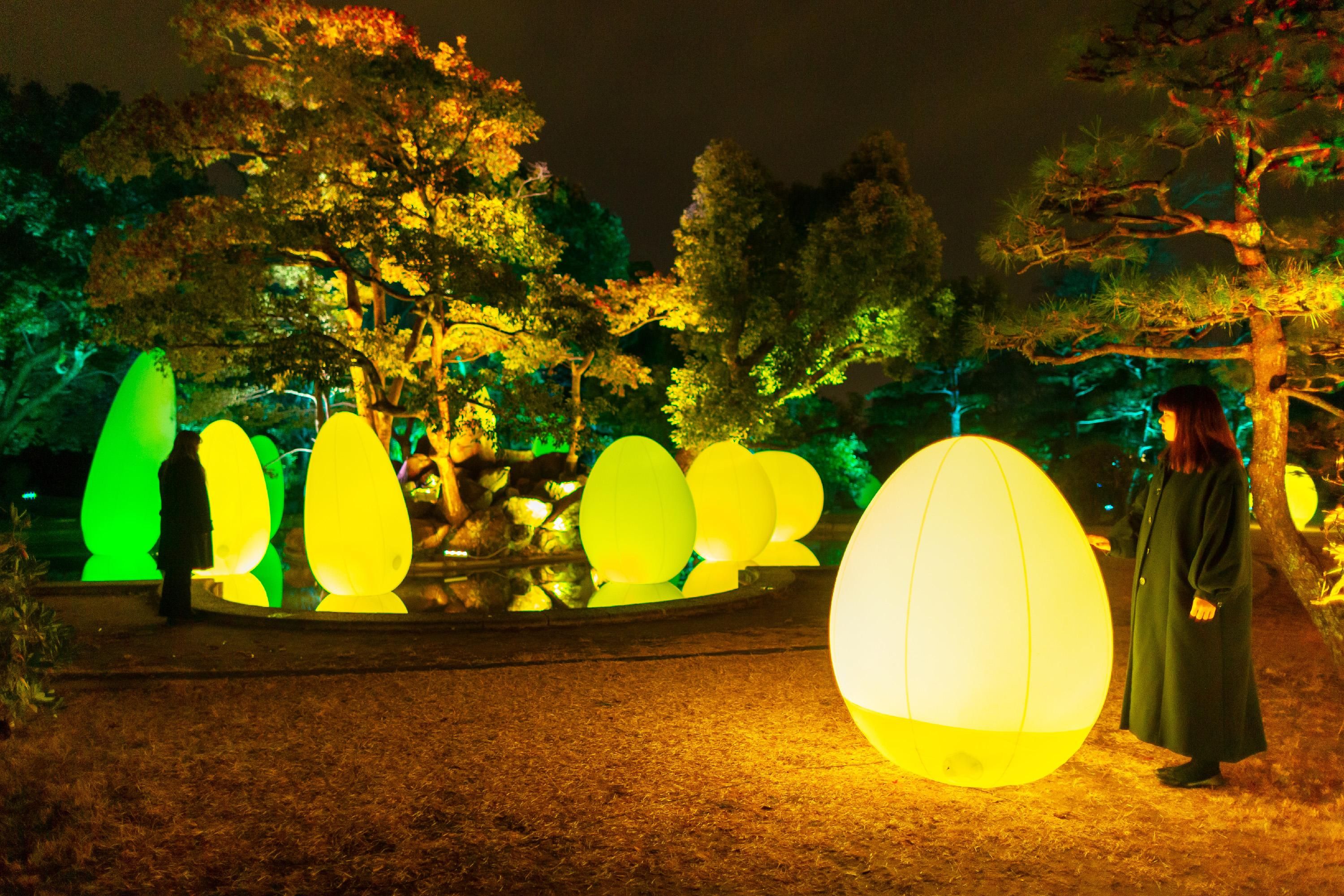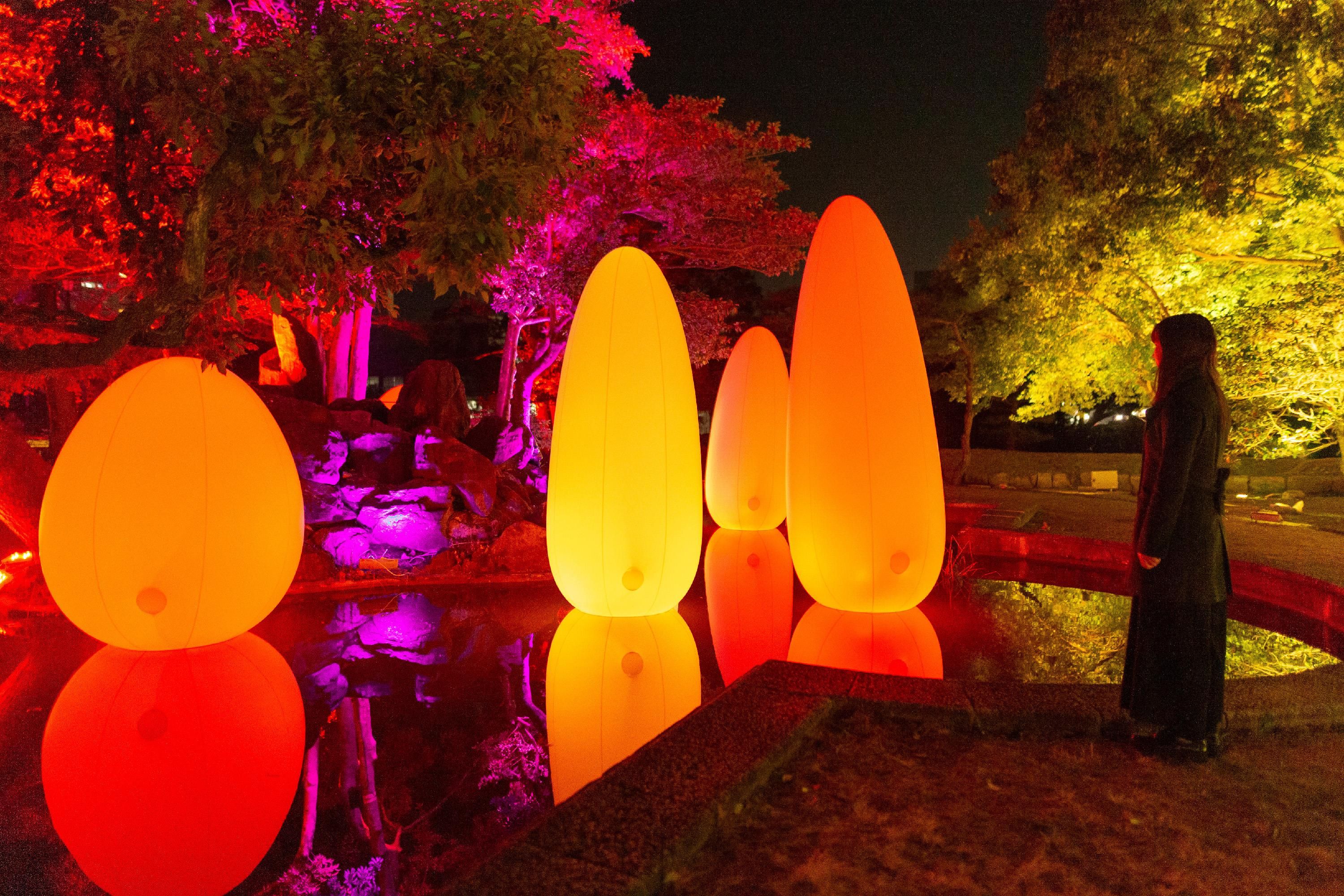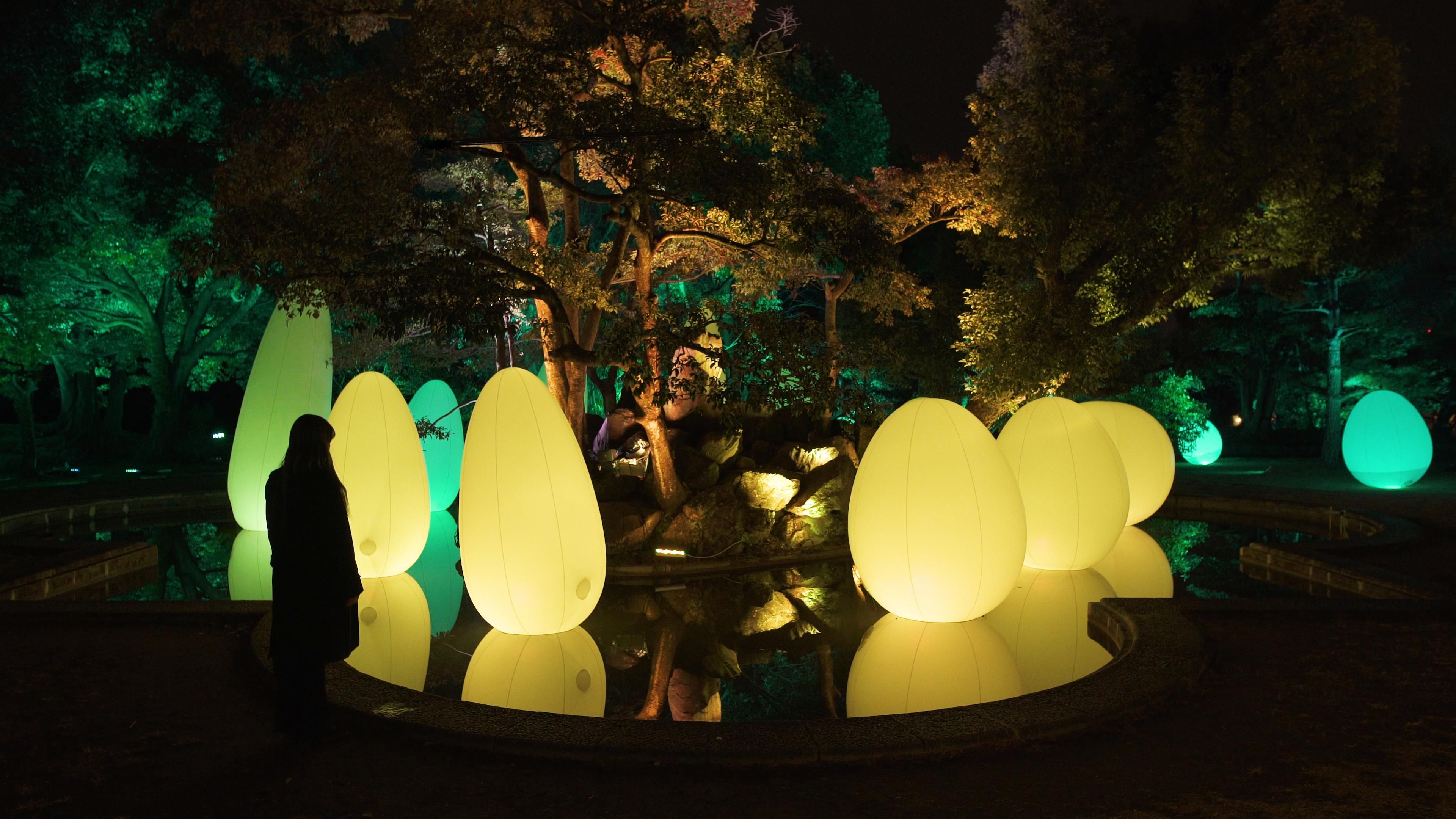 The resisting and resonating ovoids stand on the water of the cherry blossom pond. The ovoids are autonomous, they shine brightly and then fade as if slowly breathing.