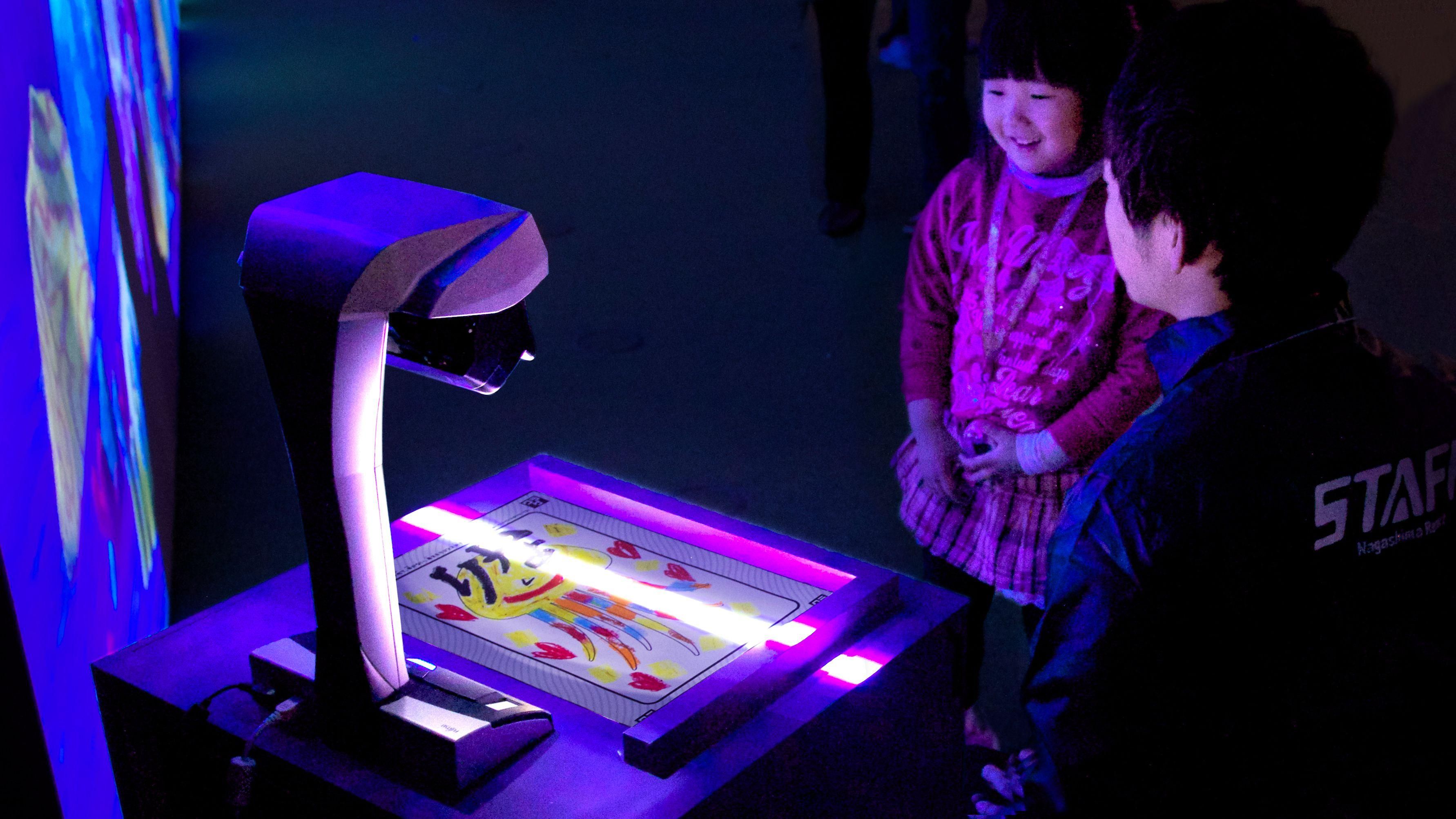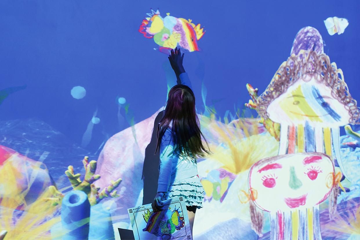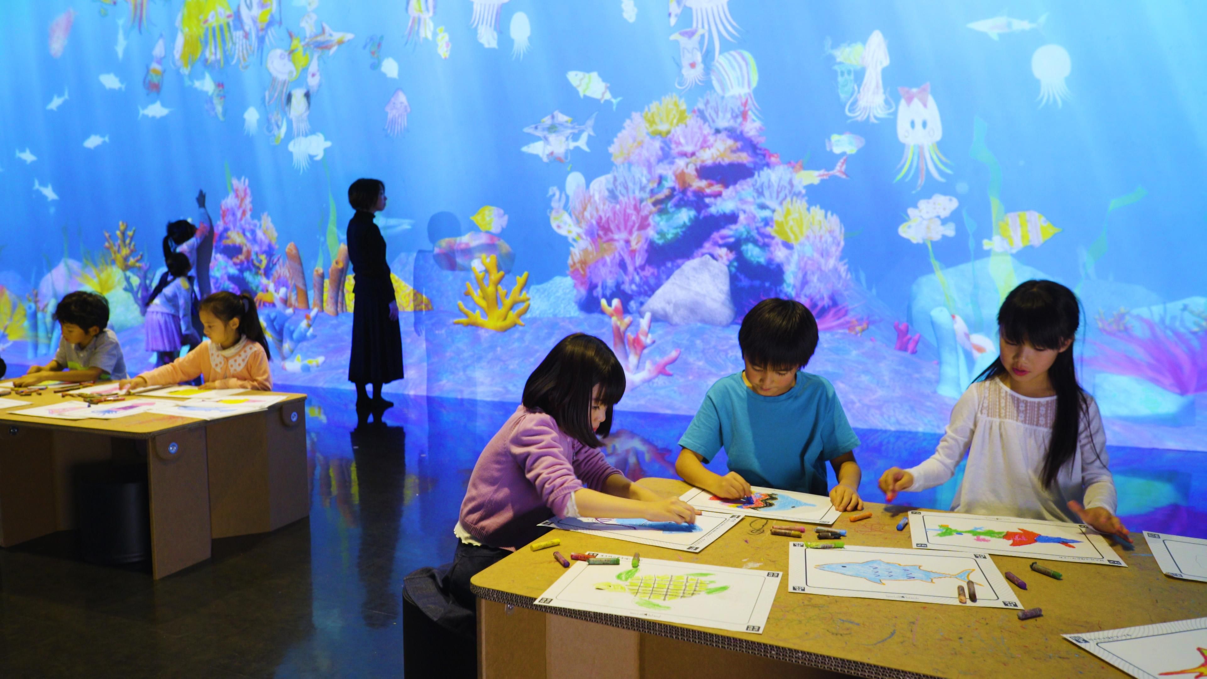 Color in a fish on the paper provided, and see the picture you have drawn come to life, swimming out into the massive aquarium in front of you together with the fish drawn by other people. If you touch the swimming fish, they will swim away. You can also feed the fish by touching the food bags.