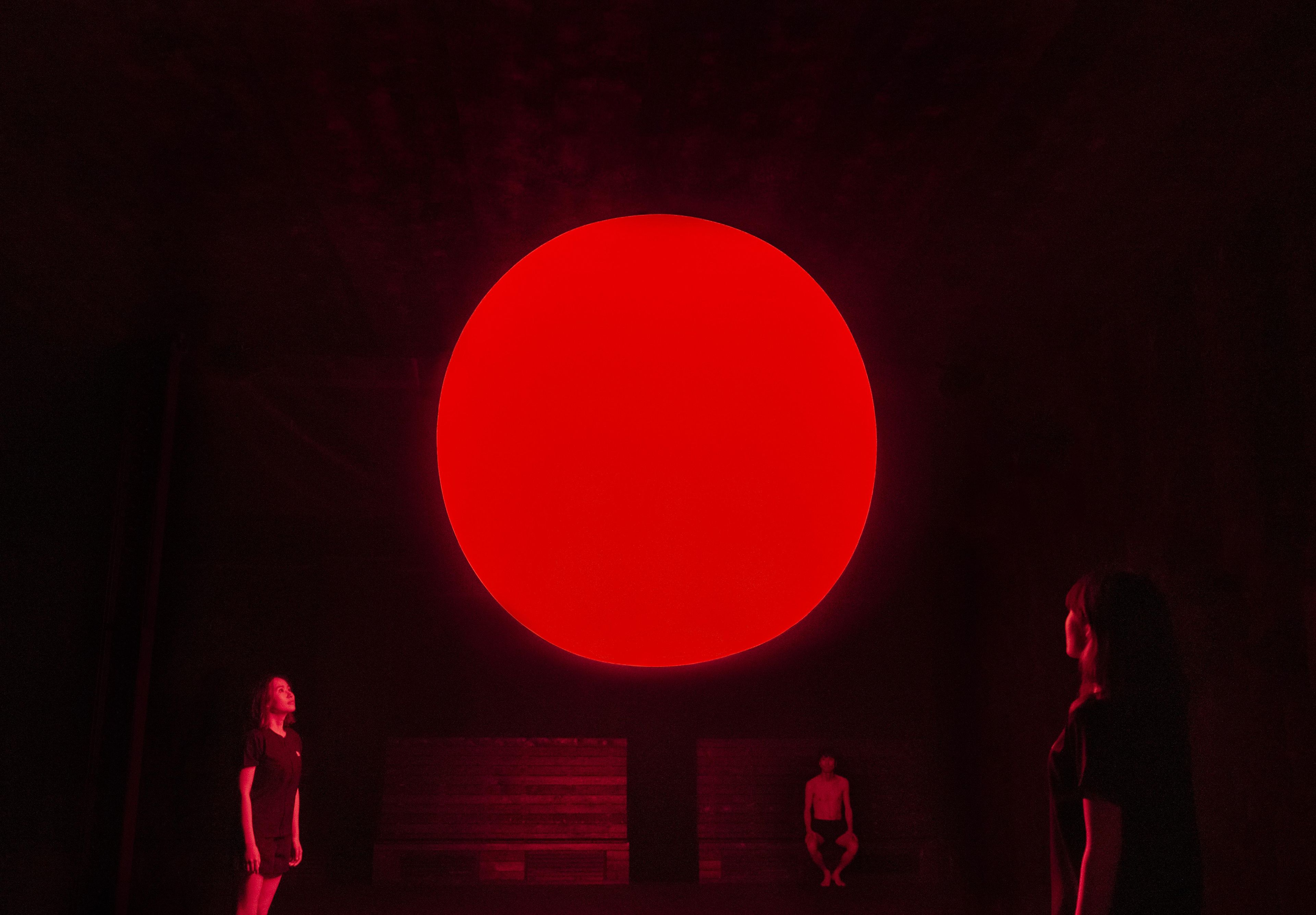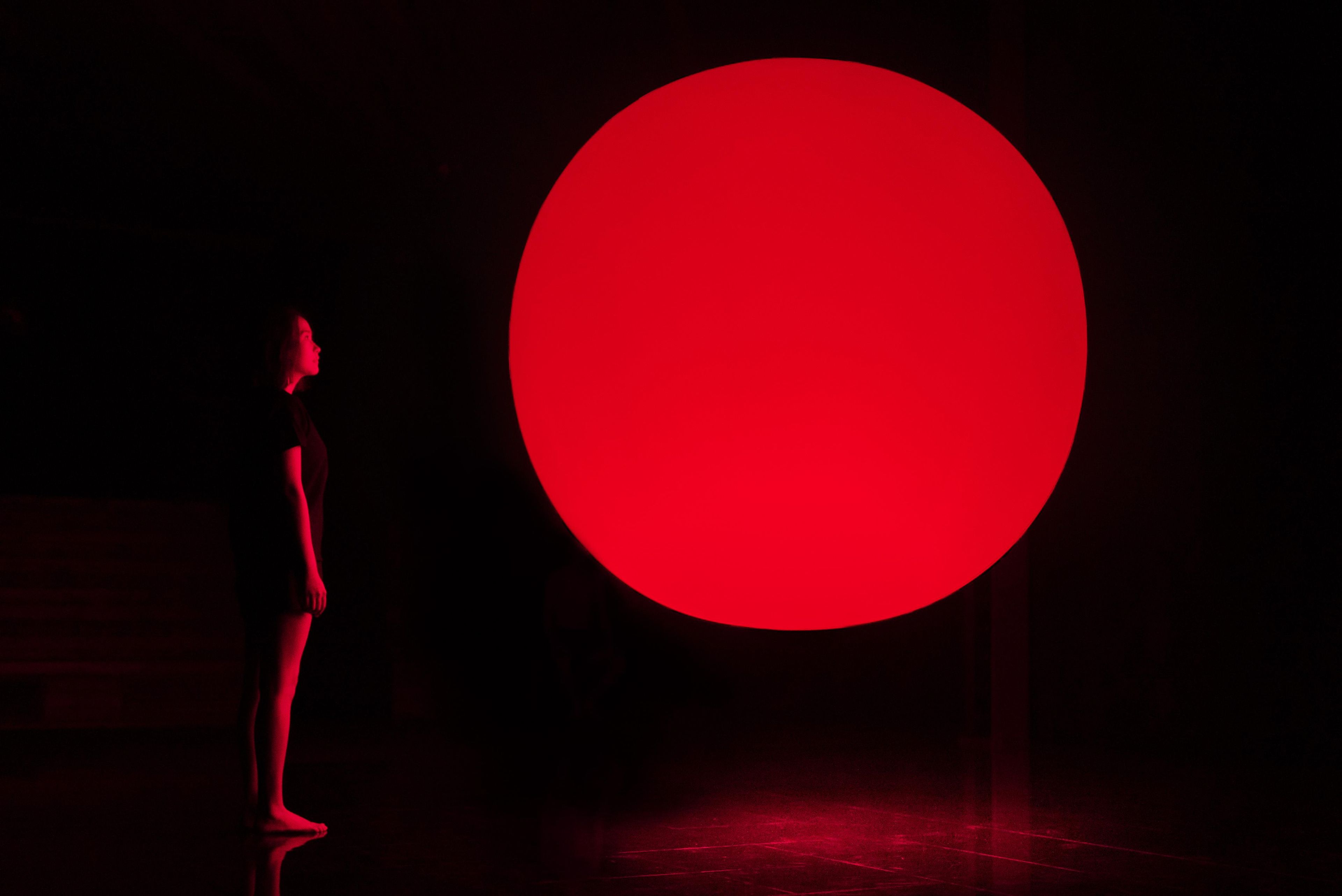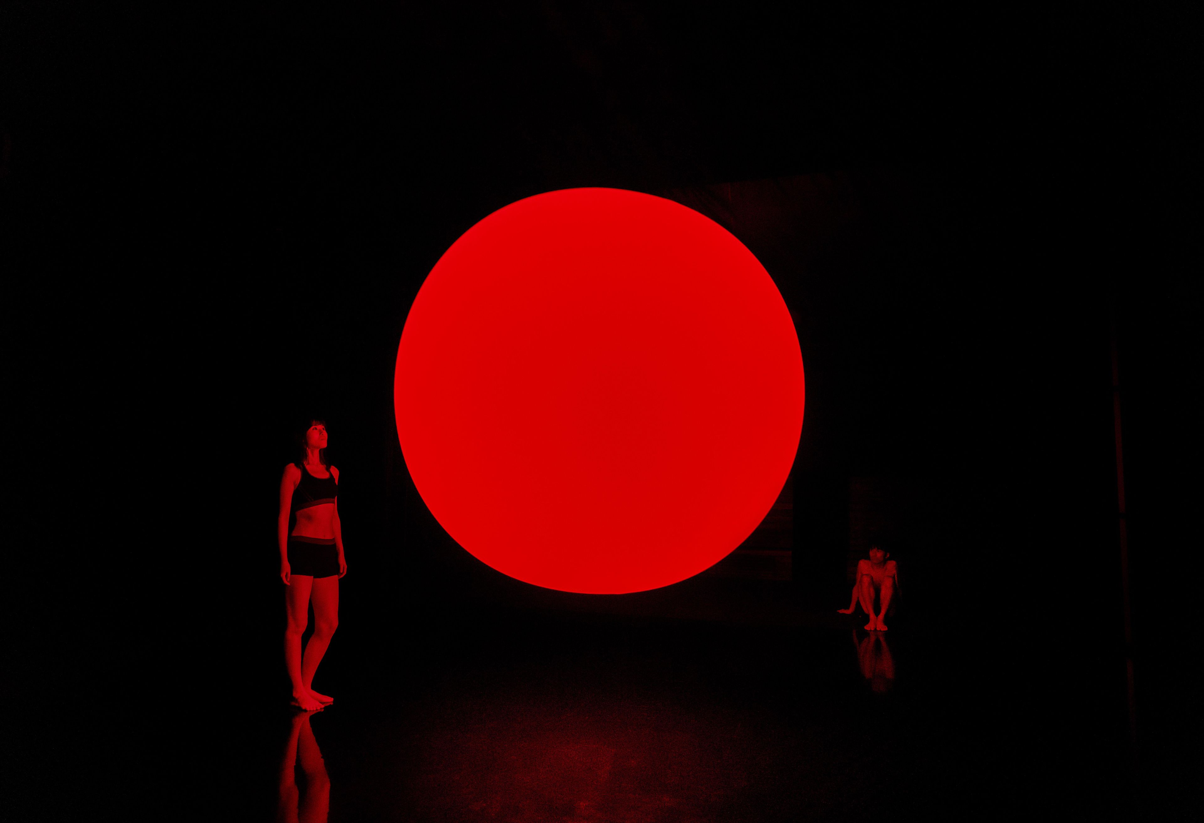 The sphere is not supported by anything. Nevertheless, through the order of energy, the sphere transcends the concept of mass: it levitates in the space between the floor and ceiling, floating up and down. When a person taps the sphere, it floats away, falls to the ground, and rolls away. But if there is no external interference, it will slowly rise into the air again, as though restoring itself to its original state.
