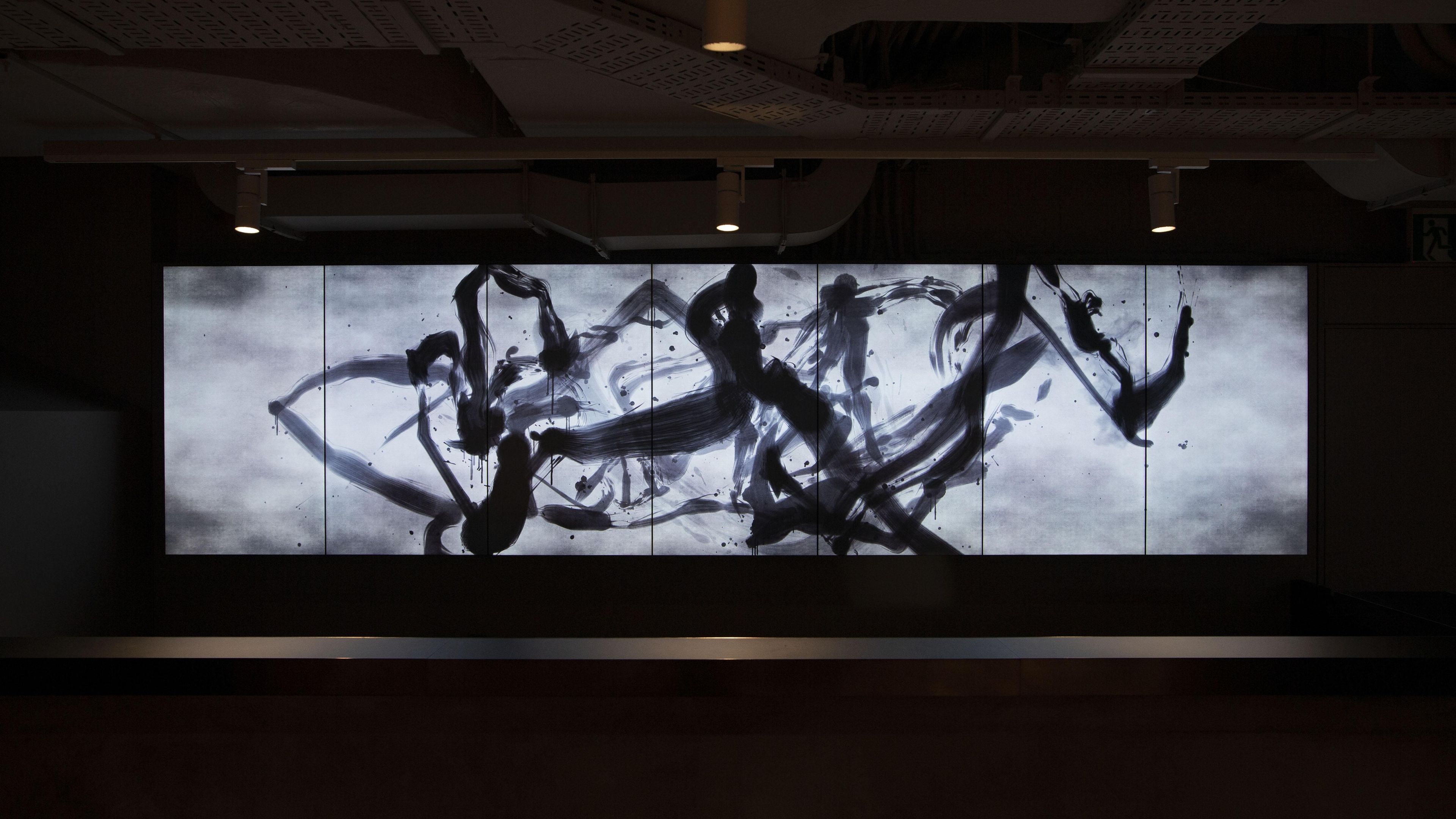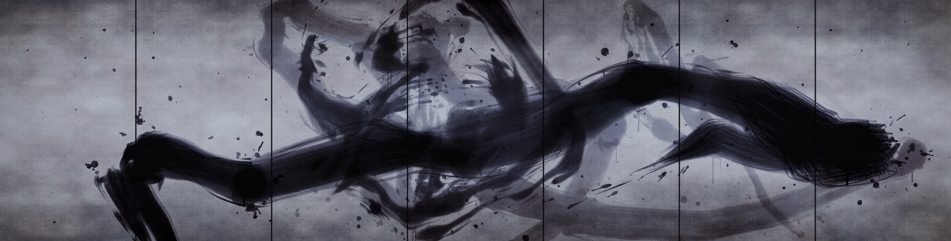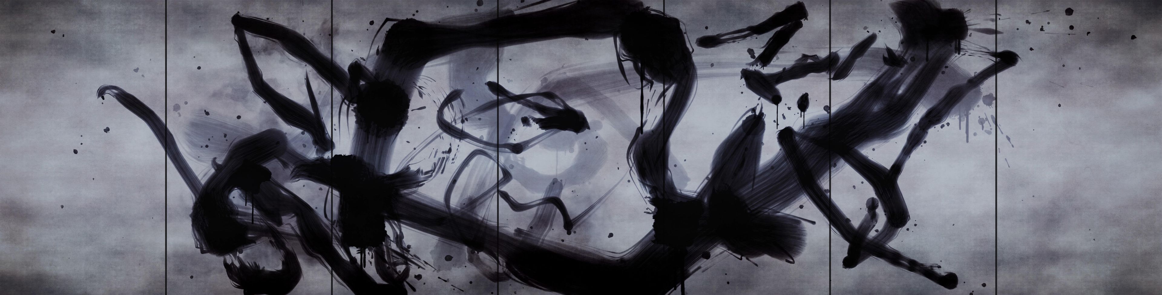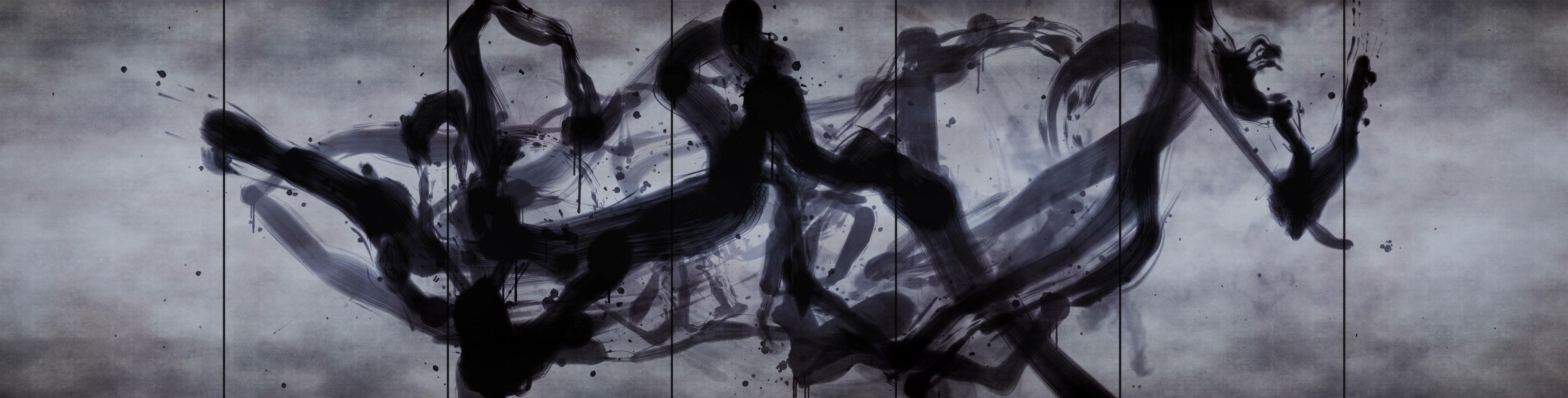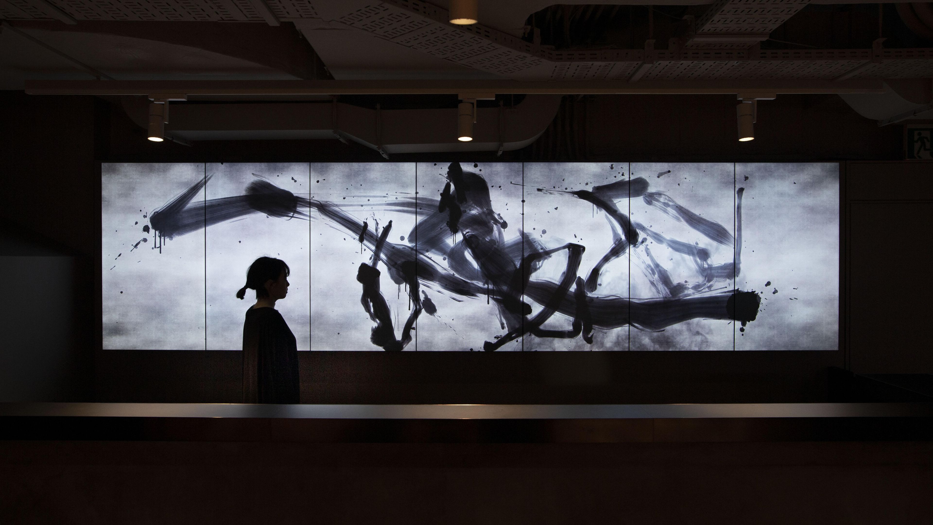 Spatial Calligraphy is a form of calligraphy drawn in space that teamLab has been exploring since it was founded. The artwork reconstructs calligraphy in three dimensional space to express the depth, speed and power of the brush stroke, and that calligraphy is then flattened using the logical structure of space that teamLab calls Ultrasubjective Space. The calligraphy shifts between two and three dimensions.