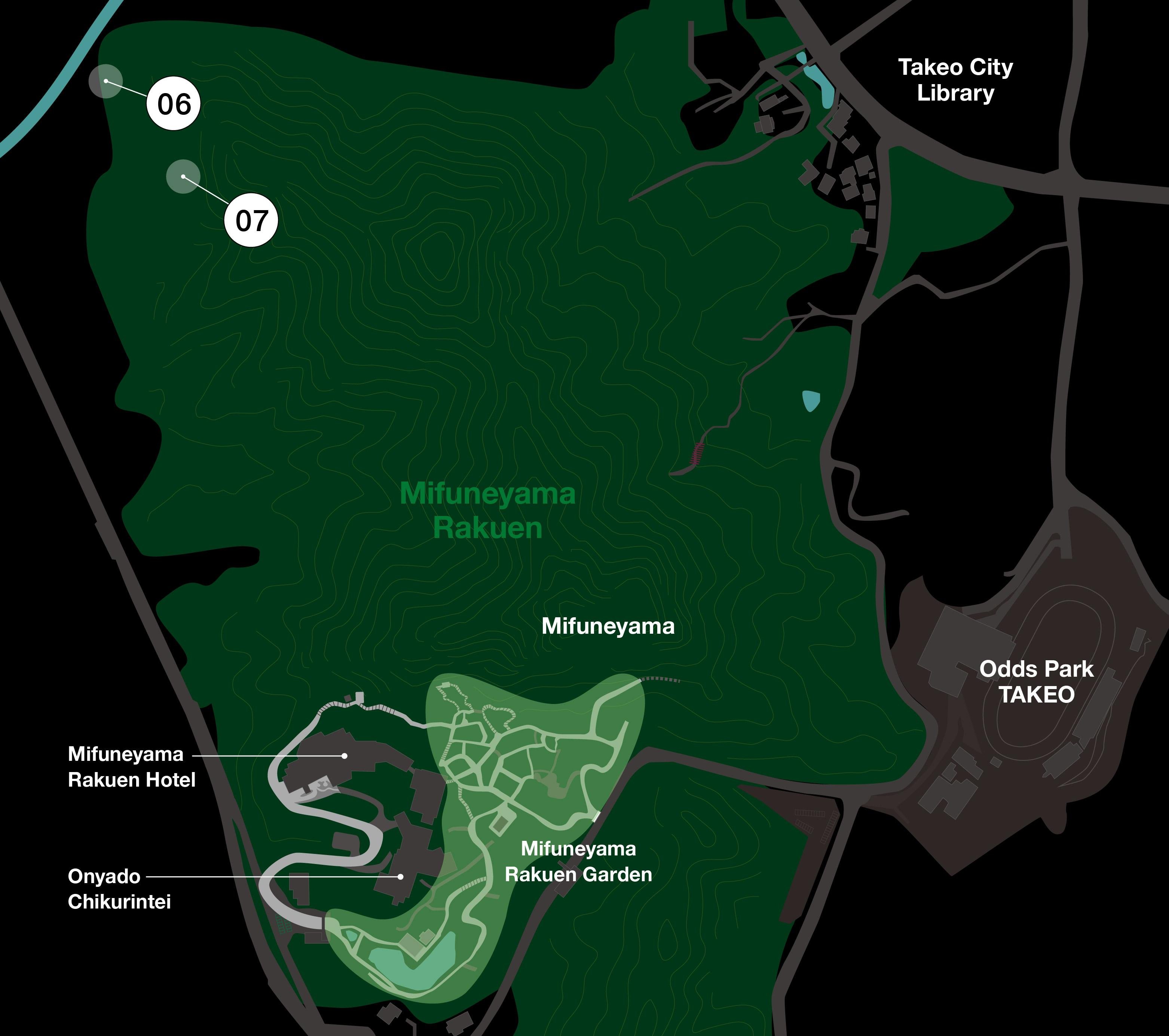 The 500,000 square meter Mifuneyama Rakuen Park was created in 1845, during the end of the Edo period. Sitting on the borderline of the park is the 3,000-year-old sacred Okusu tree of Takeo Shrine, which is Japan’s 7th largest. Also in the heart of the garden is another 300-year-old sacred tree. Knowing the significance of this, our forebears turned a portion of this forest into a garden, utilizing the trees of the natural forest. The border between the garden and the wild forest is ambiguous, and when wandering through the garden, before they know it, people will find themselves entering the woods and animal trails.
