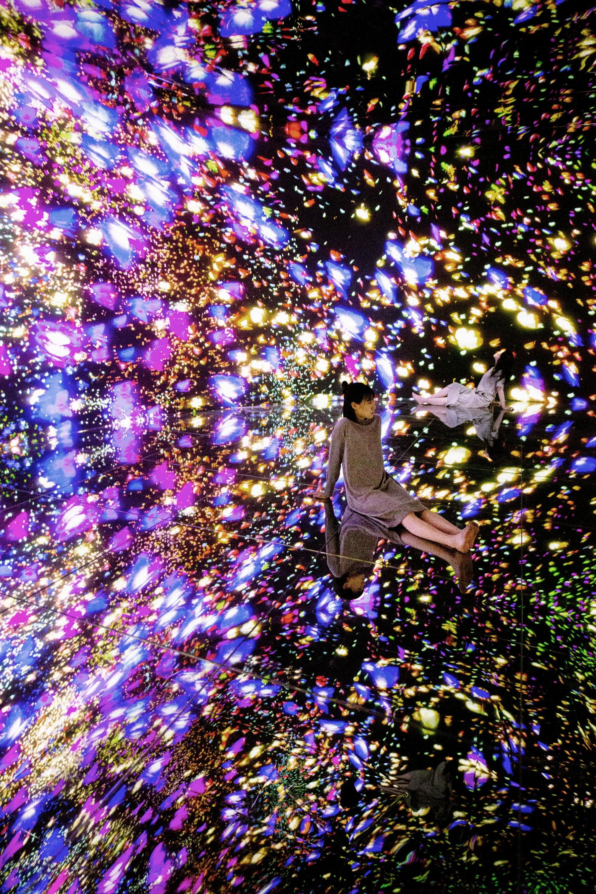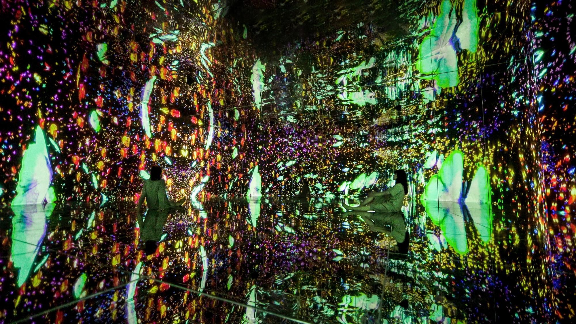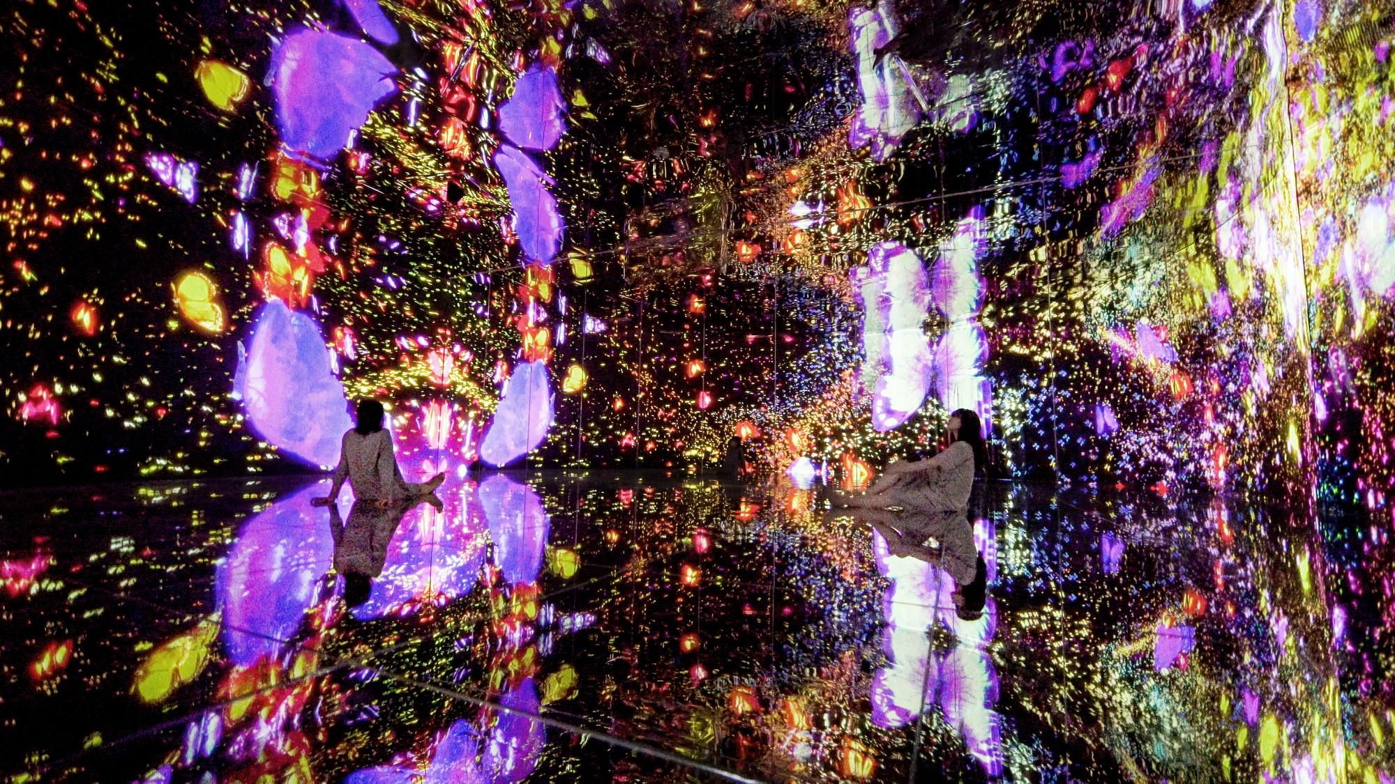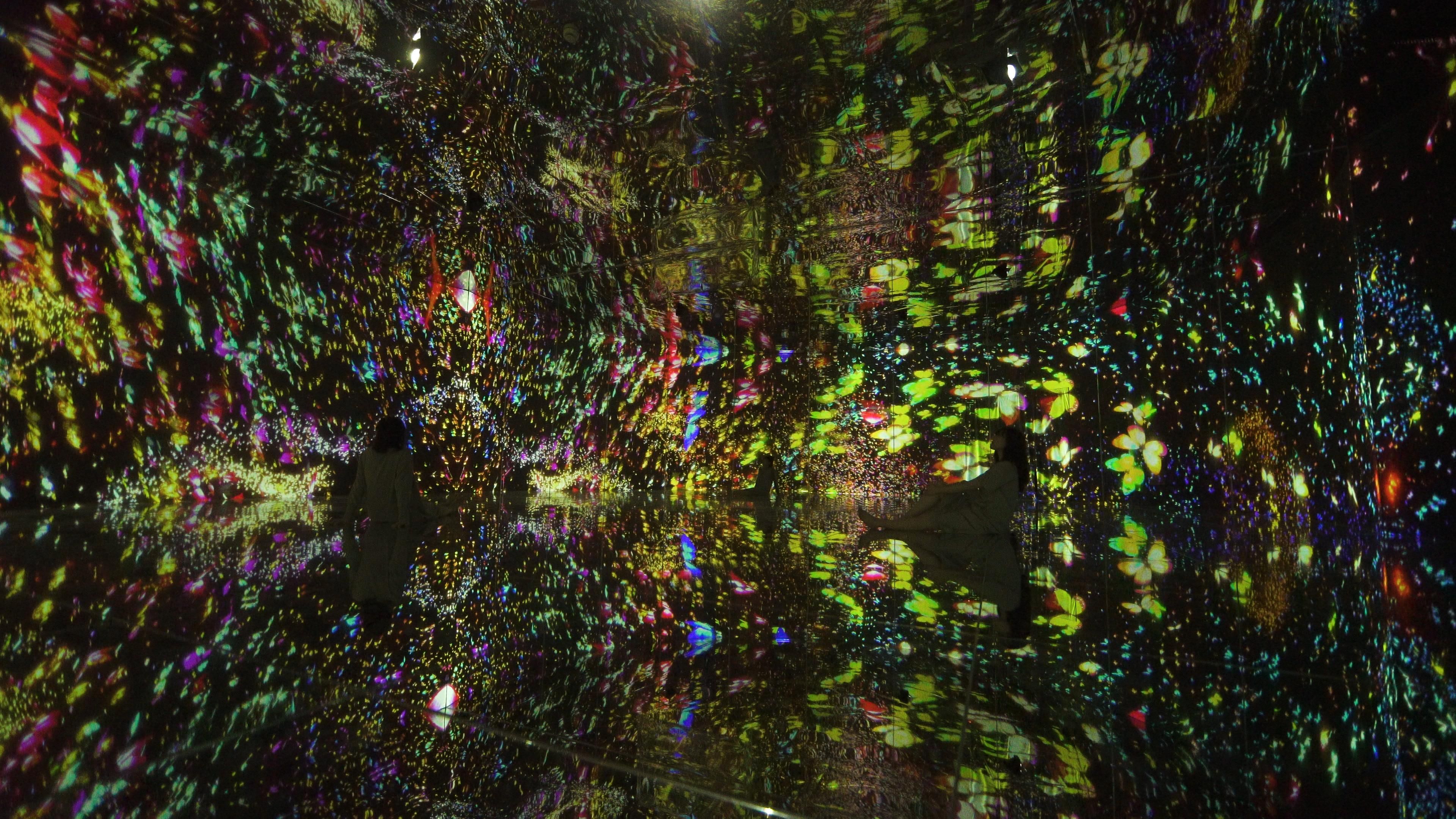 The artwork begins when the Flutter of Butterflies Beyond Borders enters the Continuous Small Universe space in teamLab Borderless. When other works enter the space, the flutter of butterflies leaves.