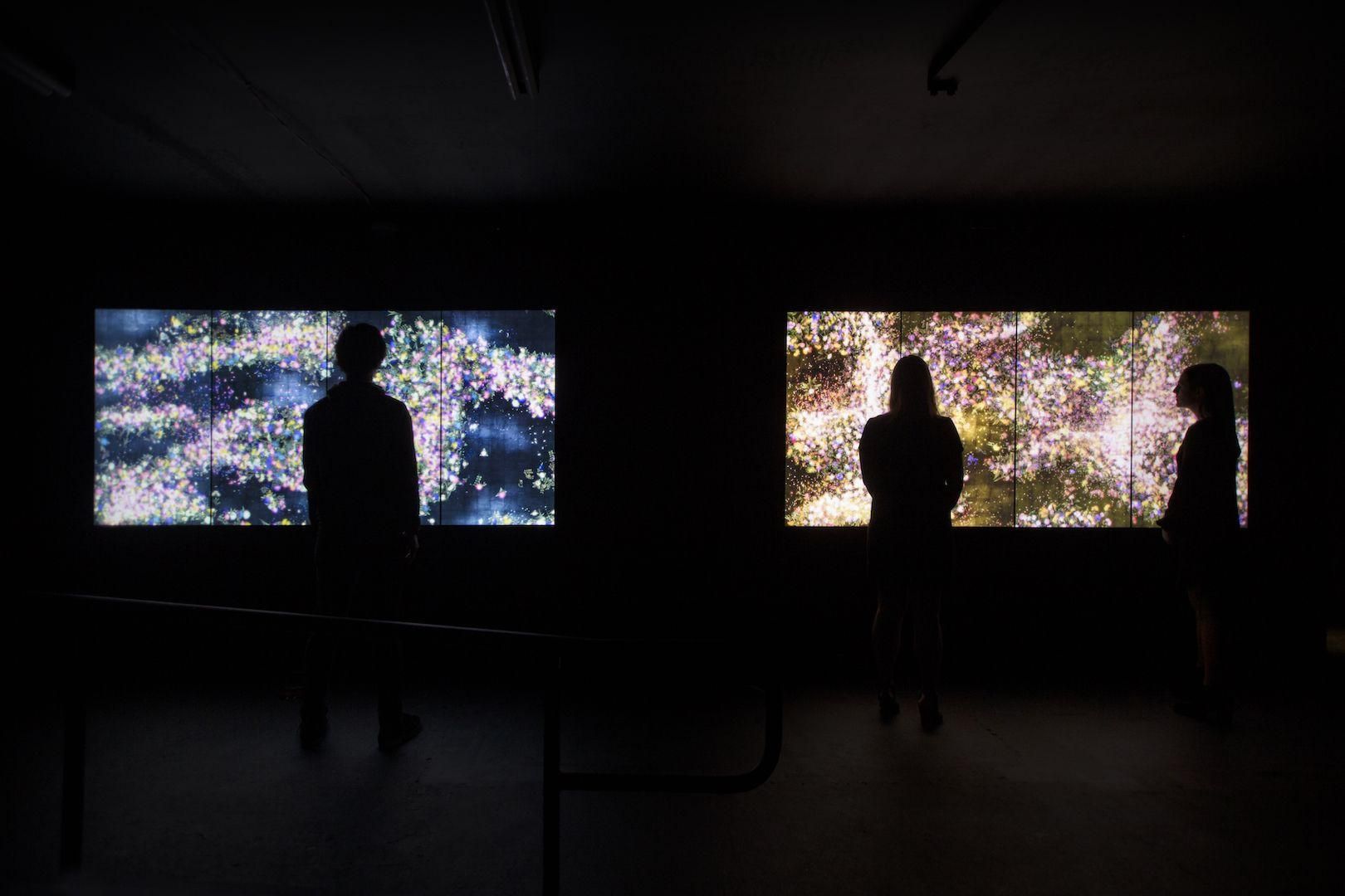 The artwork is not a pre-recorded image that is played back: it is created by a computer program that continuously renders the work in real time. The interaction between people and the installation causes continuous change in the artwork: previous visual states can never be replicated, and will never reoccur. The picture at this moment can never be seen again.