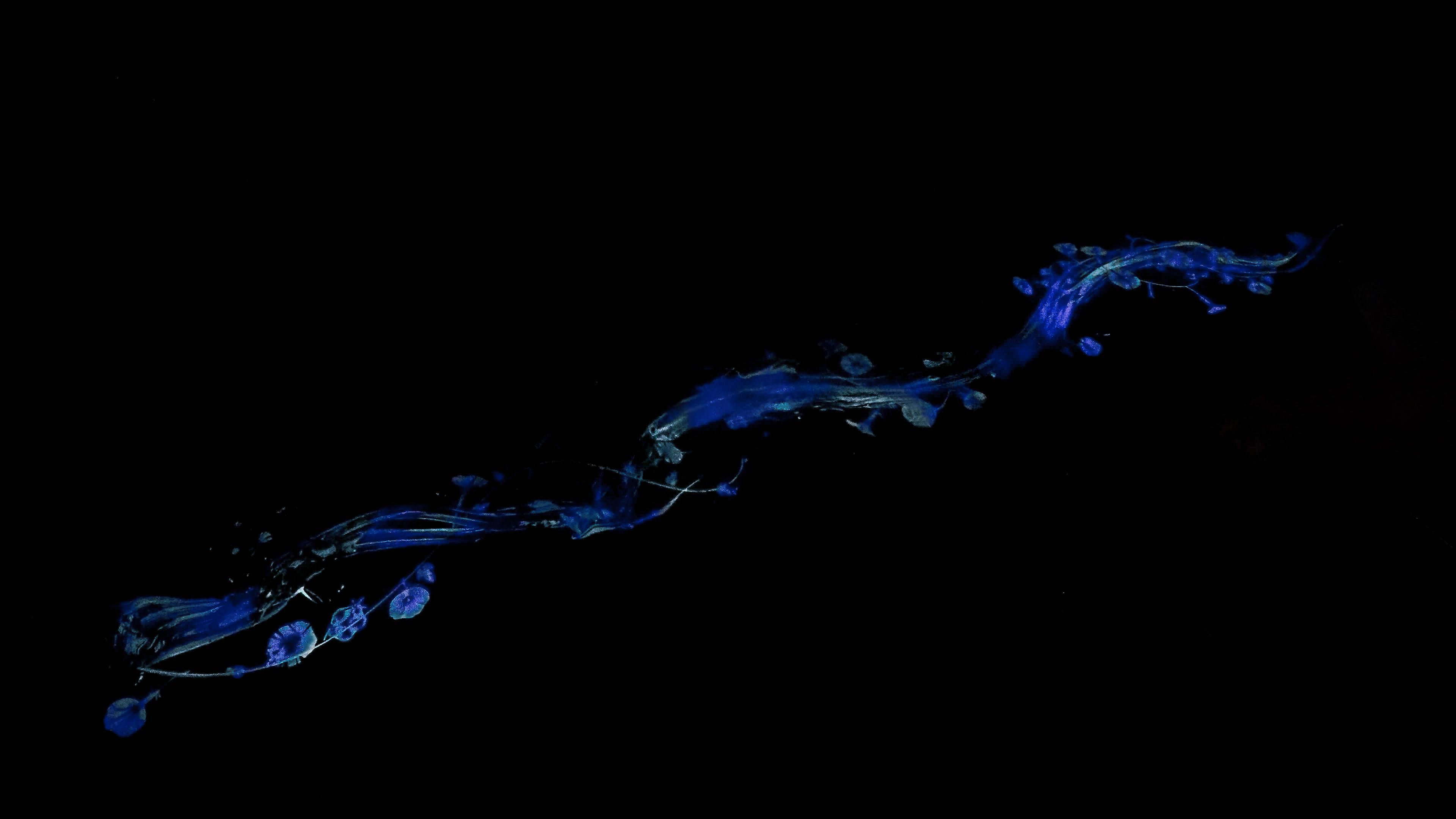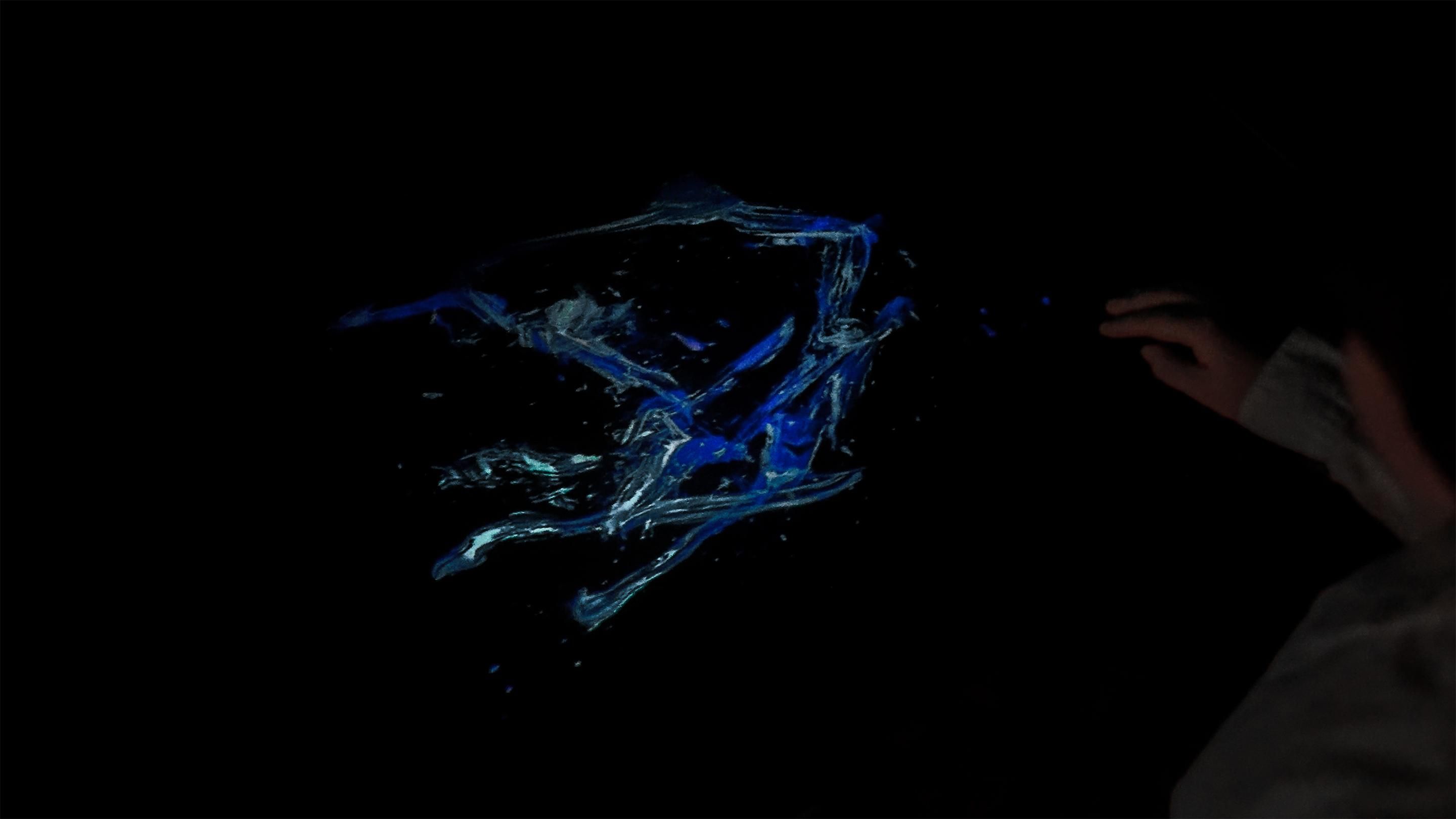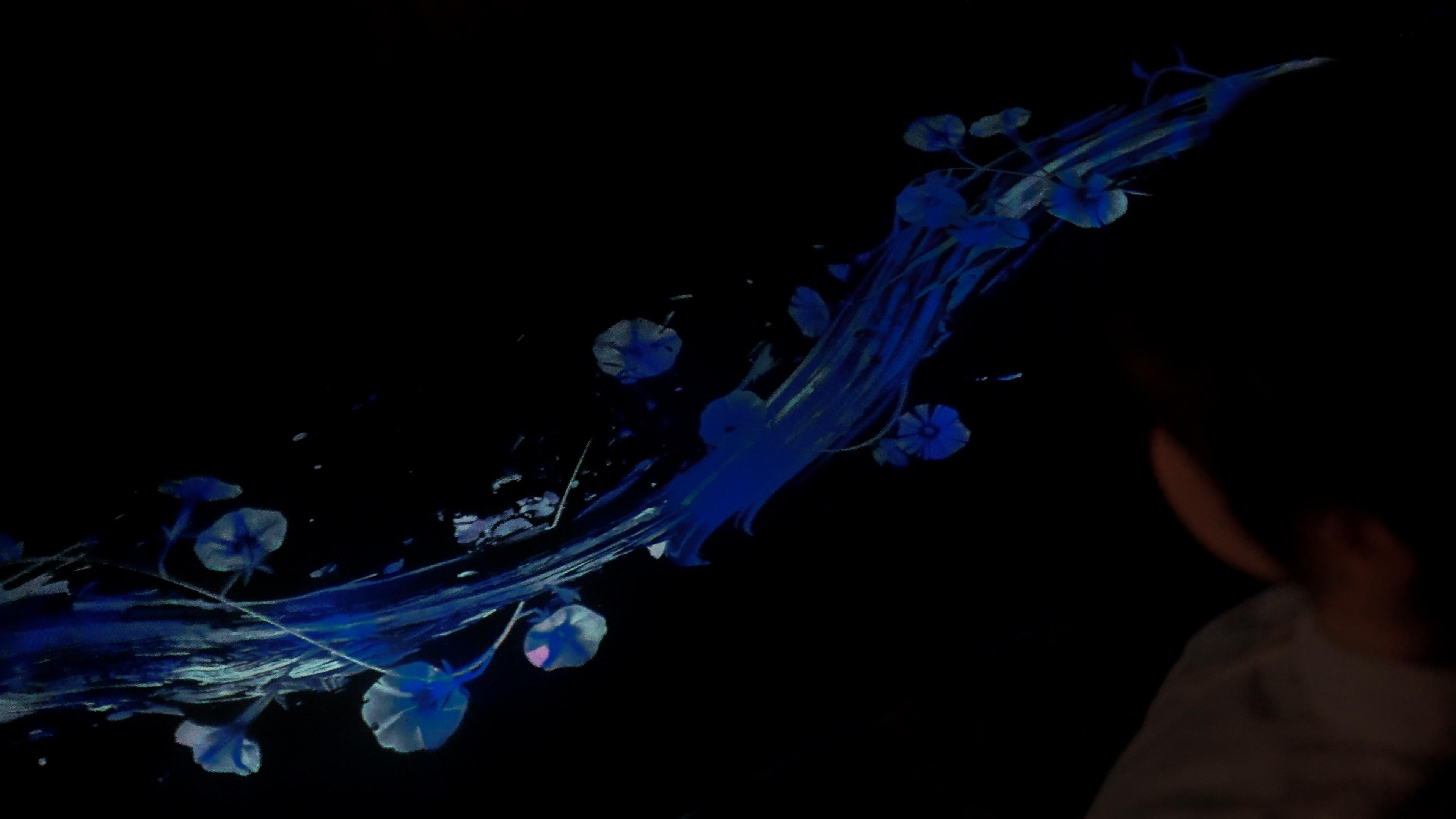 Spatial Calligraphy is a form of calligraphy drawn in space that teamLab has been exploring since it was founded. The artwork reconstructs calligraphy in three-dimensional space to express the depth, speed and power of the brush stroke, and that calligraphy is then flattened using the logical structure of space that teamLab calls Ultrasubjective Space. The calligraphy shifts between two and three dimensions.