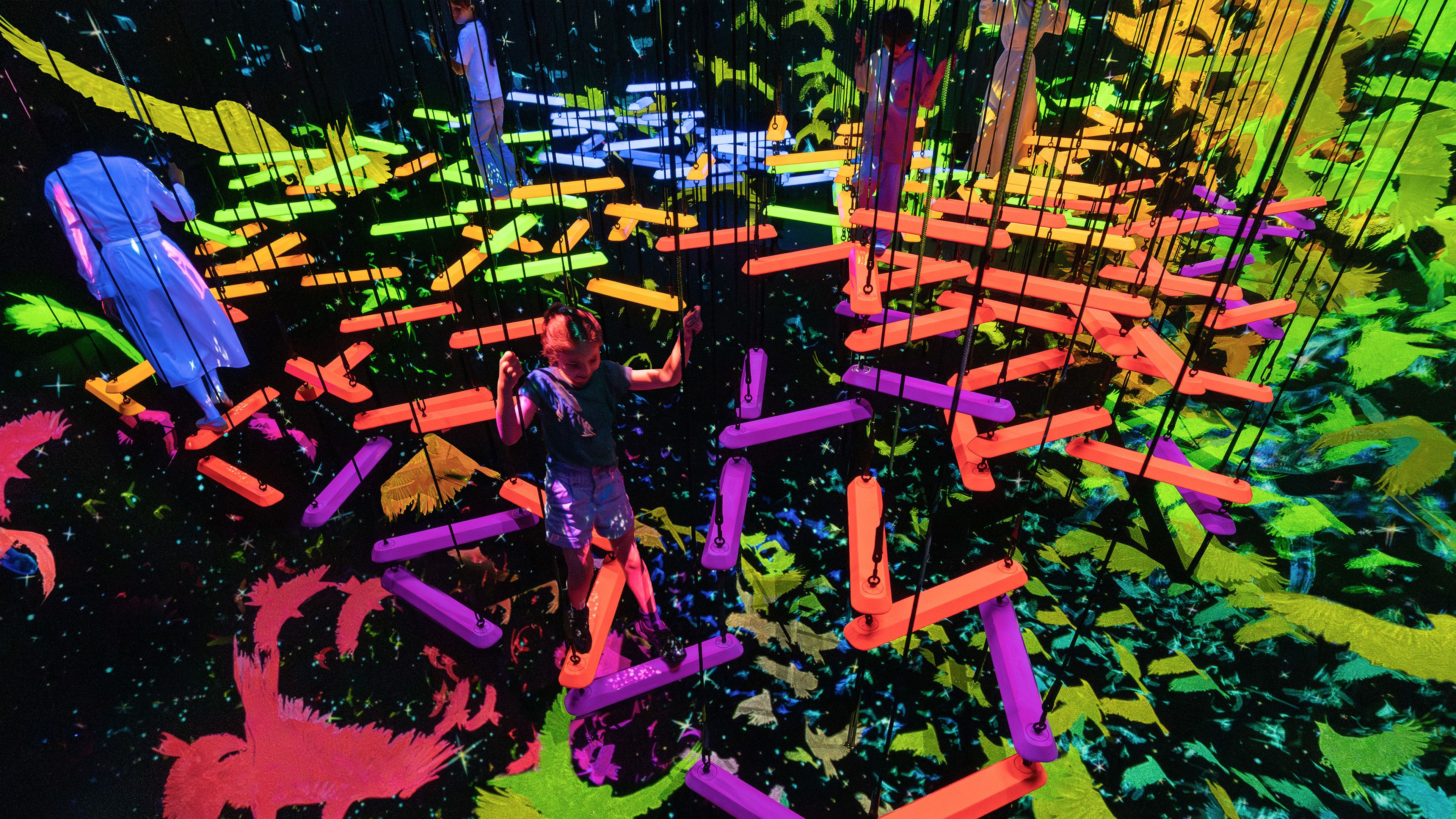 「エアリアルクライミング」は、ロープで吊られた棒が、空中に立体的に浮かんでいる空間。人々は、落ちないように、その棒を使って空中を立体的に渡っていく。棒は連結されているため、他の人による棒の動きが、自分が乗っている棒に影響を与える。選択するルートによって棒の組み方が違い、さまざまな棒の連結のされ方によって、それぞれ違った体験となる。