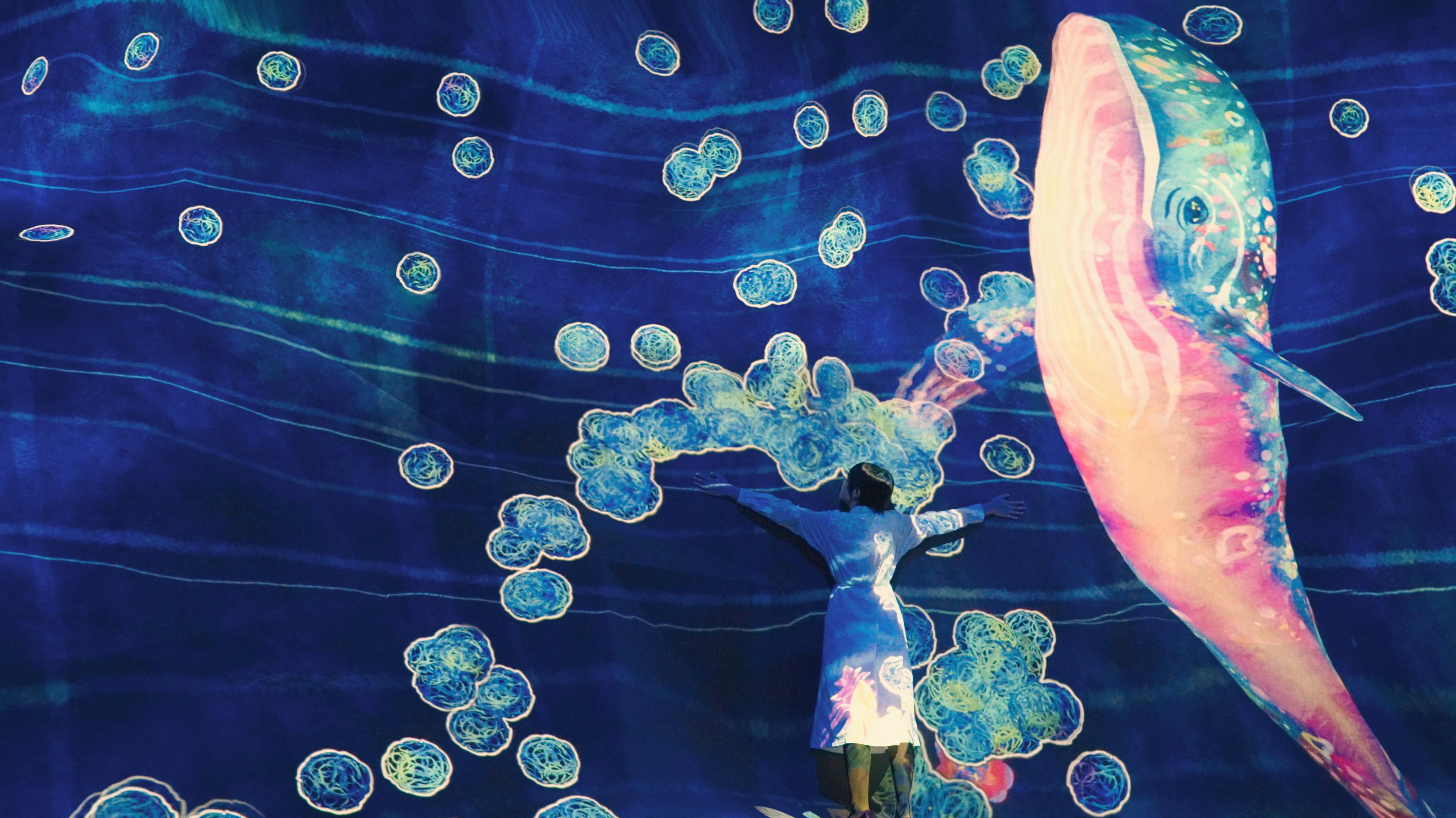 紙に自由に絵を描く。すると、描いた絵が粒となってたくさん流れ落ちて滝となる。やがて、他の人が描いた粒と混じって落ちてくる。そして、地形に沿って流れ込んでいく。
