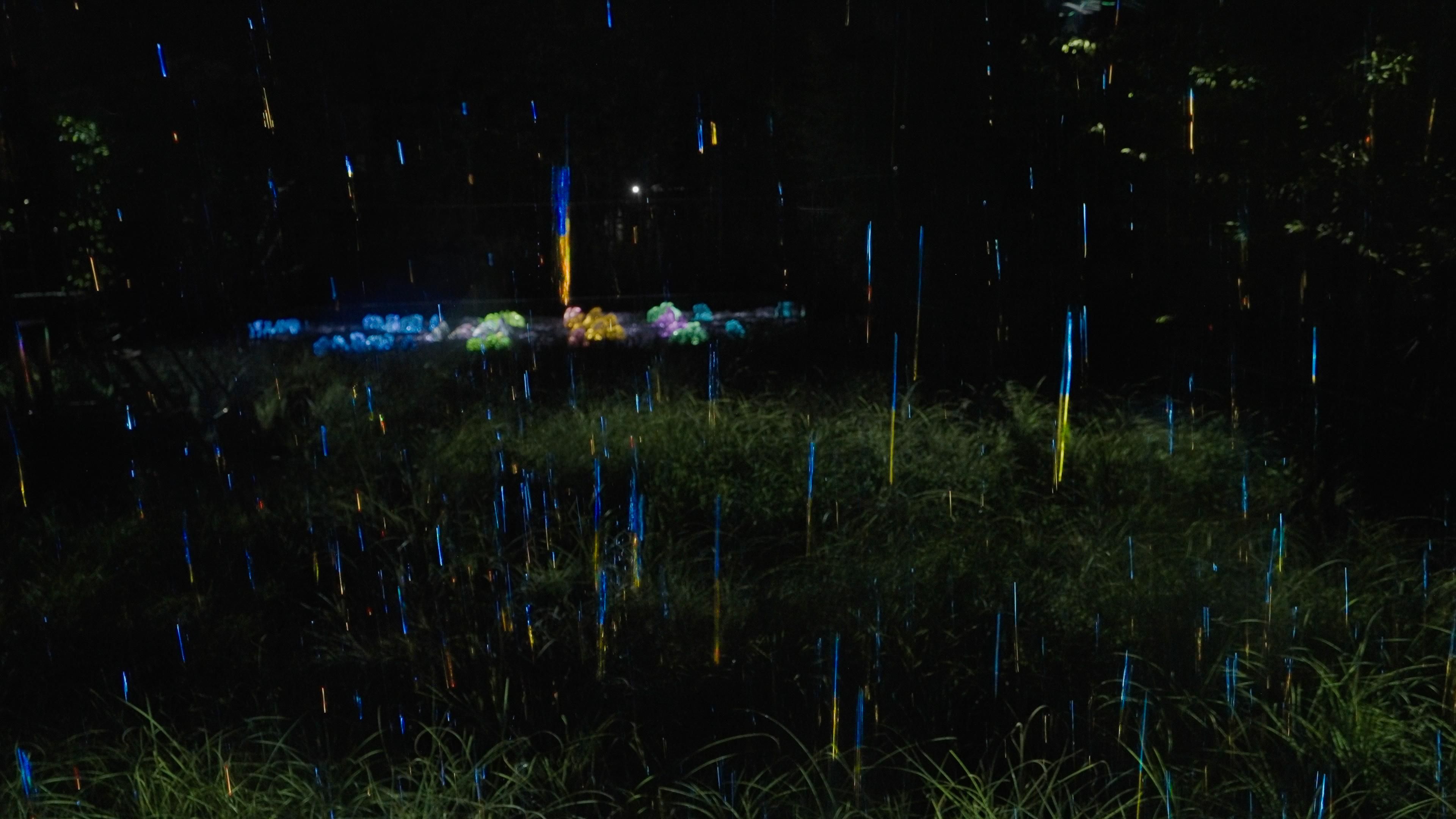 強い雨が降る夜、草原に降る雨は作品となる。