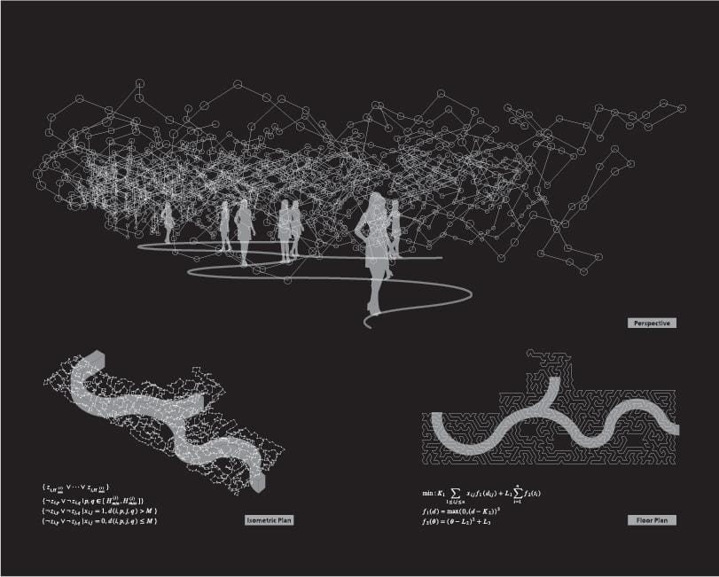 具体的には、それぞれのランプから3次元上で最も距離が近いランプに線を引いたときに、始点と終点が同じの一筆書きできる1本のつながった線(unicursal)になるように、ランプの高さ方向の分布のばらつきと、光の軌跡である3次元的な経路のなめらかさを定量化し、空間上のランプの配置を数学的に求めている。