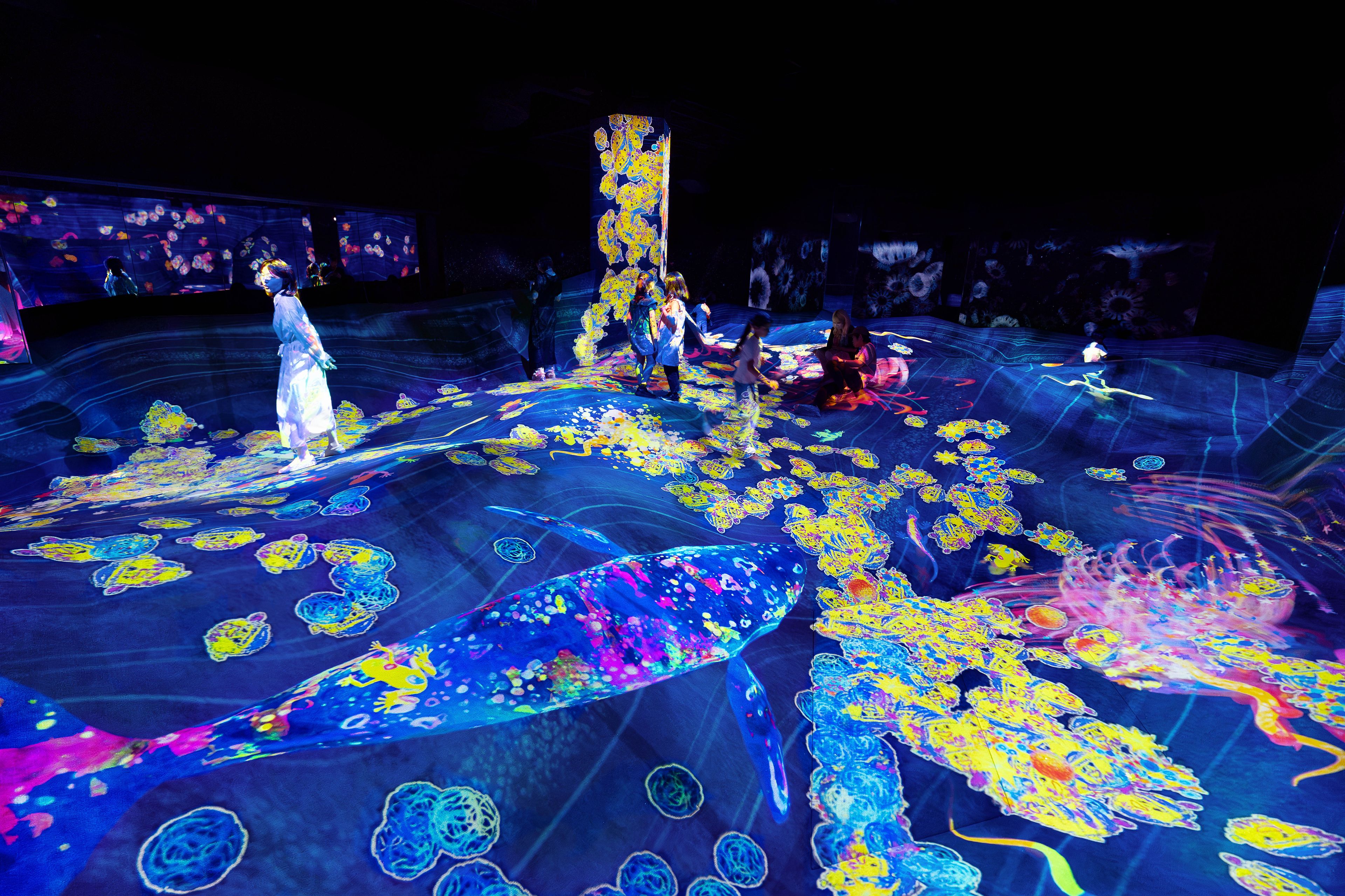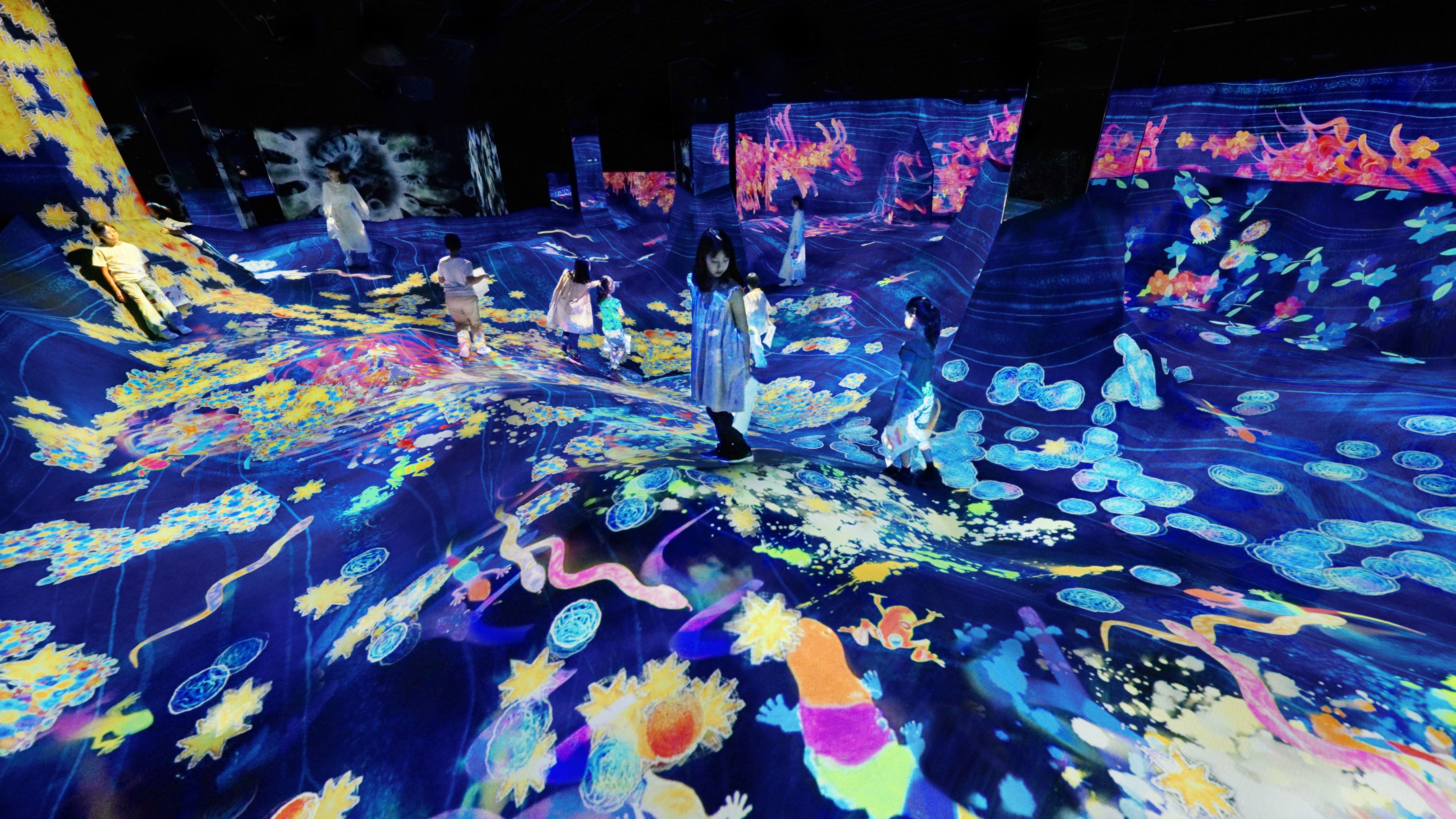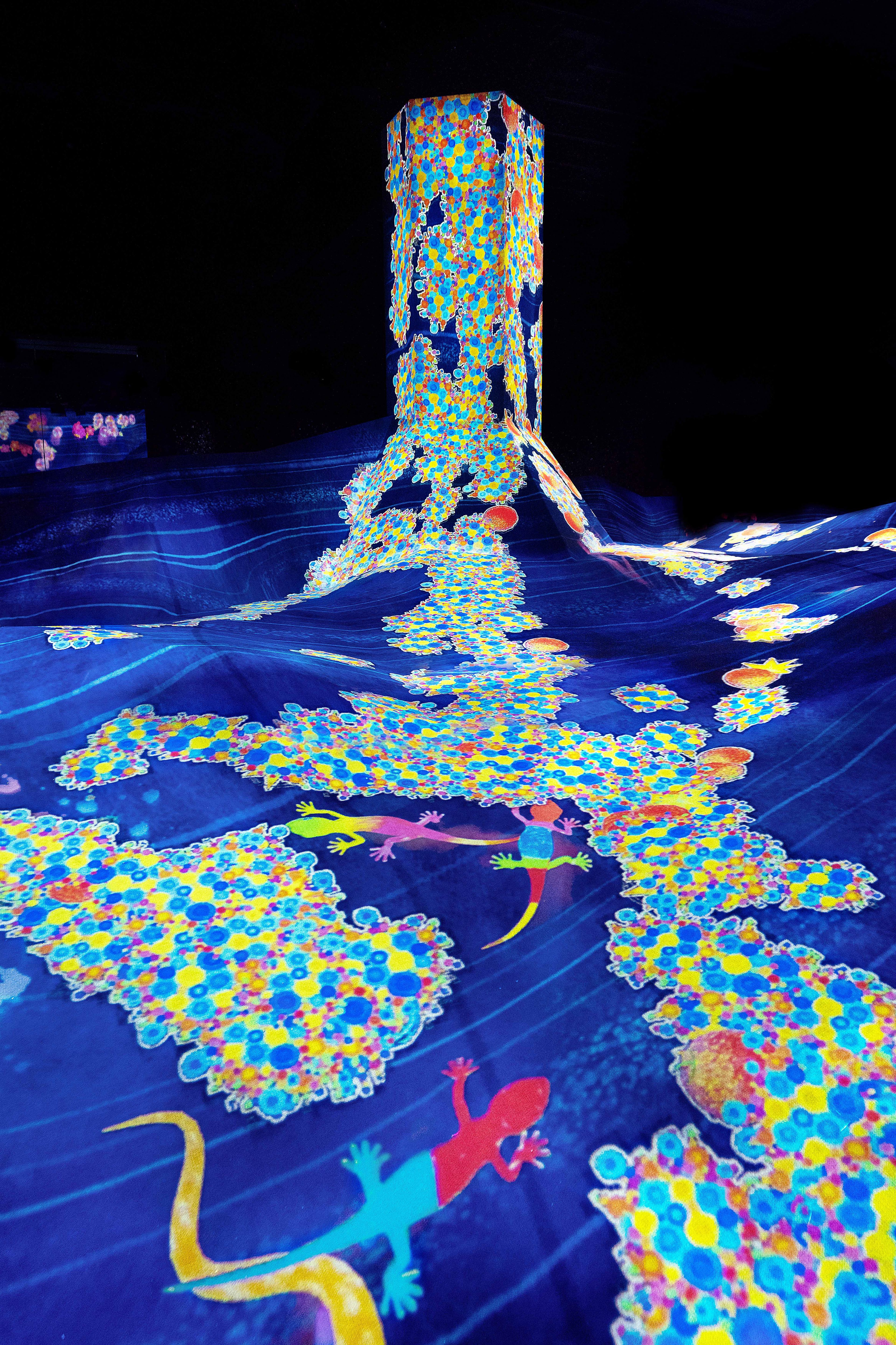 花は、人々がじっとしているとその場にたくさん咲き、人々が踏んで歩き回ると散る。生き物たちは増えたり減ったりしながら、この世界に広がっていく。あなたが描いた生き物も、どこかで増えているかもしれない。
