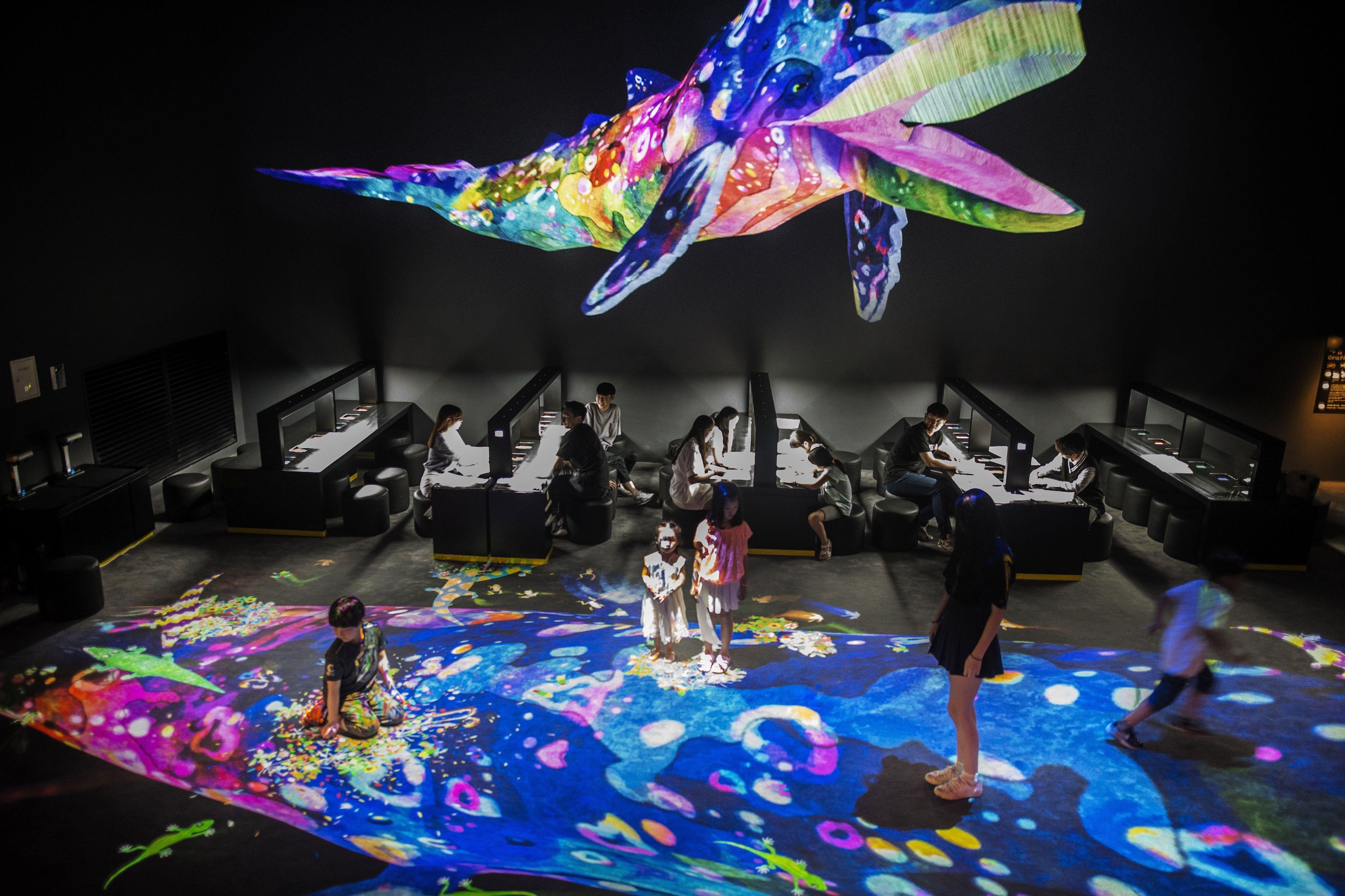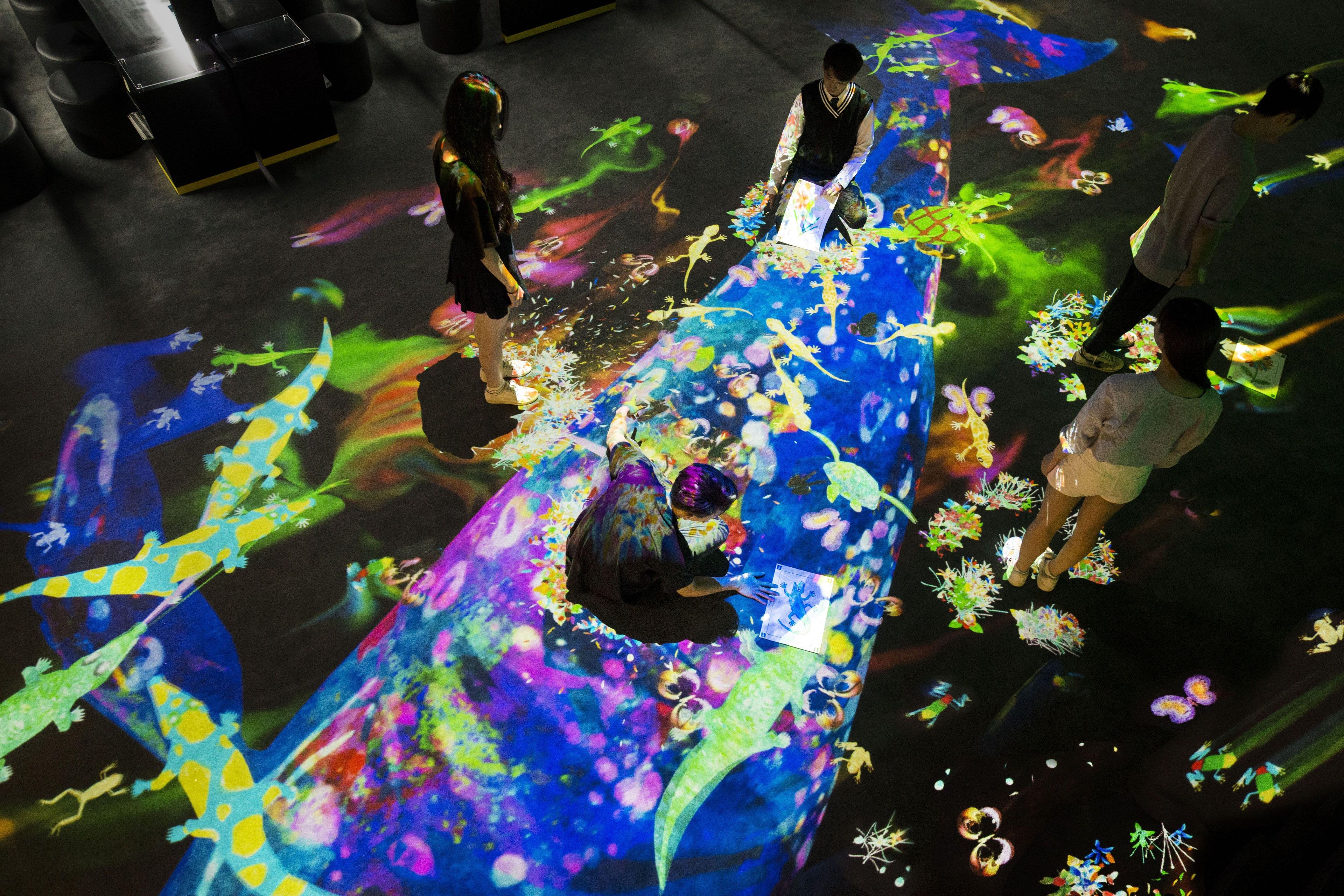 描いて創った生きものを探したり、追いかけたり、そして花を咲かせたりしながら、みんなで創っていくteamLab Worldの中を探検してみてください。