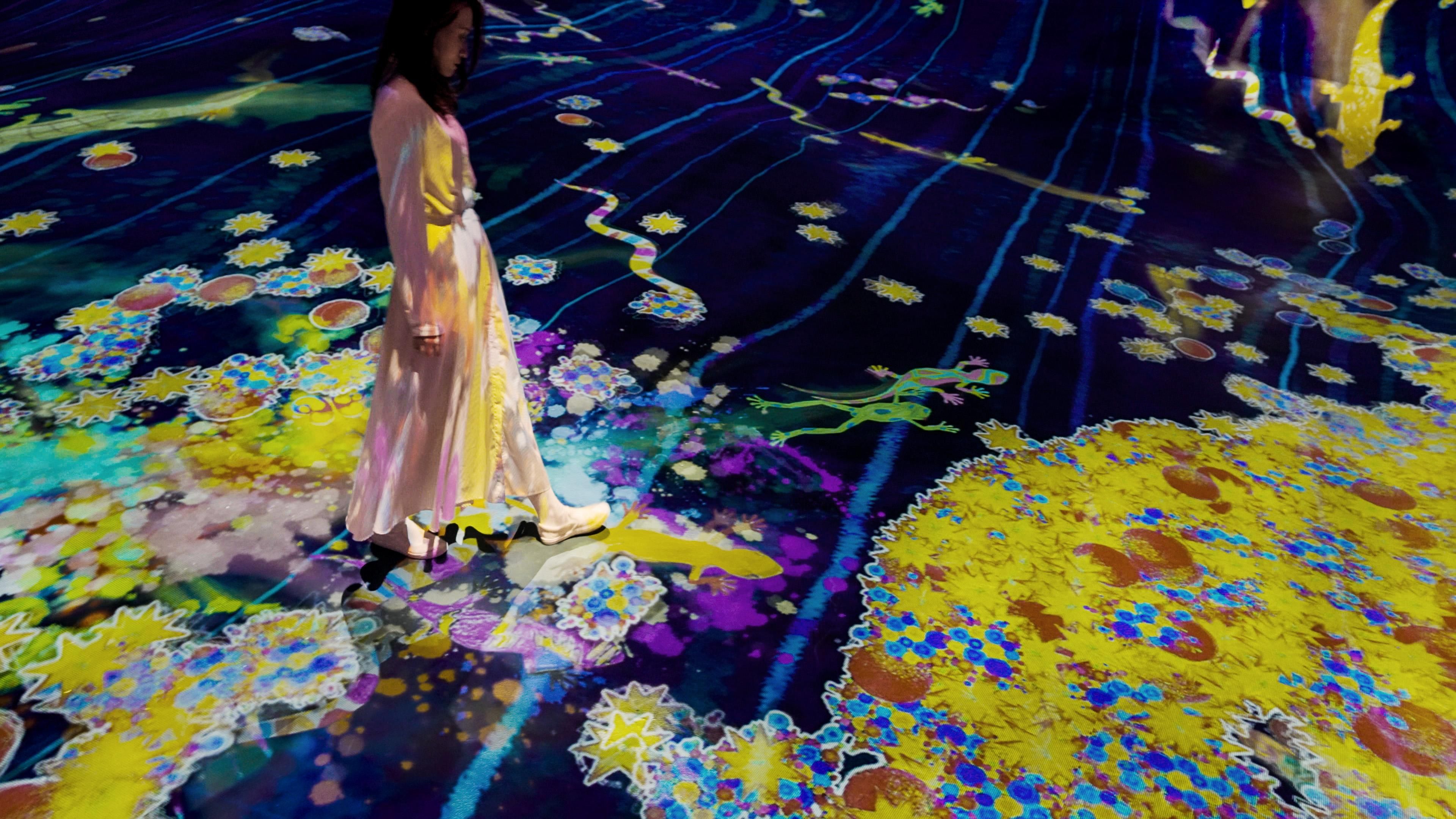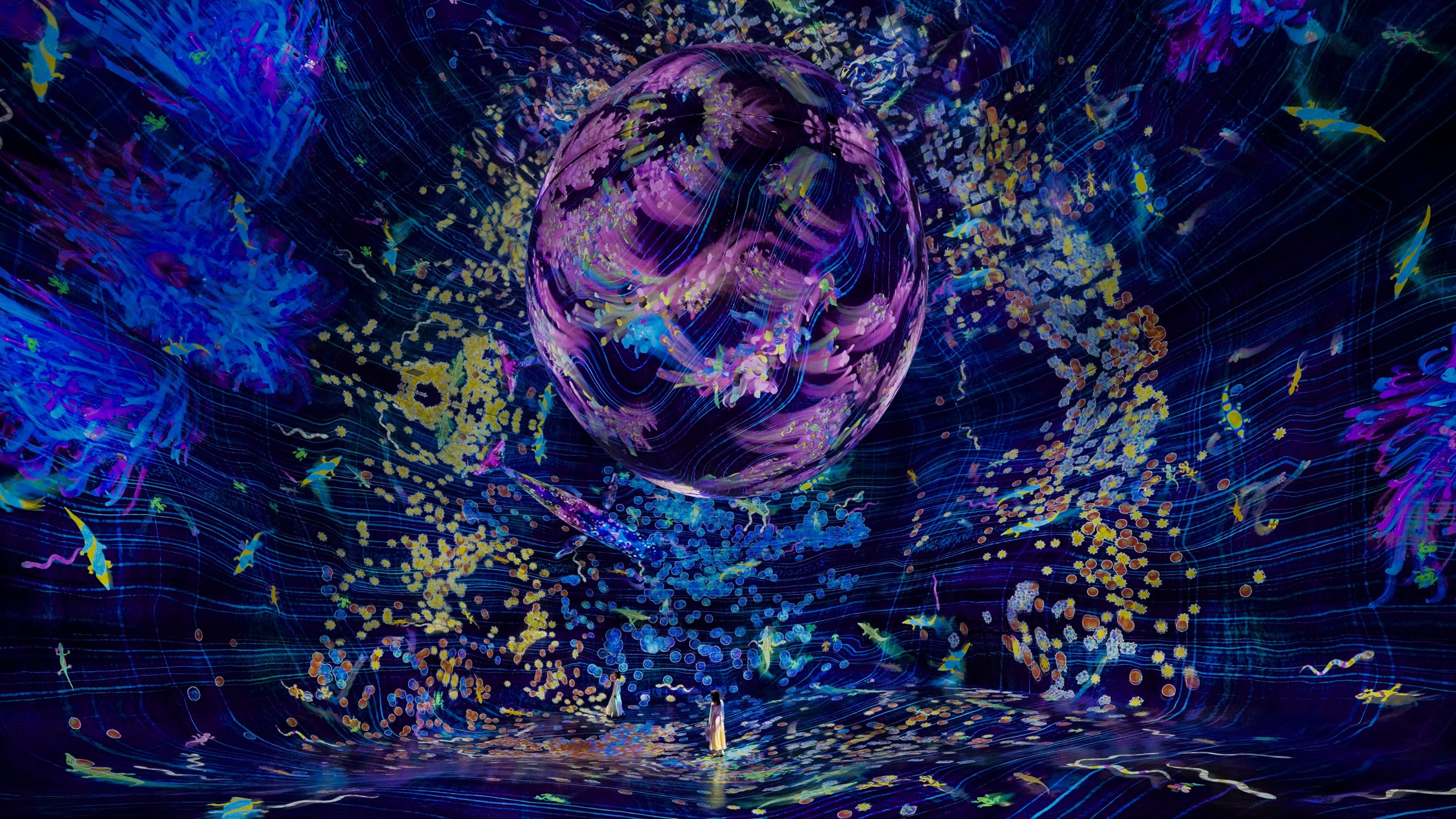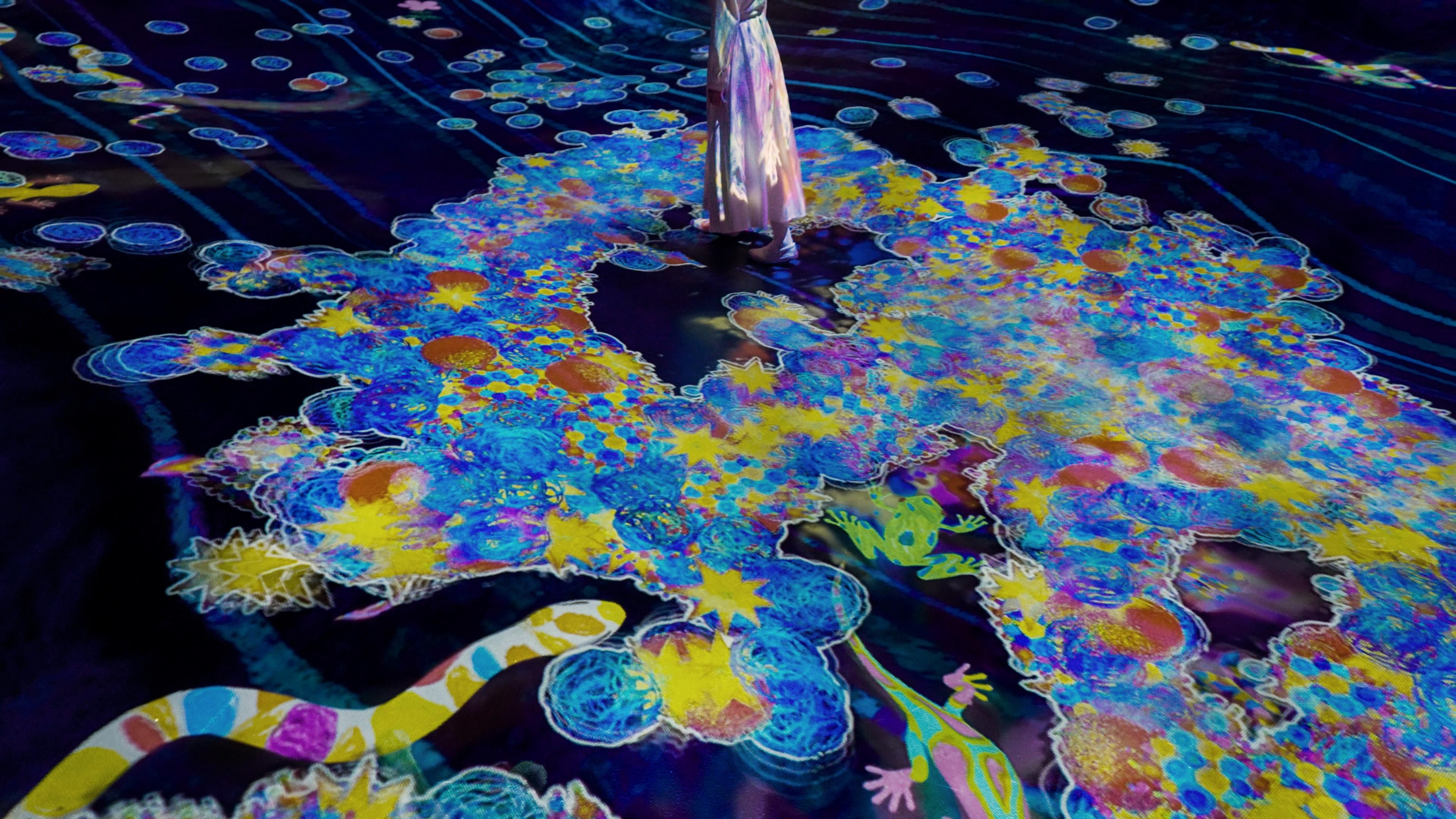 花は、人々がじっとしているとその場にたくさん咲き、人々が踏んで歩き回ると散る。生き物たちは増えたり減ったりしながら、この世界に広がっていく。あなたが描いた生き物も、どこかで増えているかもしれない。