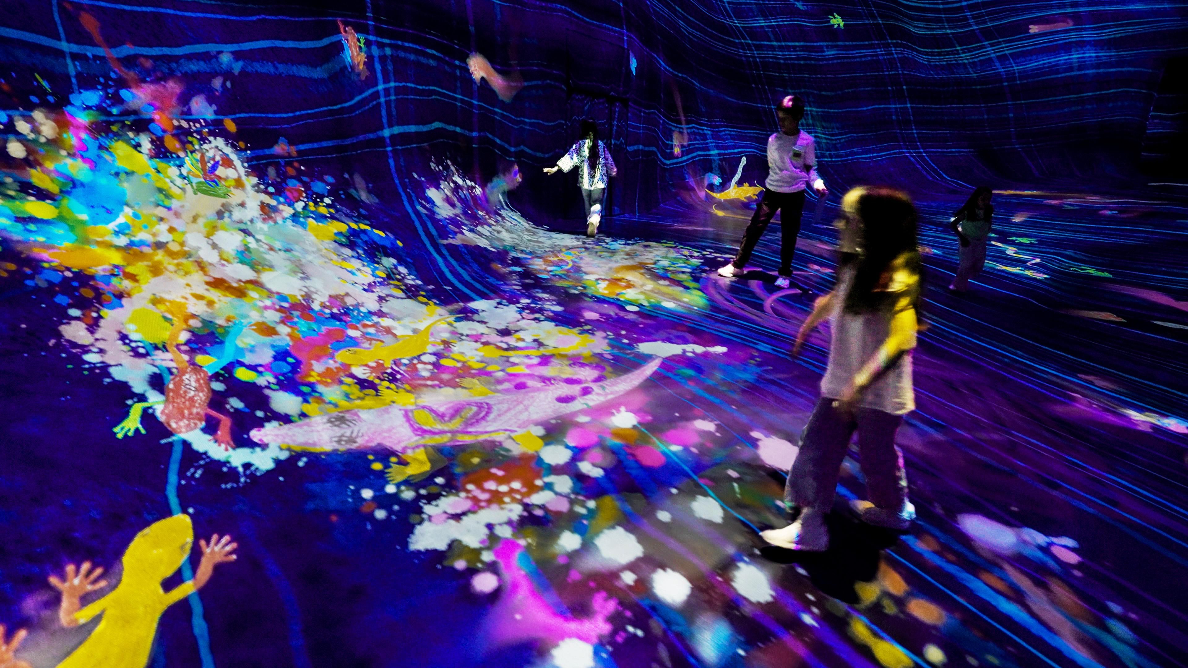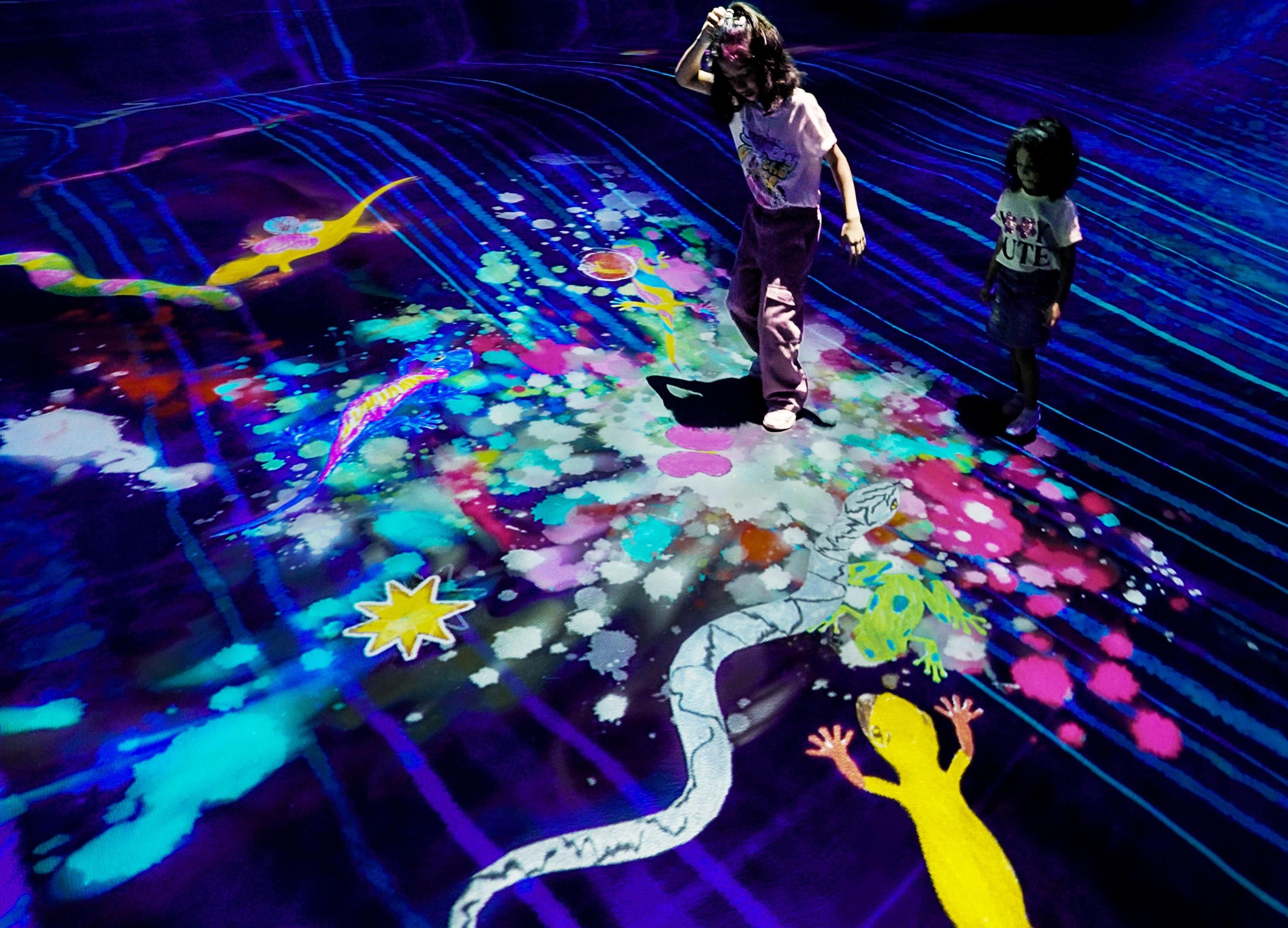 紙に自由に絵を描く。すると、描いた絵が粒になり、地形に沿って流れ込んでくる。やがて、他の人が描いた粒と混じって落ちてくる。
