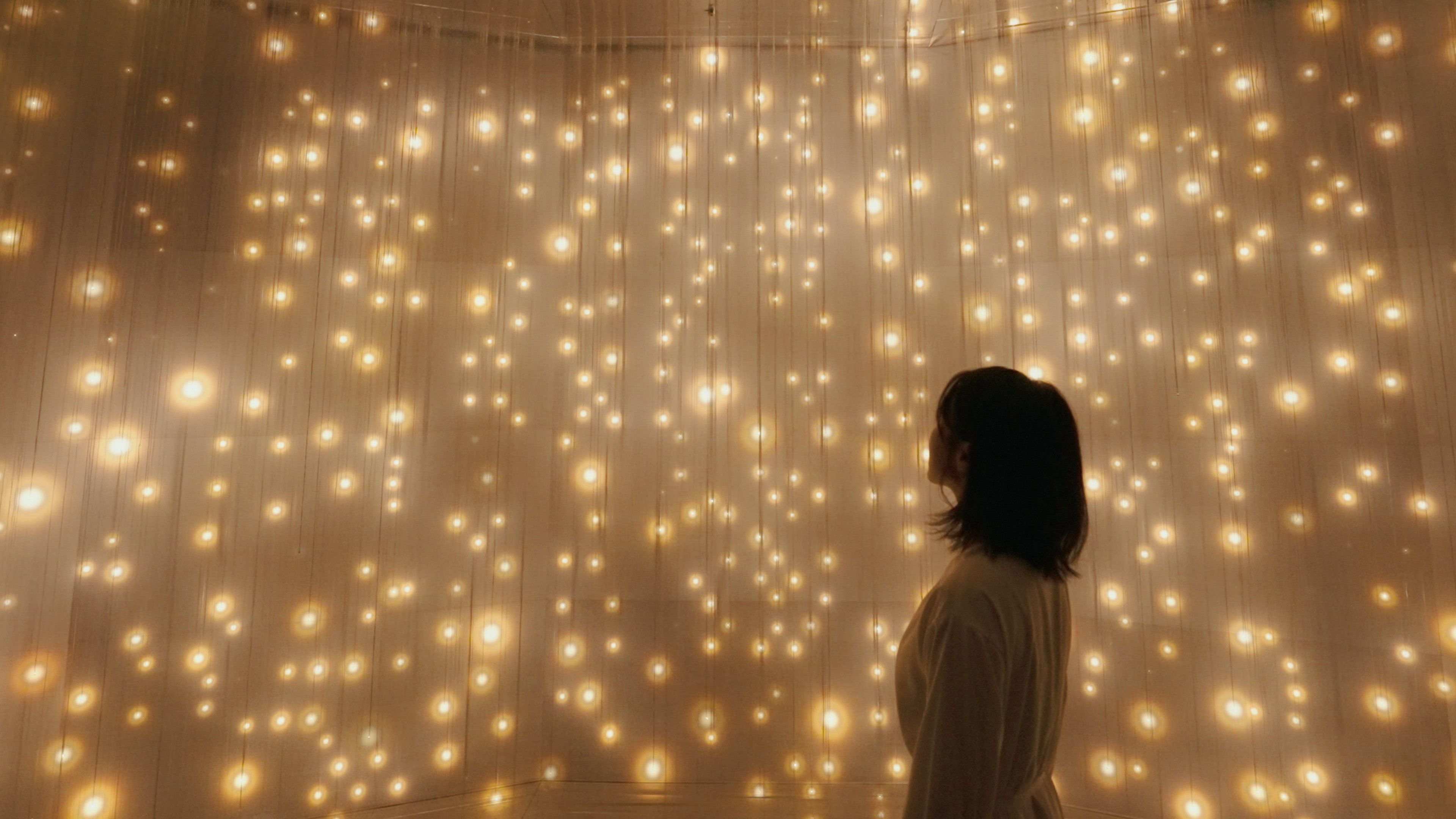 無数の光の球体群。人々が近づくと、球体は強く輝き、周囲へと呼応の連鎖を広げていく。