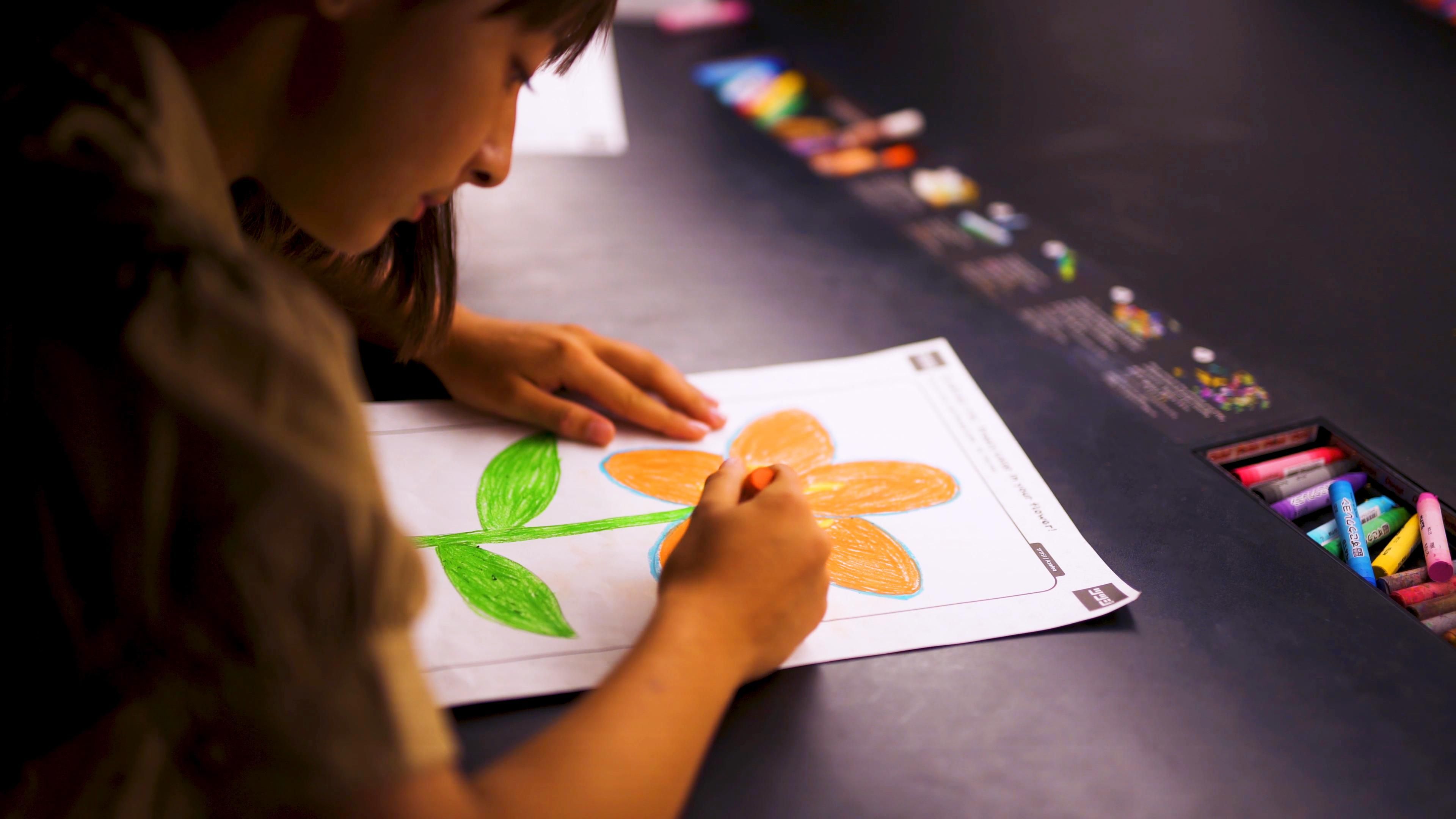 動物や花の輪郭が描かれた紙にお絵かきする。2