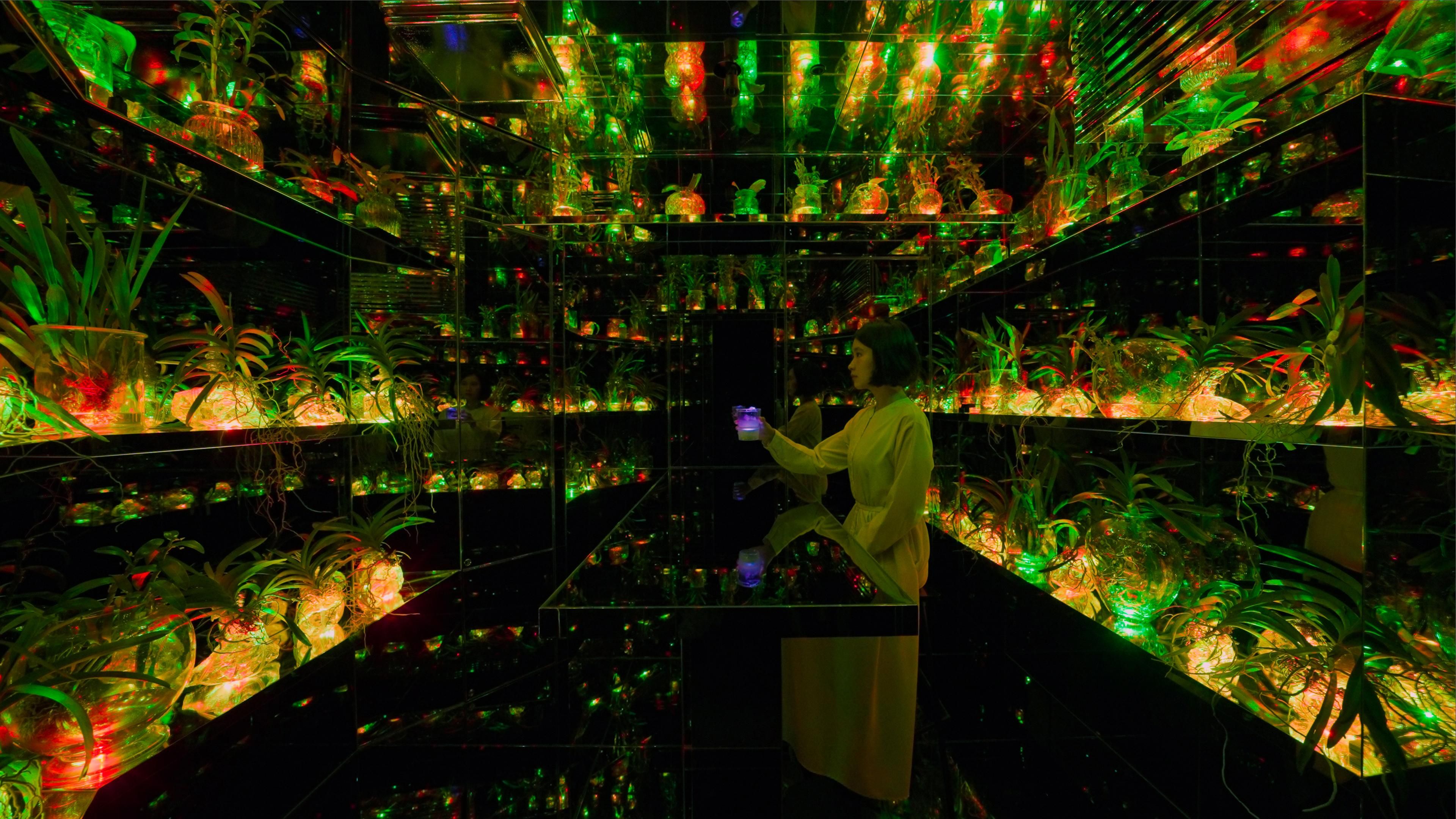 茶や酒の光の色は、チームラボが提唱する新しい概念の色「動的平衡色」。遠くから茶と酒を見た時、つまり、茶や酒を全体で見ると、光の色は変化せず同じ色であり続けるが、茶や酒を凝視した時、つまり、極小で見ると、光の色は常に変化し続け、時間の概念が生まれる。