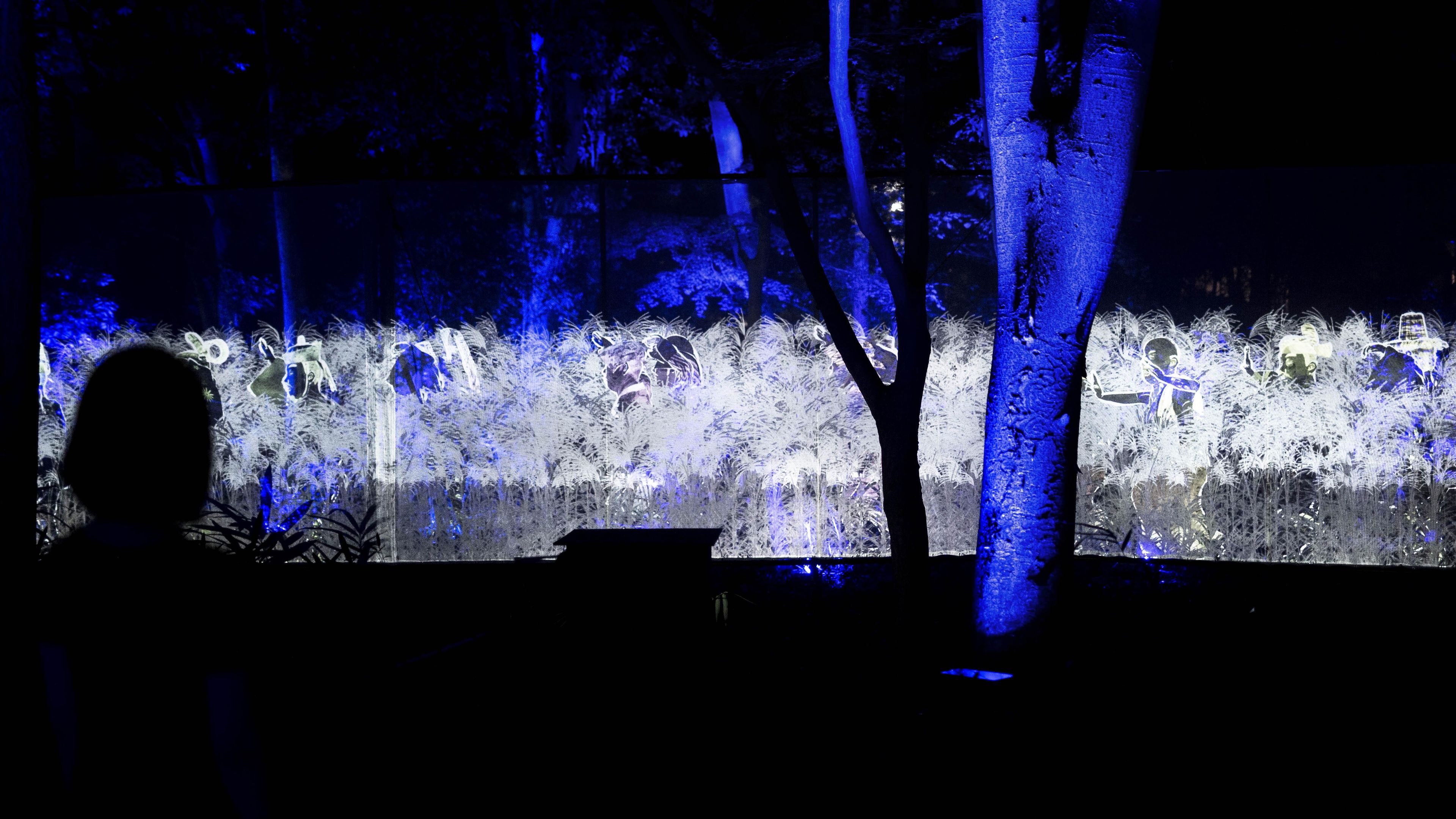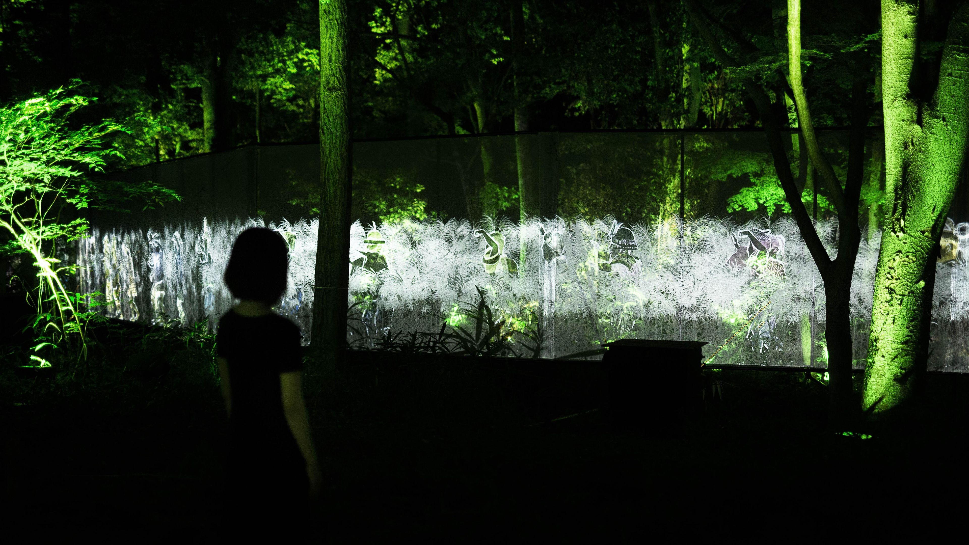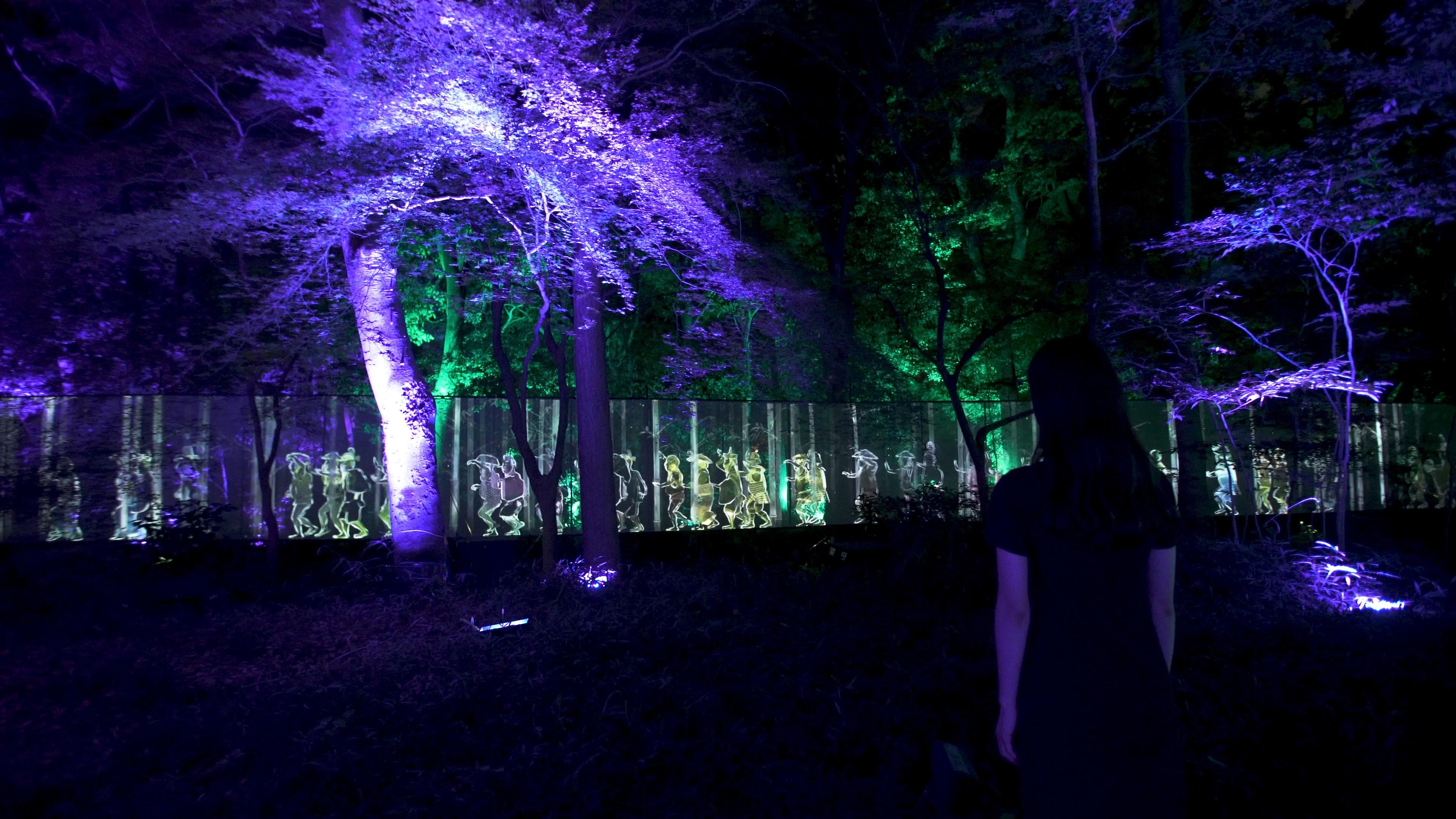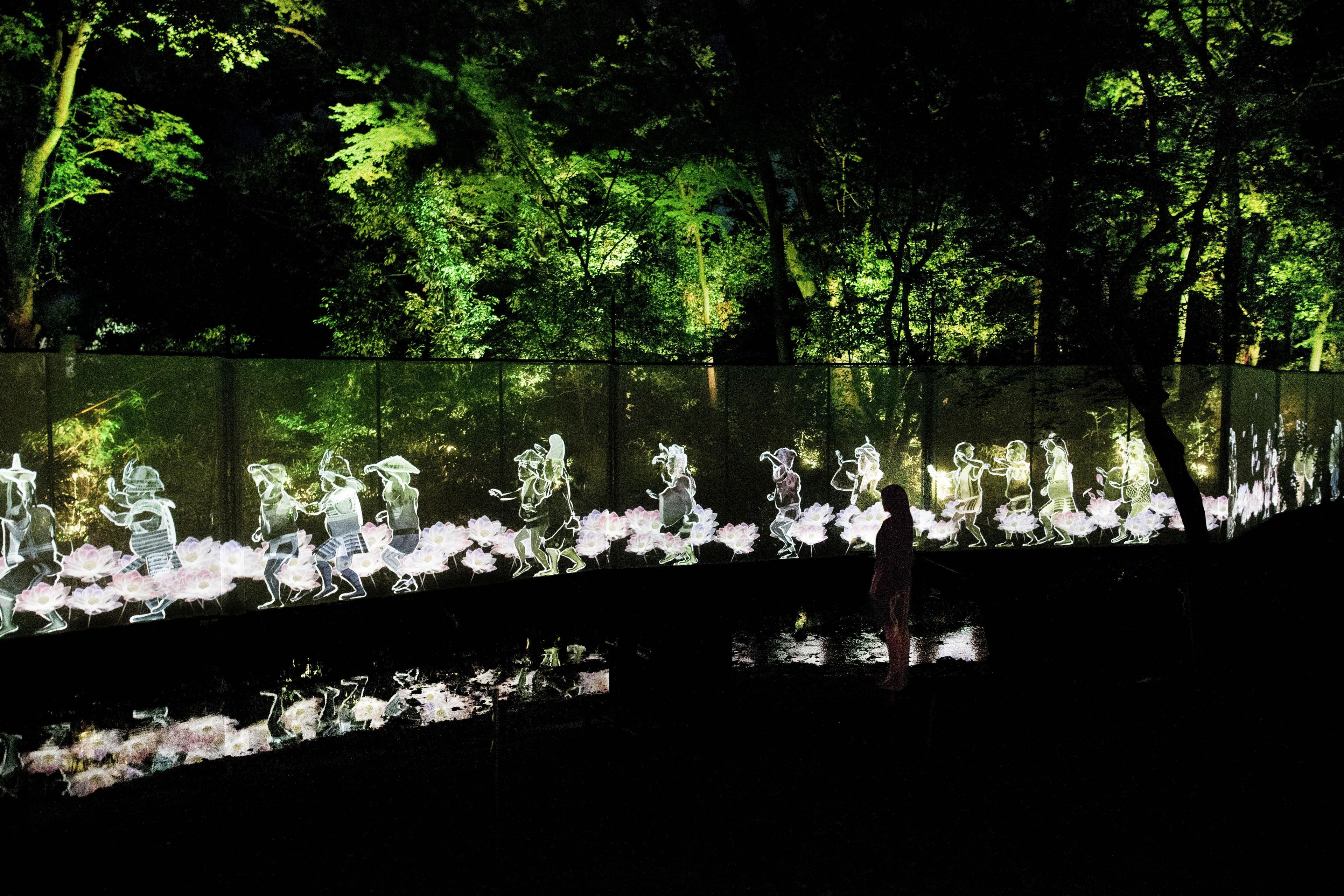 糺の森の中を流れる泉川沿いを、匿名で多様な肖像群が歩き続ける。