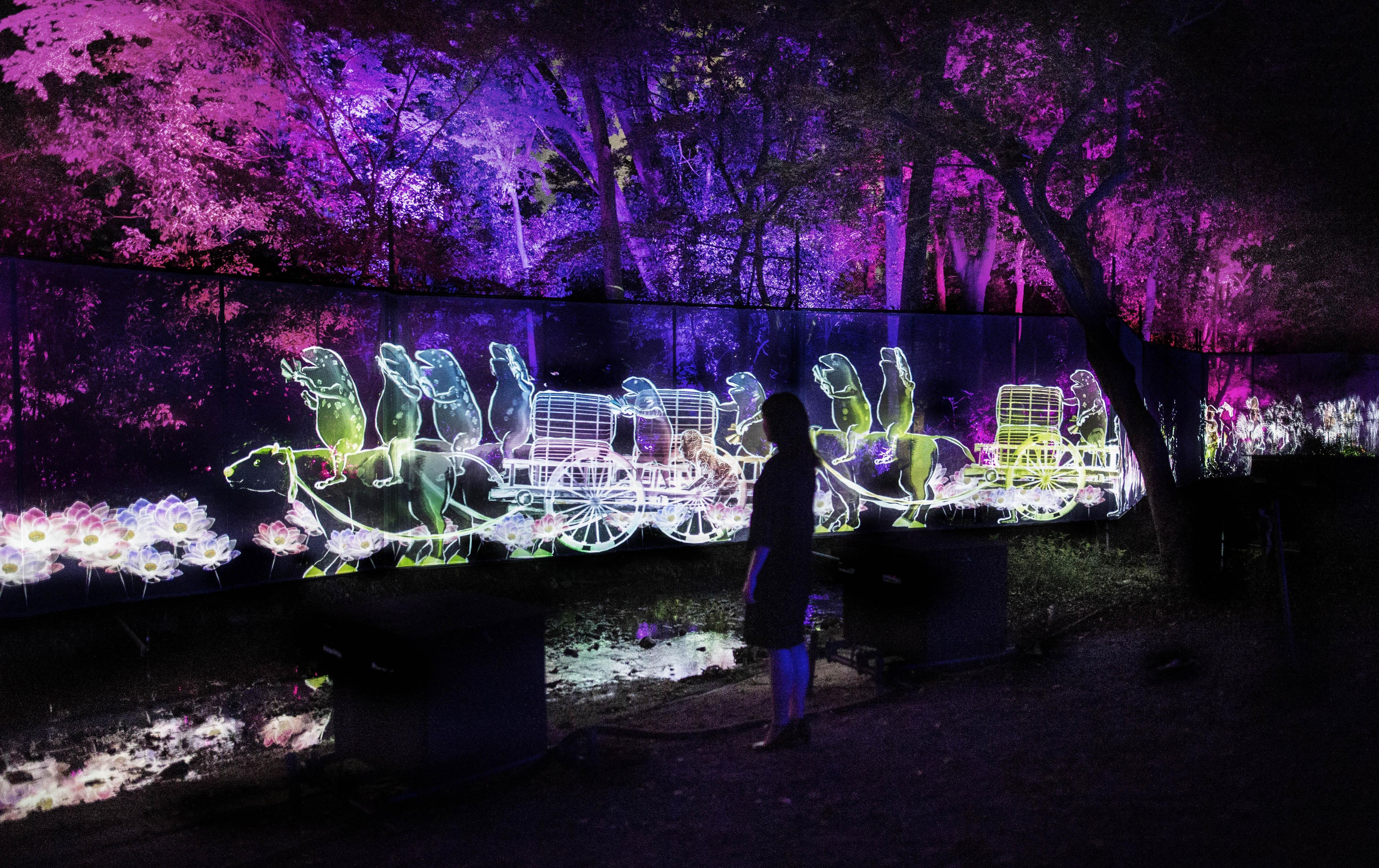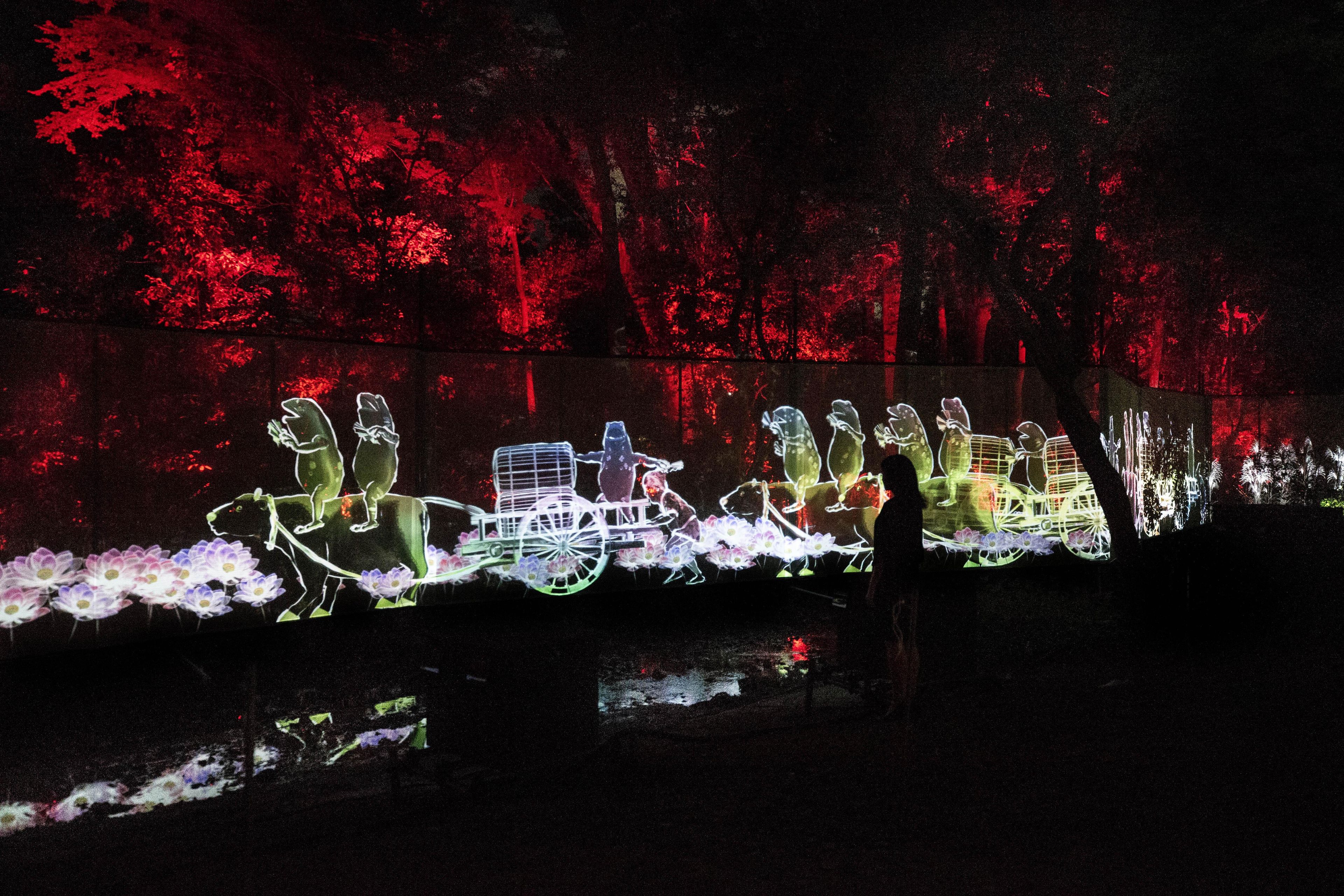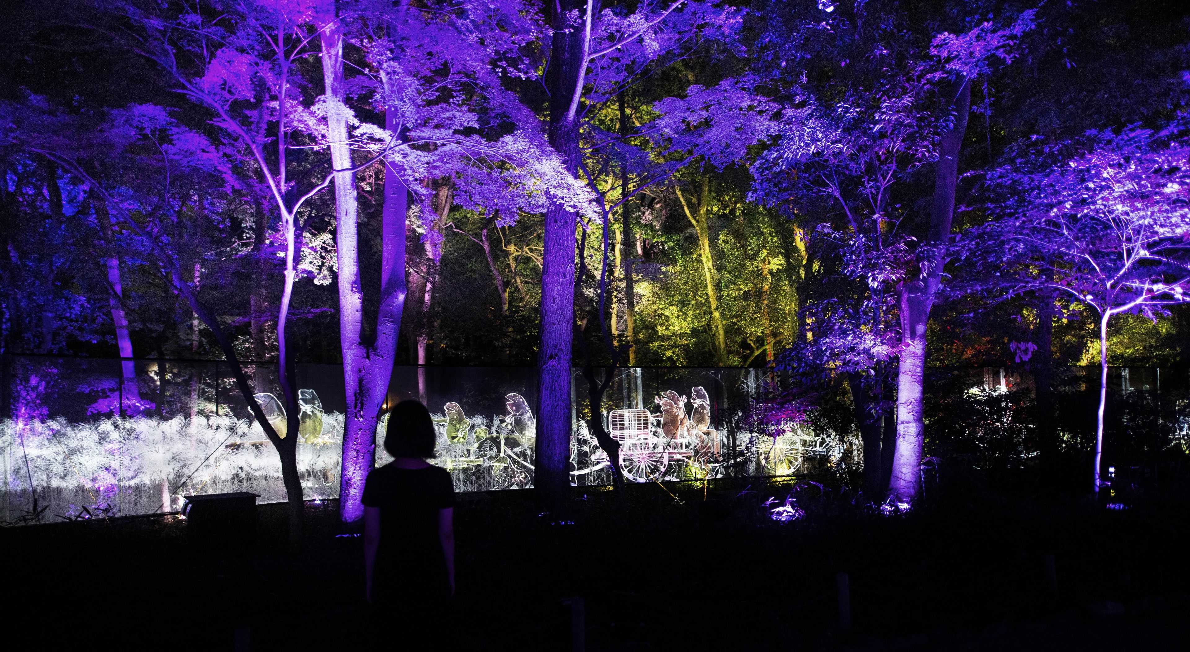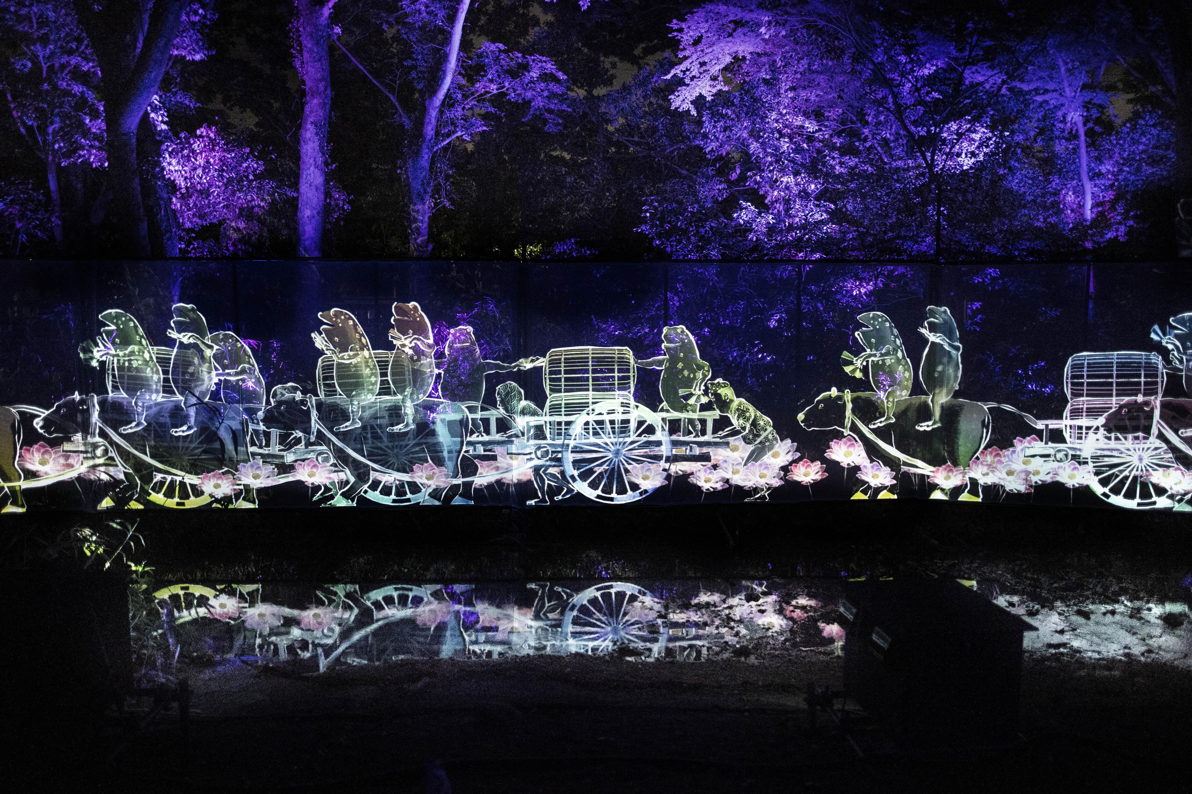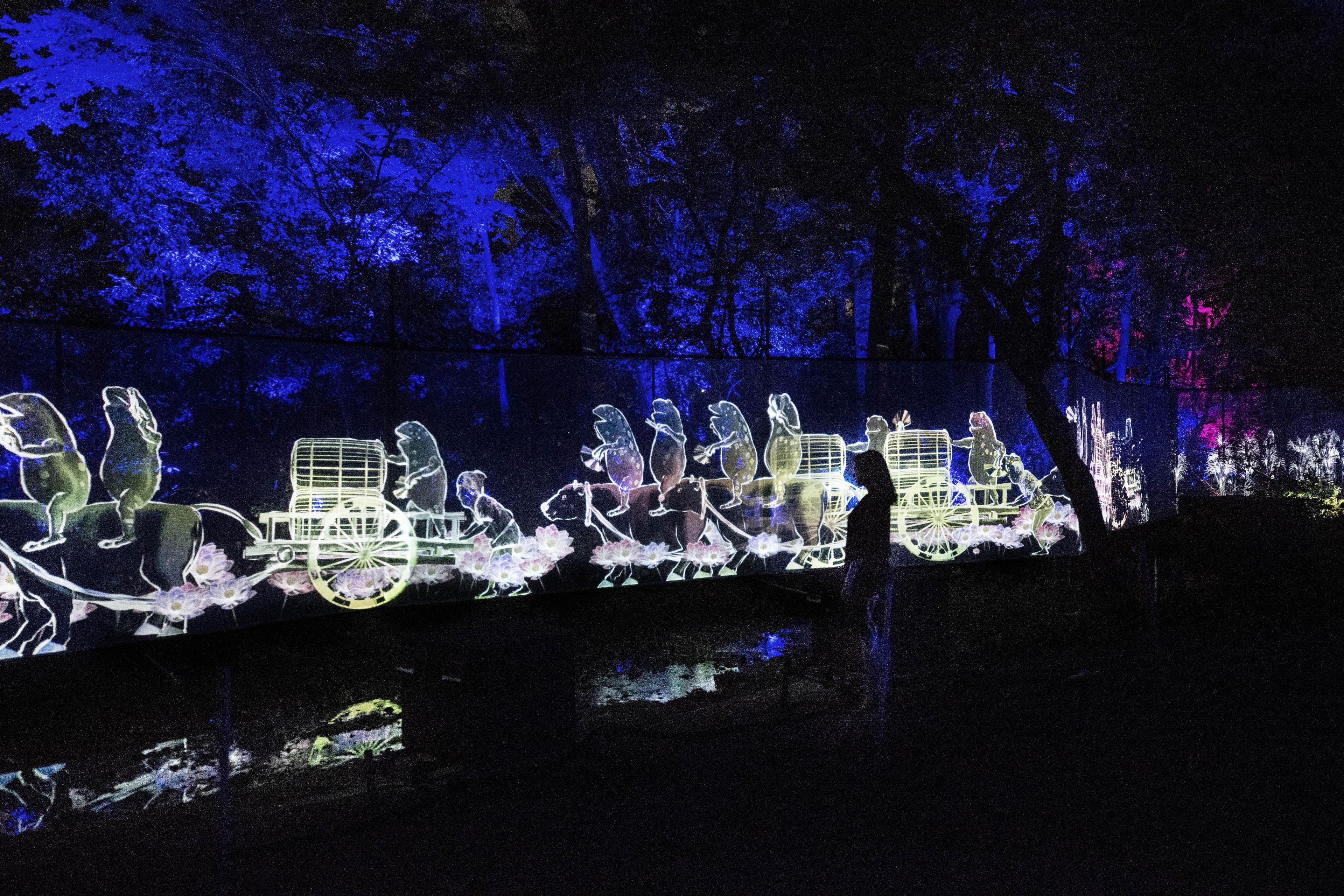 糺の森の中を流れる泉川沿いを、匿名で多様な肖像群が歩き続ける。