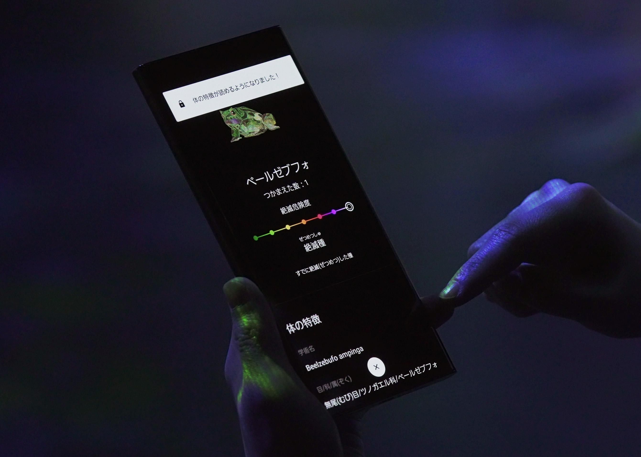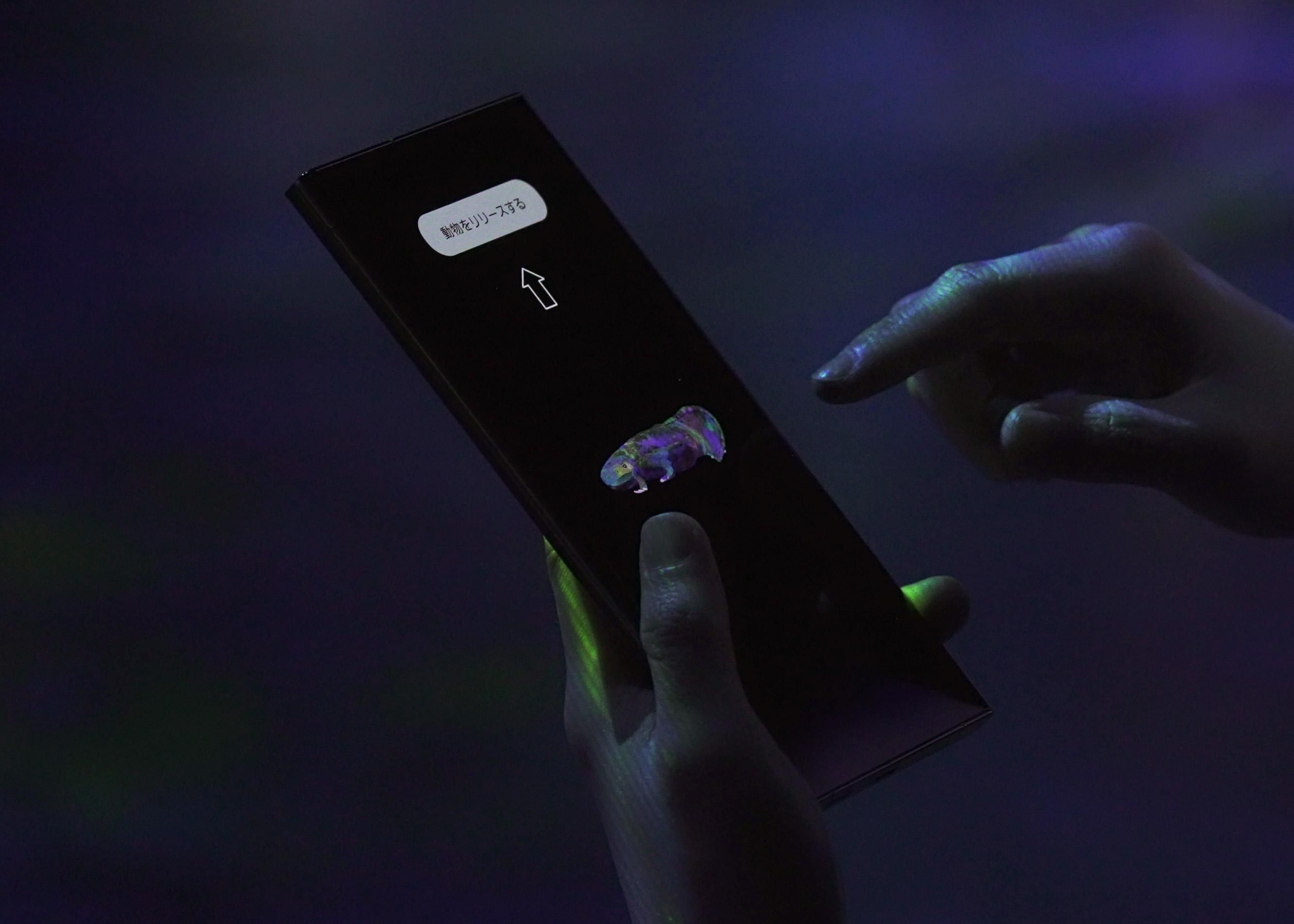 また、好きな場所で「観察のあみ」を投げ込むと、足元に「観察のあみ」を張られる。まわりの人々と協力しながら、身体を使って、動物を「観察のあみ」に追い込むと、動物は空間から消え、同じように図鑑にコレクションされる。