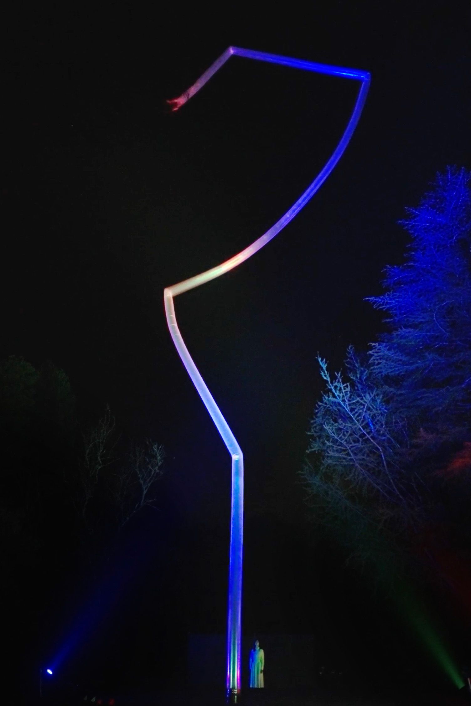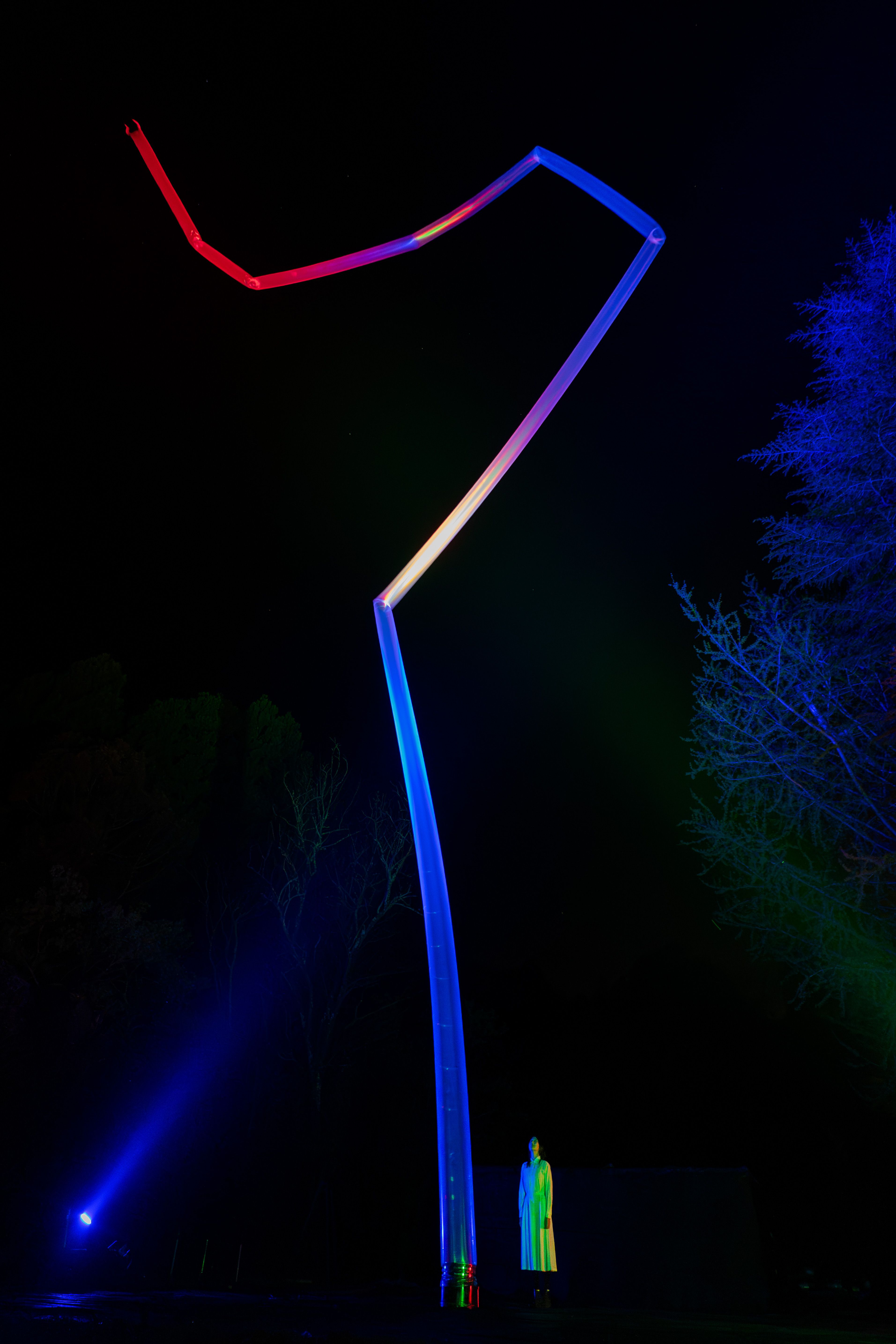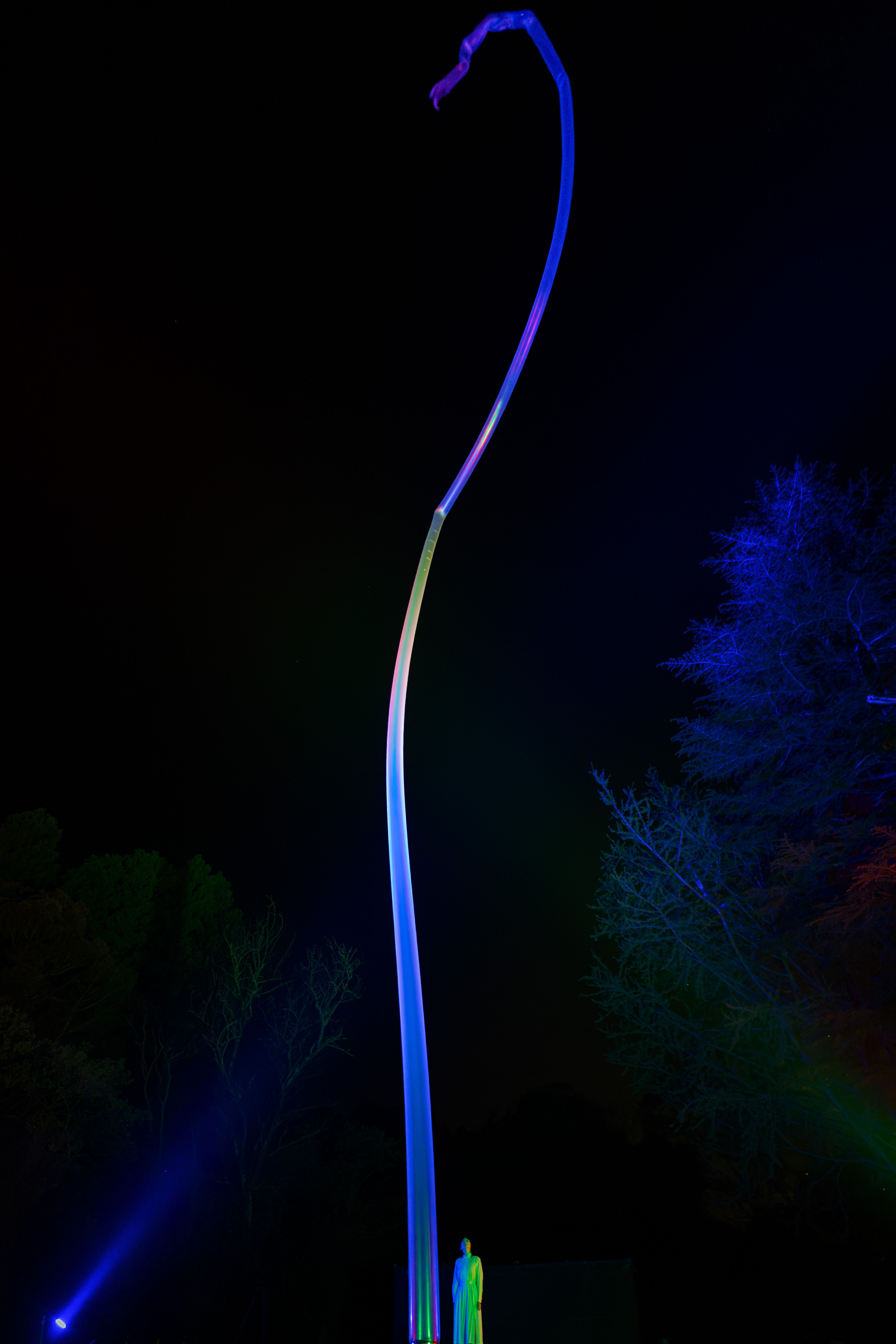 作品は風や雨、湿度など環境の影響を強く受け、柱の動きや高さが大きく変化する。