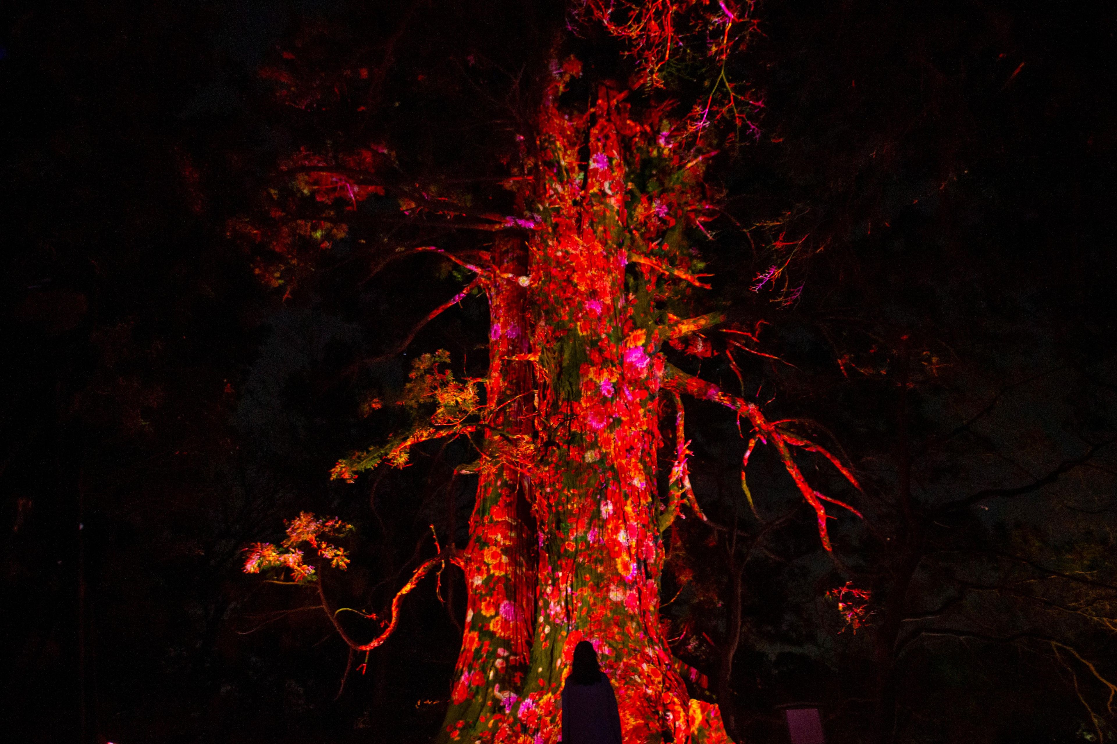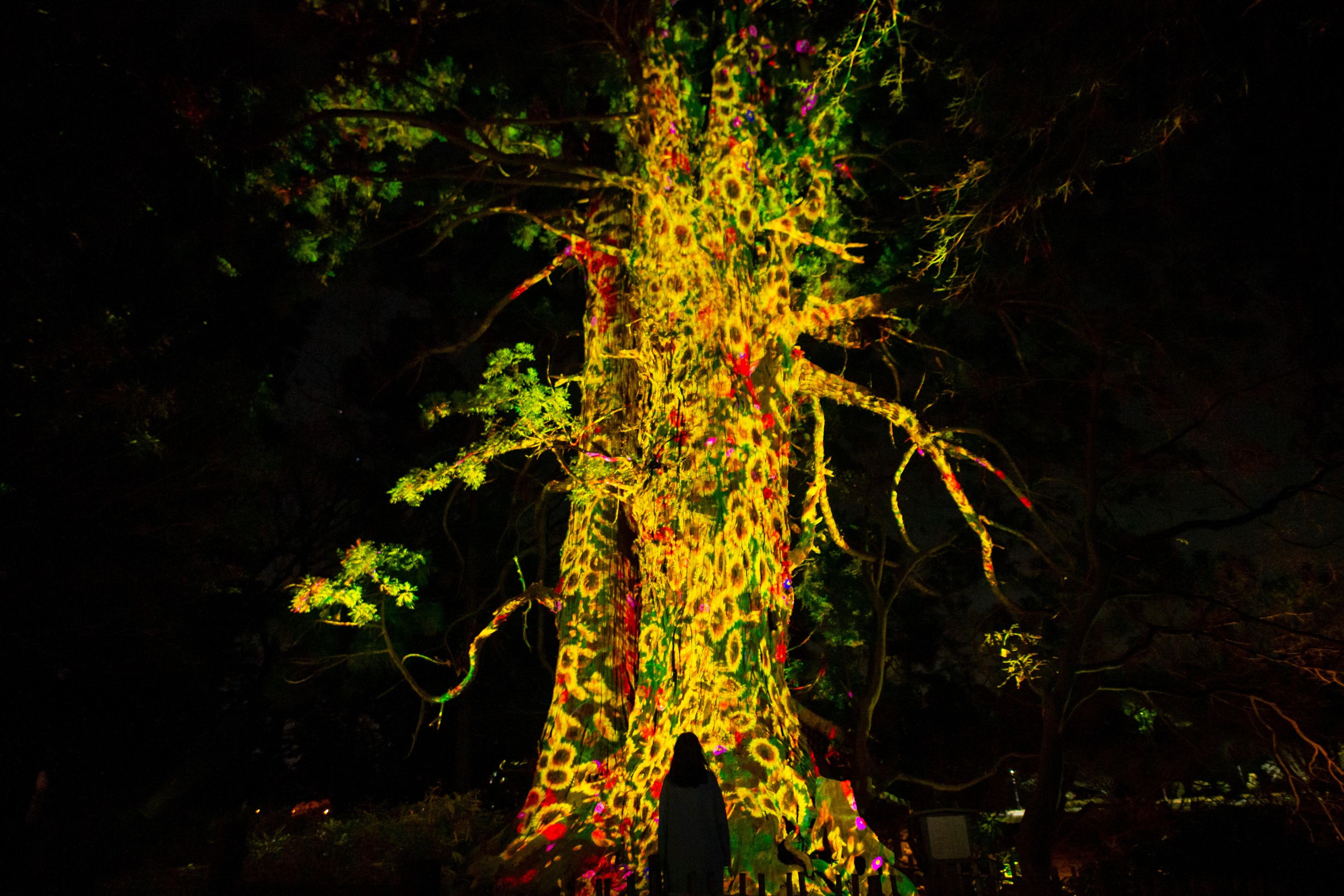 樹齢約800年と言われている巨木(樹高約35m、根本の周囲約17.2m)に、花々が永遠に咲いては散っていく。一時間を通して一年間のこの地域の花々が咲いては散り変化していく。花々は生まれ、咲き、やがては散って死んでいく。つまり、花々は誕生と死滅を永遠に繰り返し続ける。