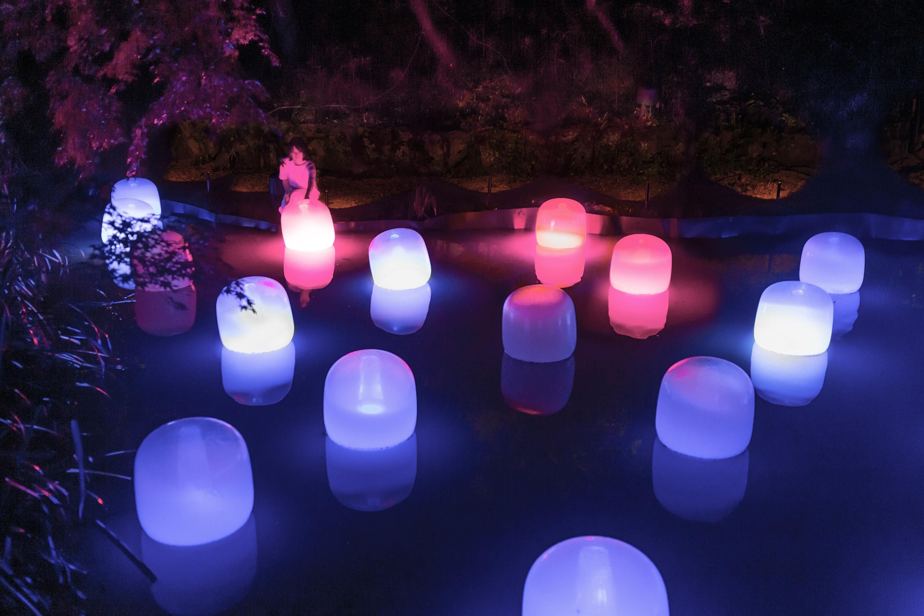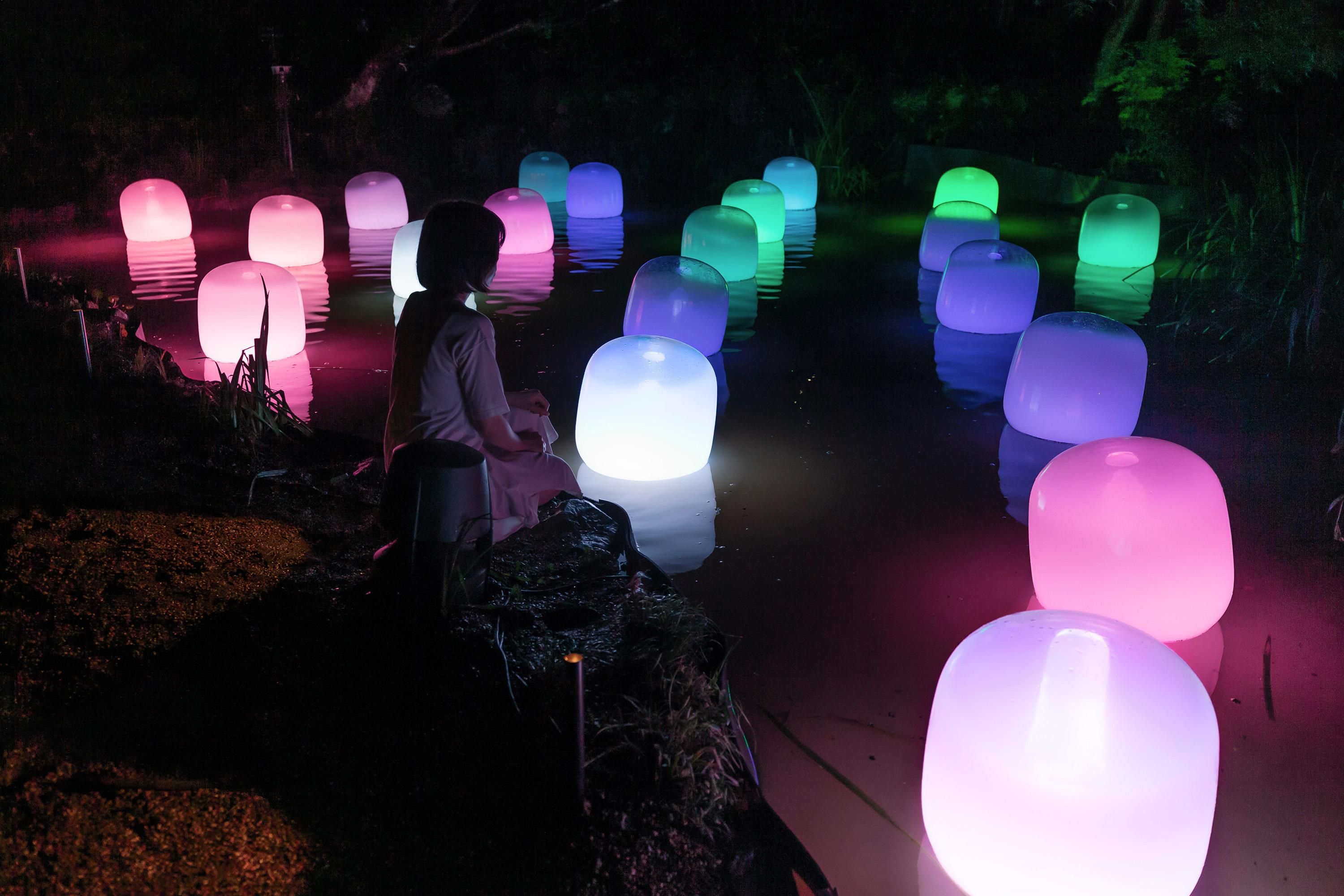 水面に浮かぶランプは、それぞれ自律し浮遊している。人がランプの近くで立ち止まっていると、もしくは風に吹かれて傾くと、強く輝き音色を響かせる。そのランプの光は、隣のランプに次々伝播し、音色を響かせながら、連続していく。伝播していく光は、必ず、全てのランプを一度だけ強く輝かせ、全てのランプに伝播する。人々はきっと、同じ空間にいる他の人々の存在を感じるだろう。