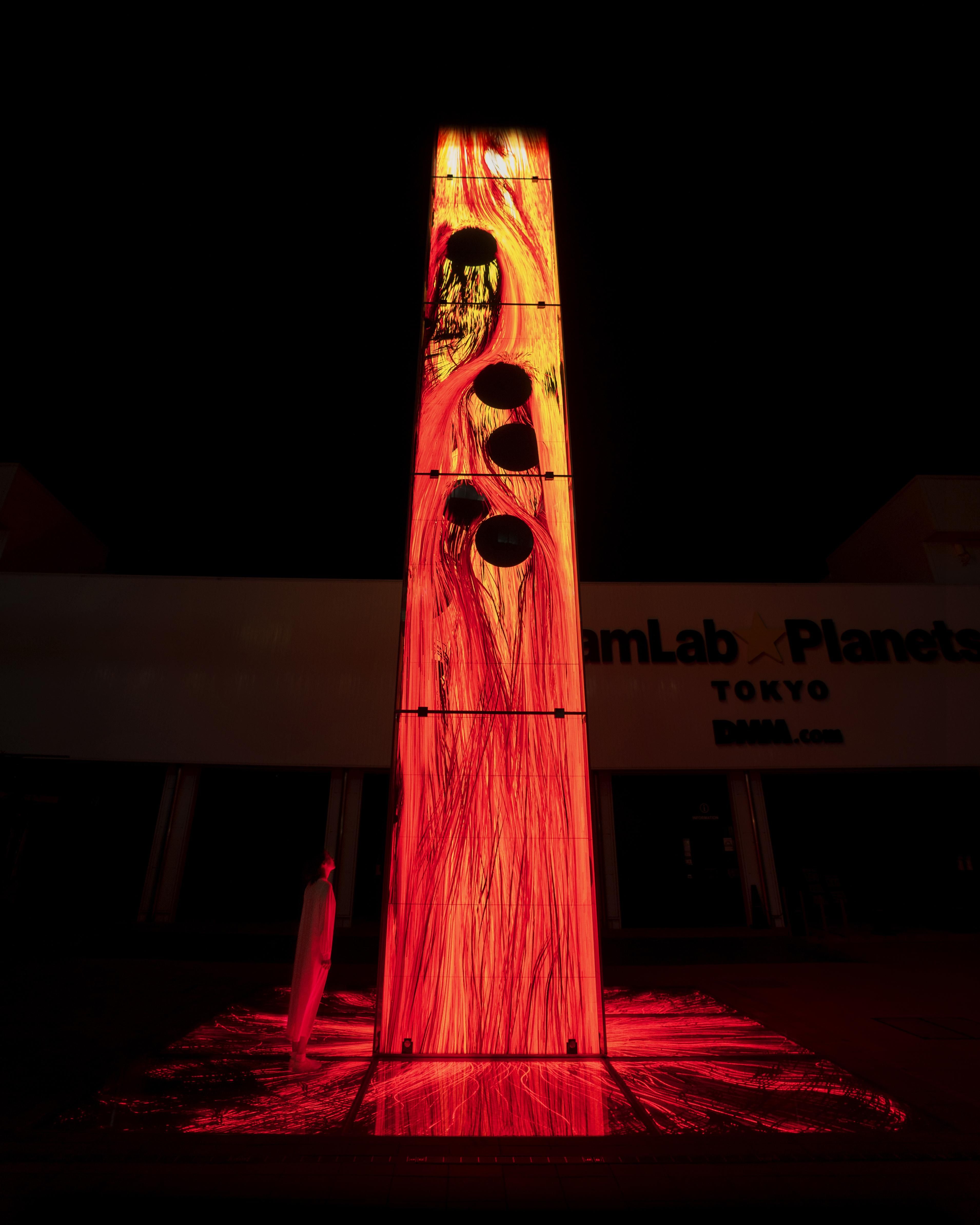 燃焼する気体の流れによって、空間上に線を描き、その線の立体的な集合で炎をつくり、チームラボが考える「超主観空間」によって平面化し、炎を描いている。
