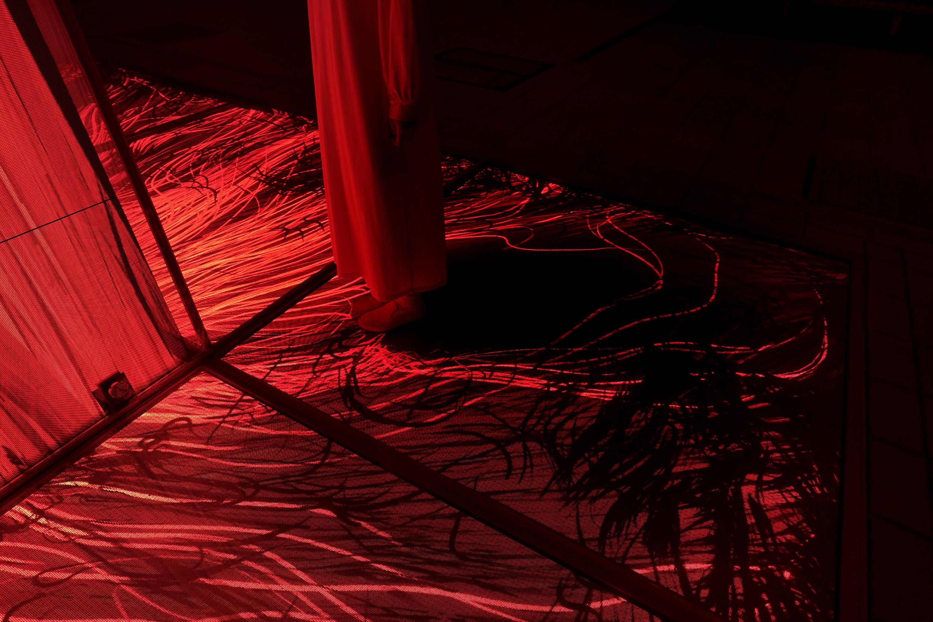 人々が作品の上に立つと、黒い絶対的な存在が生まれ、炎の形が変化していく。作品は、人々のふるまいに影響を受けながら、永遠に変化し続ける。
