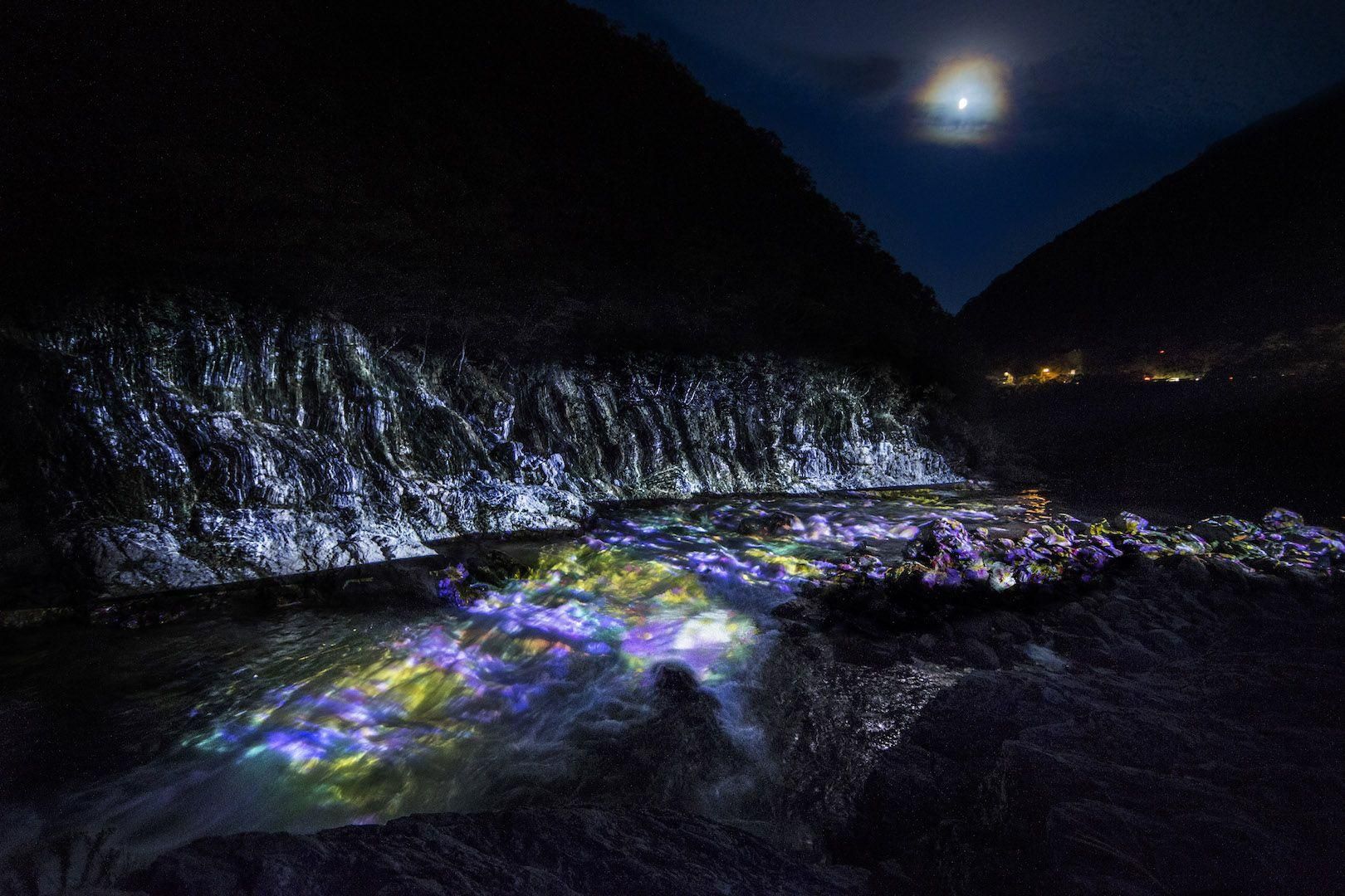 This artwork consists of a waterfall projected onto a sheer cliff, and flowers projected onto the river of Koboke gorge that flows beneath it. The world we know has been created by the powerful cycle of life, repeating endlessly on an overwhelming scale over billions of years on earth. Water is the source of life. Flowers bloom and scatter for eternity on the surface of the water as the forcefully flowing river collides with the sides of the gorge. The flowers are born, they grow, bud, bloom, and eventually scatter, wither, and fade away. In other words, the flowers go through the cycle of birth and death eternally. The waterfall falls over a cliff that has been formed over a long period of time by the strong flowing river that runs through the steep rock face of the gorge. The fall of the waterfall is physically calculated in relation to the actual cliff form onto which it is projected. The water is represented as a continuous body of hundreds of thousands of water particles. A computer calculates the movement and interaction of the particles to produce a simulation of water that flows in accordance with the laws of physics. Lines are drawn in relation to a selection of the particles, this collection of lines depicts a waterfall on the steep cliff of the gorge. This artwork is in continuous change; over a period of one hour a seasonal year of flowers blossoms and scatters. Neither a prerecorded animation nor on loop, the work is rendered in real time by a computer program. Previous visual states can never be replicated, and will never reoccur.