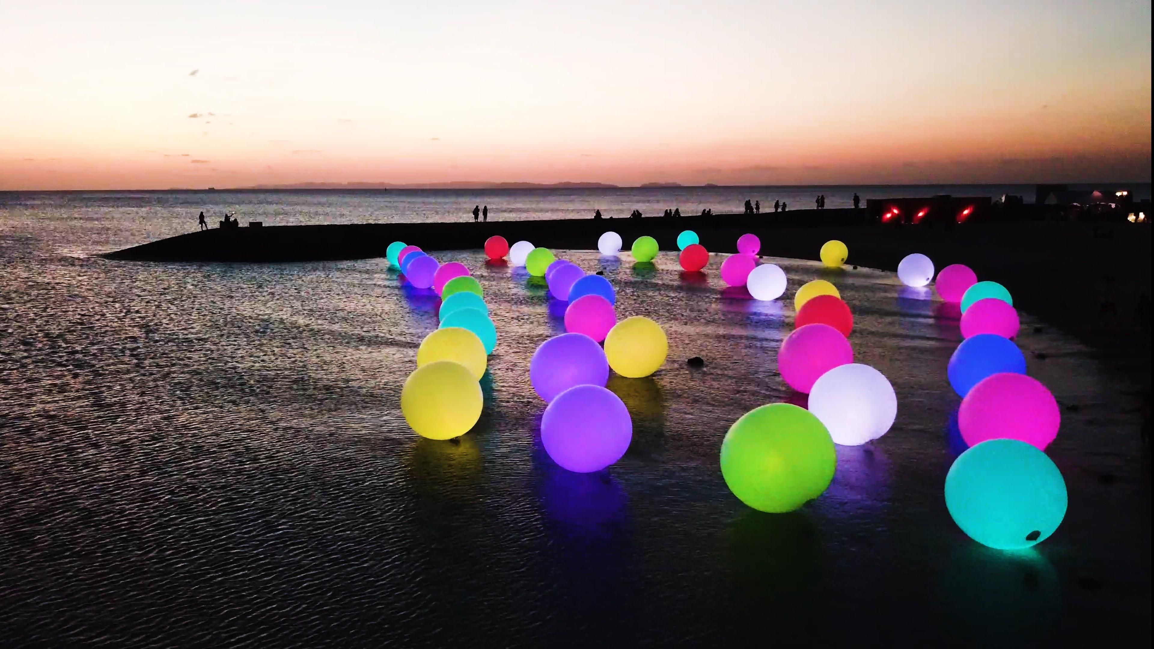The spheres of light floating on the surface of the sea are each autonomous, shining brightly, and then disappearing—as if they are softly breathing.When the spheres of light are touched by a person or receive an impact, the color of their light changes. The light color resonates to the spheres around them causing those spheres to change color, and in turn those spheres resonate the color to the spheres around them, the color resonating out continuously from one sphere to another.